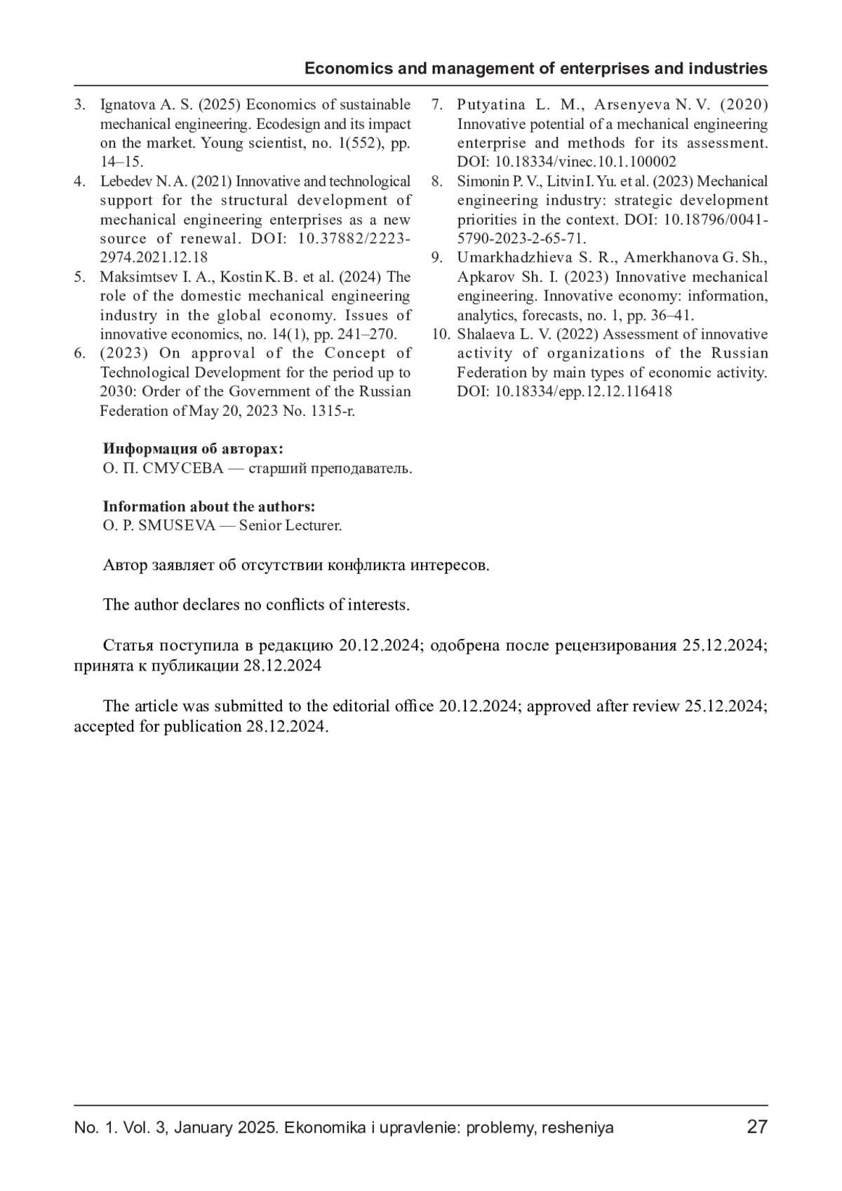 3. Игнатова А. С. Экономика устойчивого машиностроения. Экодизайн и его влияние на рынок// Молодой ученый. 2025. № 1(552). С. 14-15. EDN: BTVEFR