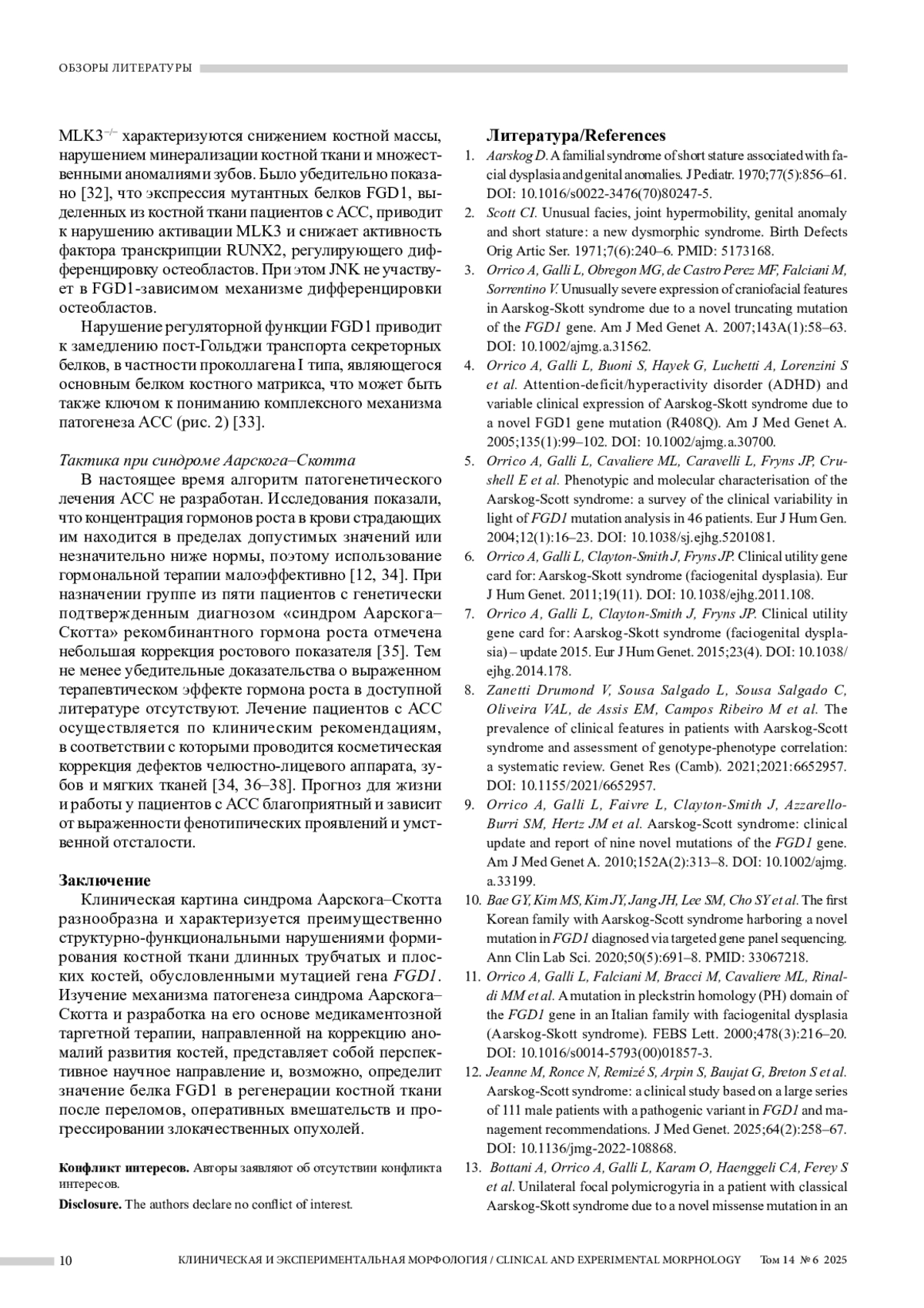 Синдром Аарскога–Скотта относится к группе редких генетических (орфанных) болезней, характеризующихся преимущественным поражением длинных трубчатых и плоских костей черепа. Проявления синдрома многообразны, среди них наиболее часто встречаются умеренная задержка роста, пороки развития урогенитальной системы, задержка умственного развития, множественные аномалии лицевого черепа. Причиной синдрома Аарскога–Скотта являются мутации гена FGD1, расположенного в Х-хромосоме, что определяет высокий риск развития патологии у лиц мужского пола. Ген FGD1 кодирует одноименный белок, который функционирует как фактор обмена гуаниновых нуклеотидов и служит специфическим активатором ГТФазы CDC42. Через свой основной эффектор CDC42 FGD1 регулирует множество клеточных процессов, включая экспрессию генов, клеточную дифференцировку, поляризацию клеток, транспорт белков и организацию внутриклеточного цитоскелета. Цель обзора – представить данные об этиологии, патогенезе, разнообразии клинических проявлений синдрома, предполагаемых механизмах патогенеза. Наряду с этим освещены важные аспекты, связанные с этой редкой генетической болезнью.