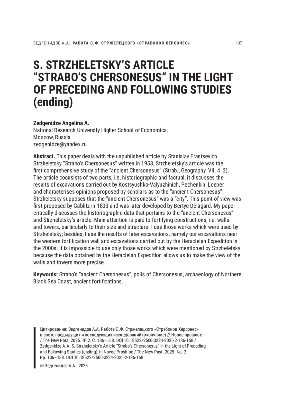 72. Zedgenidze A.A. “Drevnii Khersones” Strabona. Rezul’taty issledovanii 1985-1990 gg. [Strabo’s “ancient Chersonesus”. Results of excavations in 1985-1999], in Vestnik drevney istorii. 2016. No. 76/3. Pp. 597-625 (in Russian).