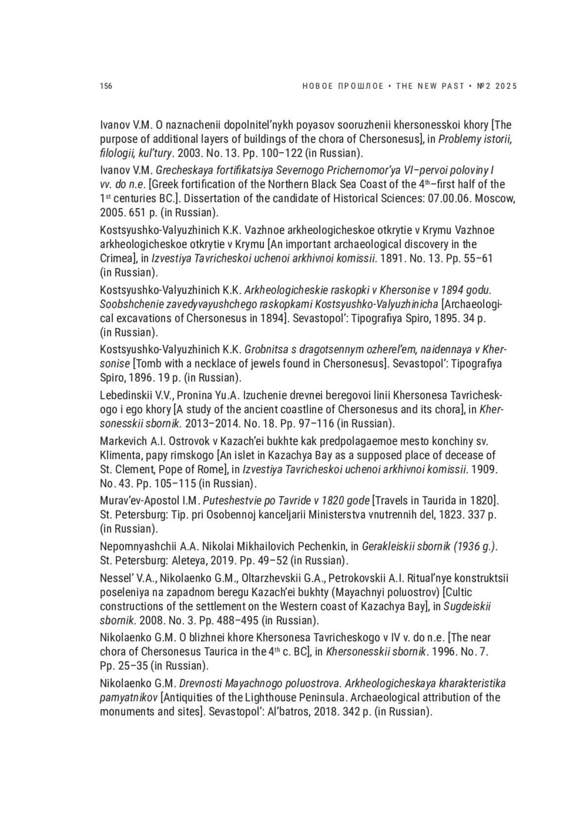 92. Pechenkin N.M. Arkheologicheskaya razvedka v mestnosti Strabonovskogo drevnego Khersonesa. Raboty 1910-1911 gg. [Archaeological reconnaissance on the site of Strabo’s ancient Chersonesus. Works of 1910-1911], in Arkheologicheskie trudy N.M. Pechenkina. St. Petersburg: Aleteya, 2020a. Pp. 134-170 (in Russian).