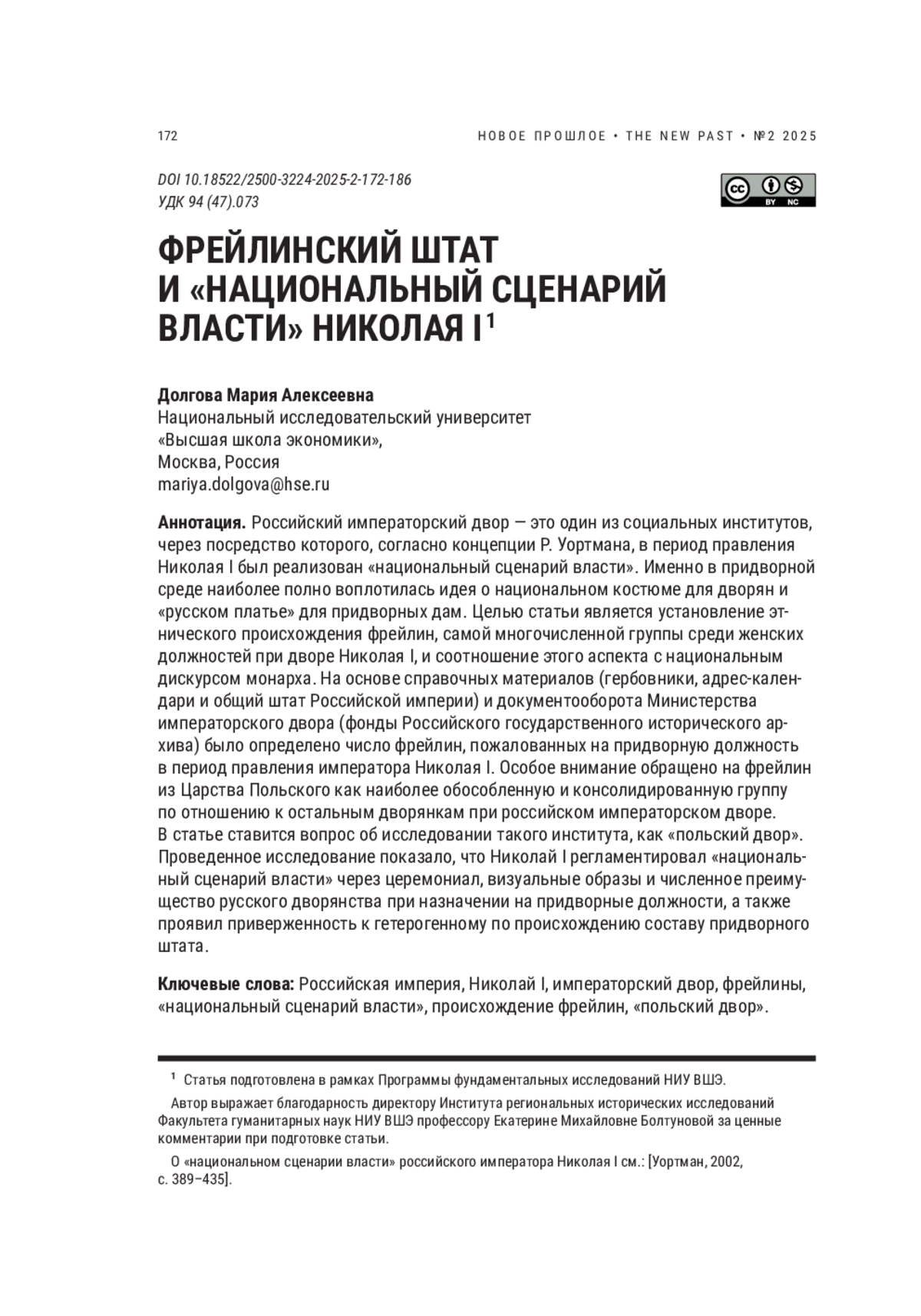 Российский императорский двор — это один из социальных институтов, через посредство которого, согласно концепции Р. Уортмана, в период правления Николая I был реализован «национальный сценарий власти». Именно в придворной среде наиболее полно воплотилась идея о национальном костюме для дворян и «русском платье» для придворных дам. Целью статьи является установление этнического происхождения фрейлин, самой многочисленной группы среди женских должностей при дворе Николая I, и соотношение этого аспекта с национальным дискурсом монарха. На основе справочных материалов (гербовники, адрес-календари и общий штат Российской империи) и документооборота Министерства императорского двора (фонды Российского государственного исторического архива) было определено число фрейлин, пожалованных на придворную должность в период правления императора Николая I. Особое внимание обращено на фрейлин из Царства Польского как наиболее обособленную и консолидированную группу по отношению к остальным дворянкам при российском императорском дворе. В статье ставится вопрос об исследовании такого института, как «польский двор». Проведенное исследование показало, что Николай I регламентировал «национальный сценарий власти» через церемониал, визуальные образы и численное преимущество русского дворянства при назначении на придворные должности, а также проявил приверженность к гетерогенному по происхождению составу придворного штата.
