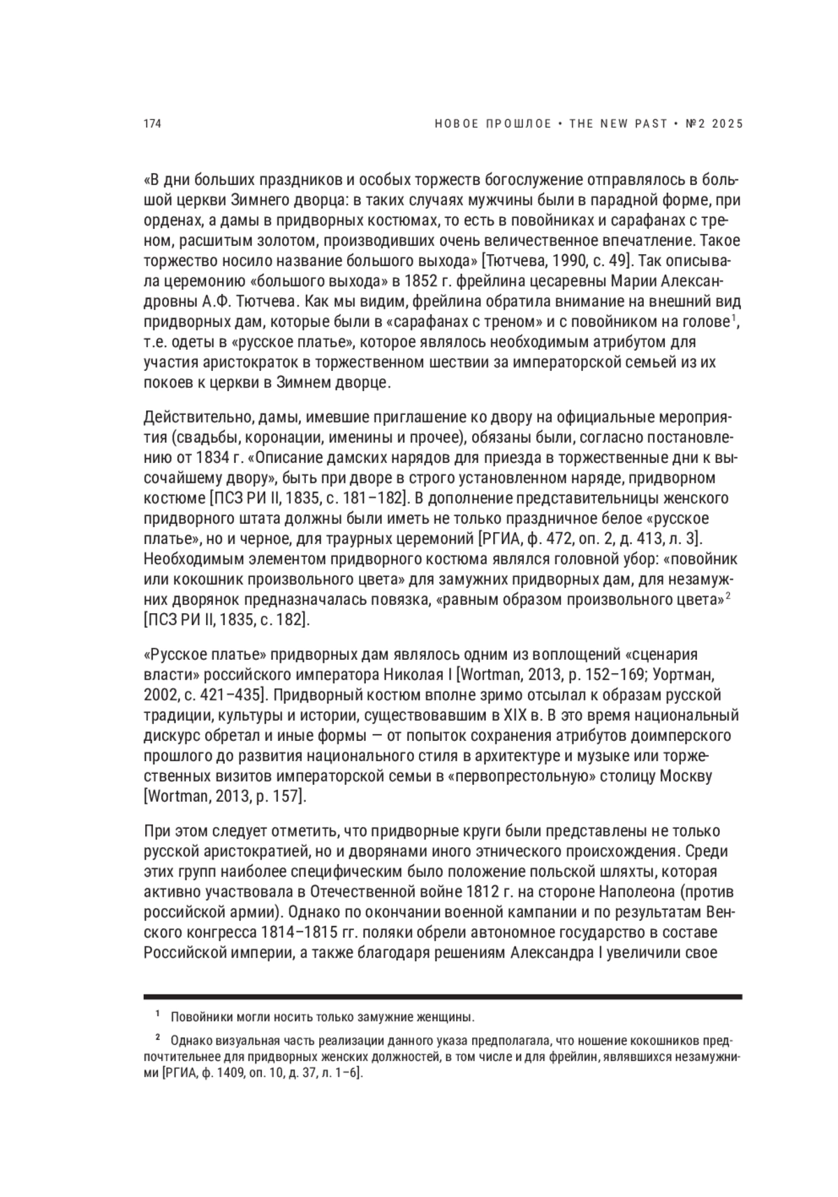 «В дни больших праздников и особых торжеств богослужение отправлялось в большой церкви Зимнего дворца: в таких случаях мужчины были в парадной форме, при орденах, а дамы в придворных костюмах, то есть в повойниках и сарафанах c треном, расшитым золотом, производивших очень величественное впечатление. Такое торжество носило название большого выхода» [Тютчева, 1990, с. 49]. Так описывала церемонию «большого выхода» в 1852 г. фрейлина цесаревны Марии Александровны А. Ф. Тютчева. Как мы видим, фрейлина обратила внимание на внешний вид придворных дам, которые были в «сарафанах с треном» и с повойником на голове 1, т. е. одеты в «русское платье», которое являлось необходимым атрибутом для участия аристократок в торжественном шествии за императорской семьей из их покоев к церкви в Зимнем дворце.