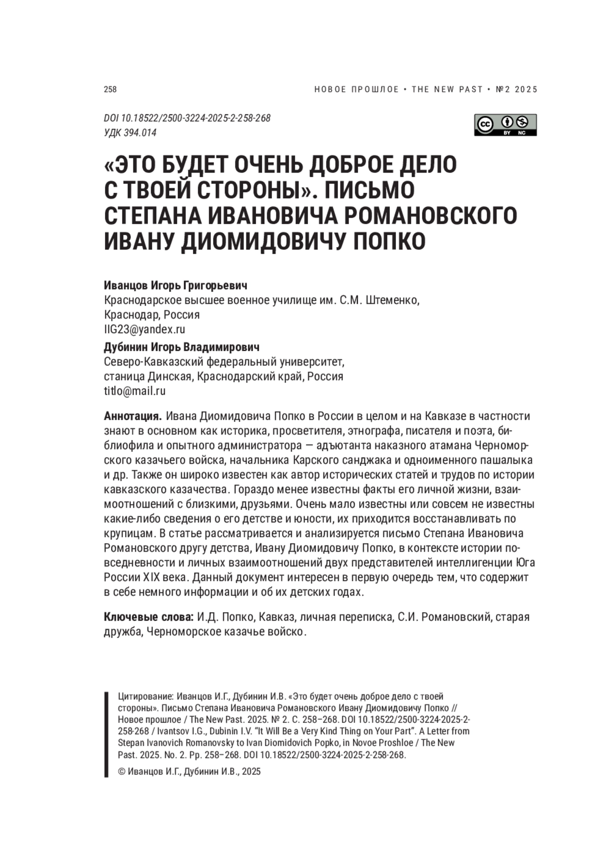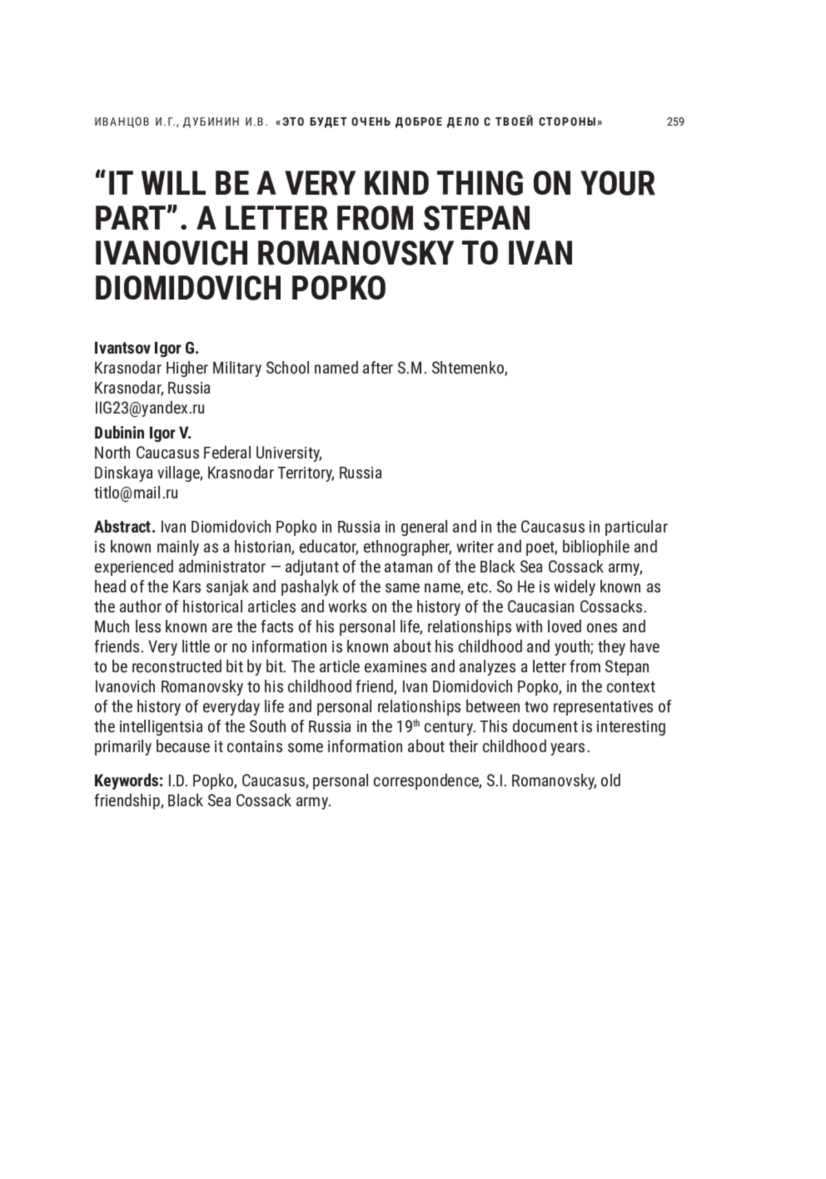 Ивана Диомидовича Попко в России в целом и на Кавказе в частности знают в основном как историка, просветителя, этнографа, писателя и поэта, библиофила и опытного администратора — адъютанта наказного атамана Черноморского казачьего войска, начальника Карского санджака и одноименного пашалыка и др. Также он широко известен как автор исторических статей и трудов по истории кавказского казачества. Гораздо менее известны факты его личной жизни, взаимоотношений с близкими, друзьями. Очень мало известны или совсем не известны какие-либо сведения о его детстве и юности, их приходится восстанавливать по крупицам. В статье рассматривается и анализируется письмо Степана Ивановича Романовского другу детства, Ивану Диомидовичу Попко, в контексте истории повседневности и личных взаимоотношений двух представителей интеллигенции Юга России XIX века. Данный документ интересен в первую очередь тем, что содержит в себе немного информации и об их детских годах