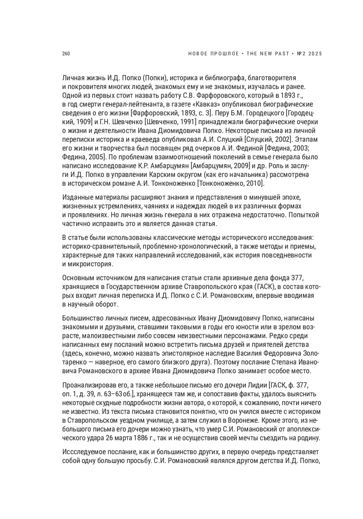 Личная жизнь И. Д. Попко (Попки), историка и библиографа, благотворителя и покровителя многих людей, знакомых ему и не знакомых, изучалась и ранее. Одной из первых стоит назвать работу С. В. Фарфоровского, который в 1893 г., в год смерти генерал-лейтенанта, в газете «Кавказ» опубликовал биографические сведения о его жизни [Фарфоровский, 1893, с. 3]. Перу Б. М. Городецкого [Городецкий, 1909] и Г. Н. Шевченко [Шевченко, 1991] принадлежали биографические очерки о жизни и деятельности Ивана Диомидовича Попко. Некоторые письма из личной переписки историка и краеведа опубликовал А. И. Слуцкий [Слуцкий, 2002]. Этапам его жизни и творчества был посвящен ряд очерков А. И. Фединой [Федина, 2003; Федина, 2005]. По проблемам взаимоотношений поколений в семье генерала было написано исследование К. Р. Амбарцумян [Амбарцумян, 2009] и др. Роль и заслуги И. Д. Попко в управлении Карским округом (как его начальника) рассмотрена в историческом романе А. И. Тонконоженко [Тонконоженко, 2010].