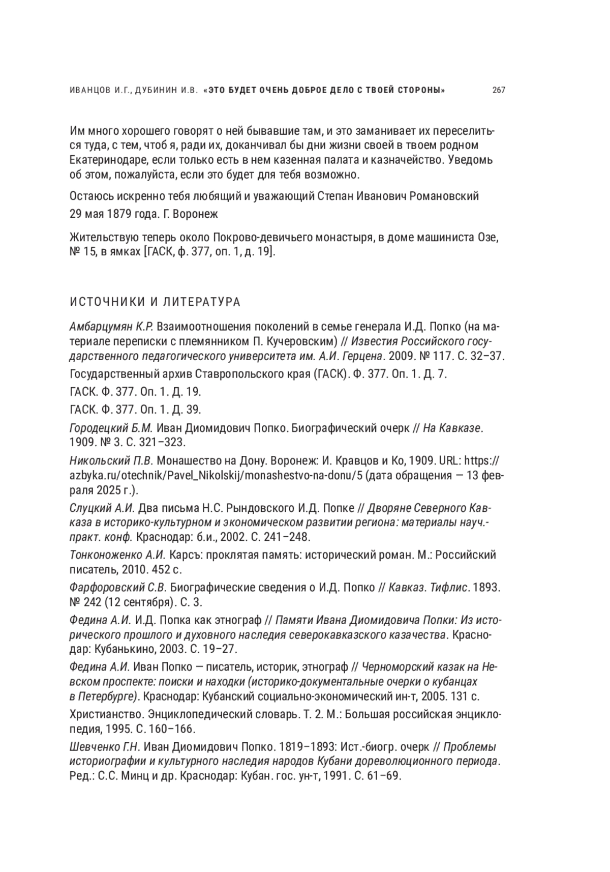 1. Амбарцумян К.Р. Взаимоотношения поколений в семье генерала И.Д. Попко (на материале переписки с племянником П. Кучеровским) // Известия Российского государственного педагогического университета им. А.И. Герцена. 2009. № 117. С. 32-37. EDN: KVATOP