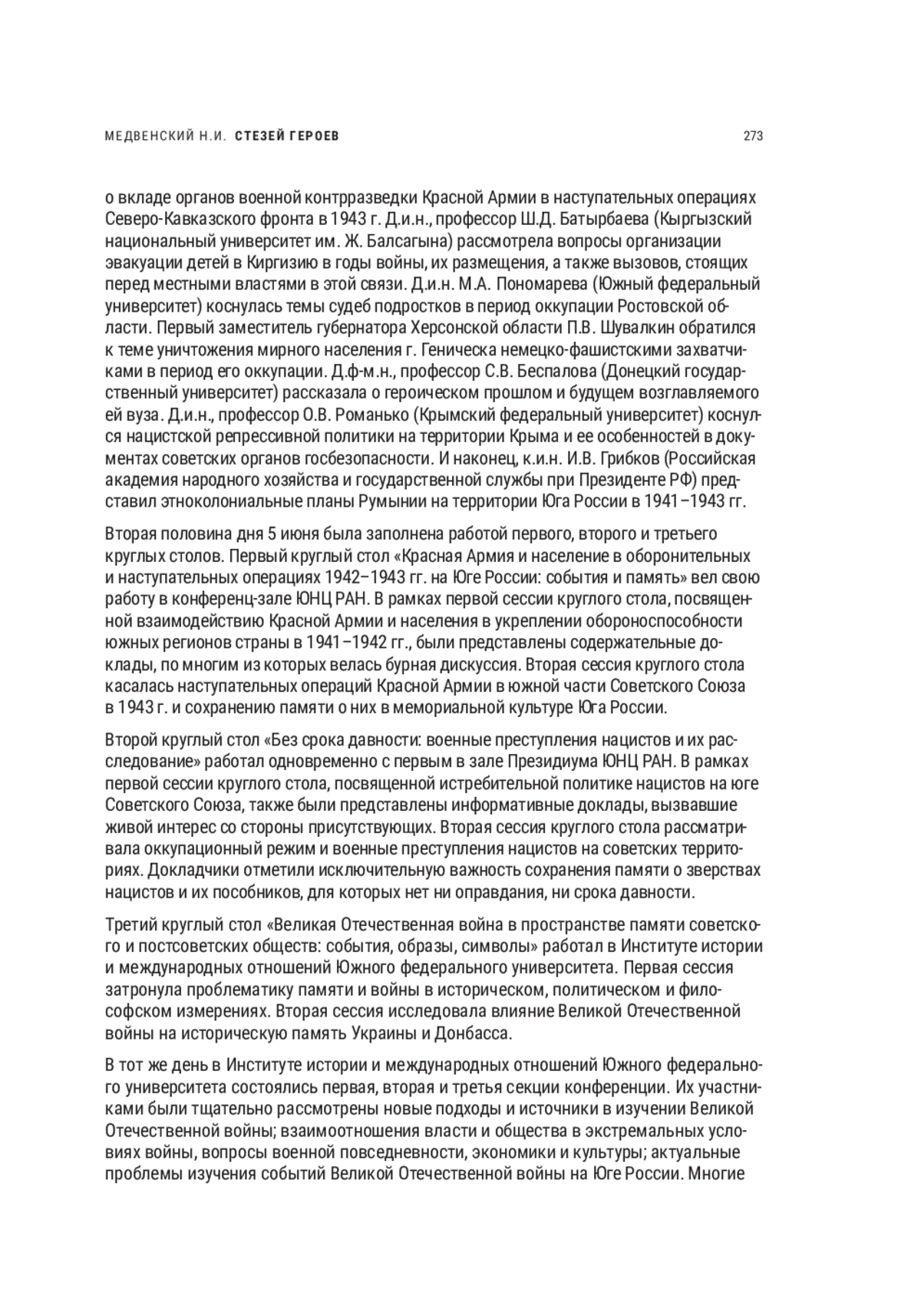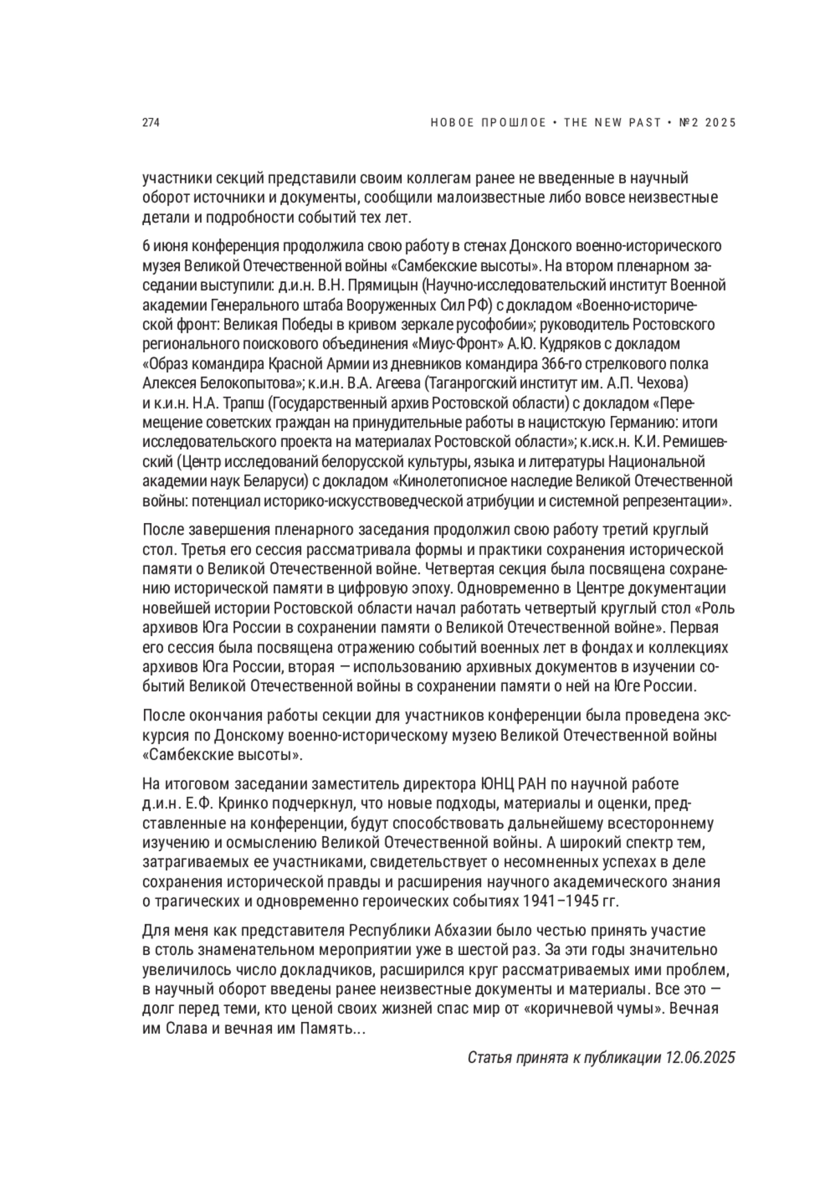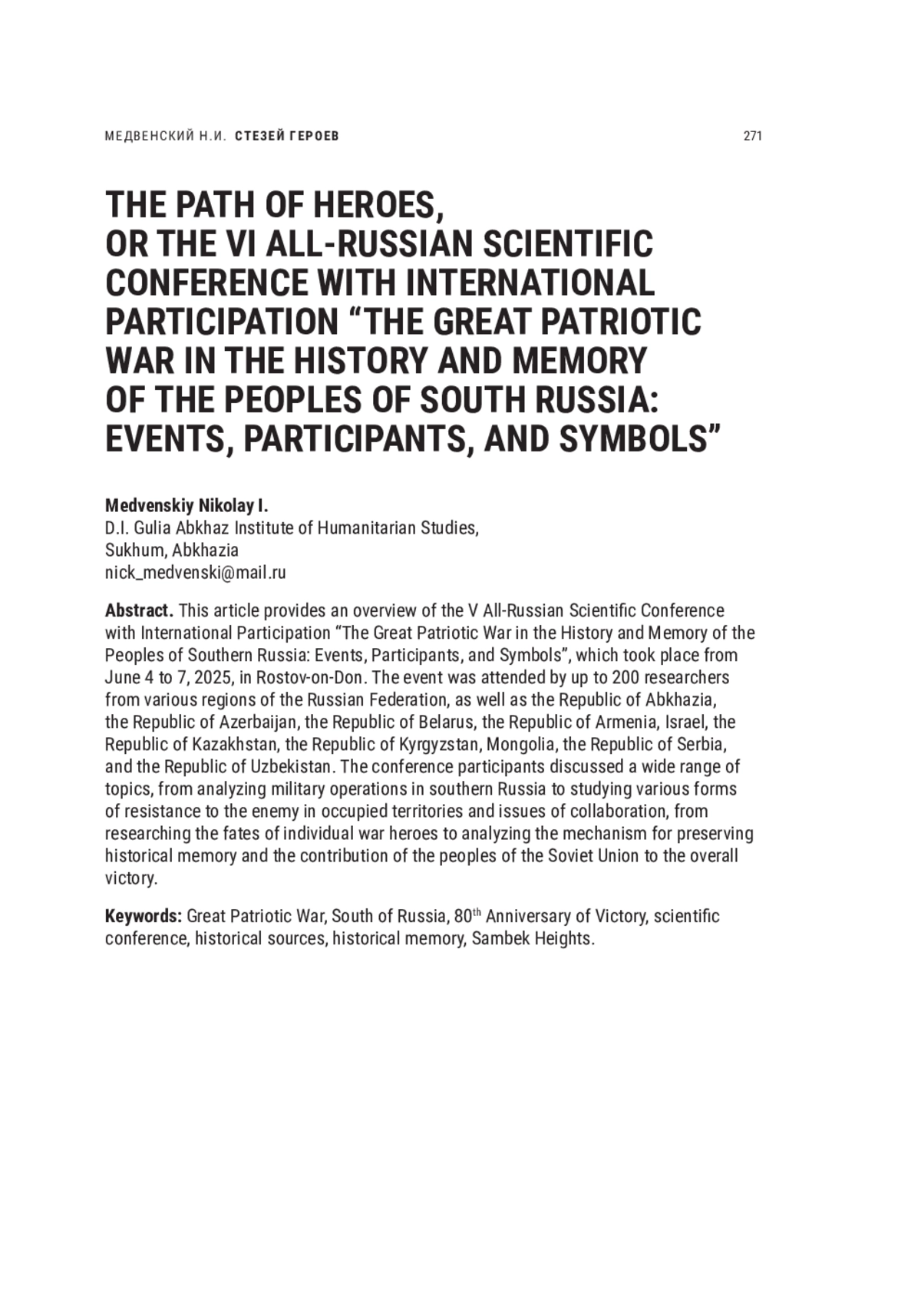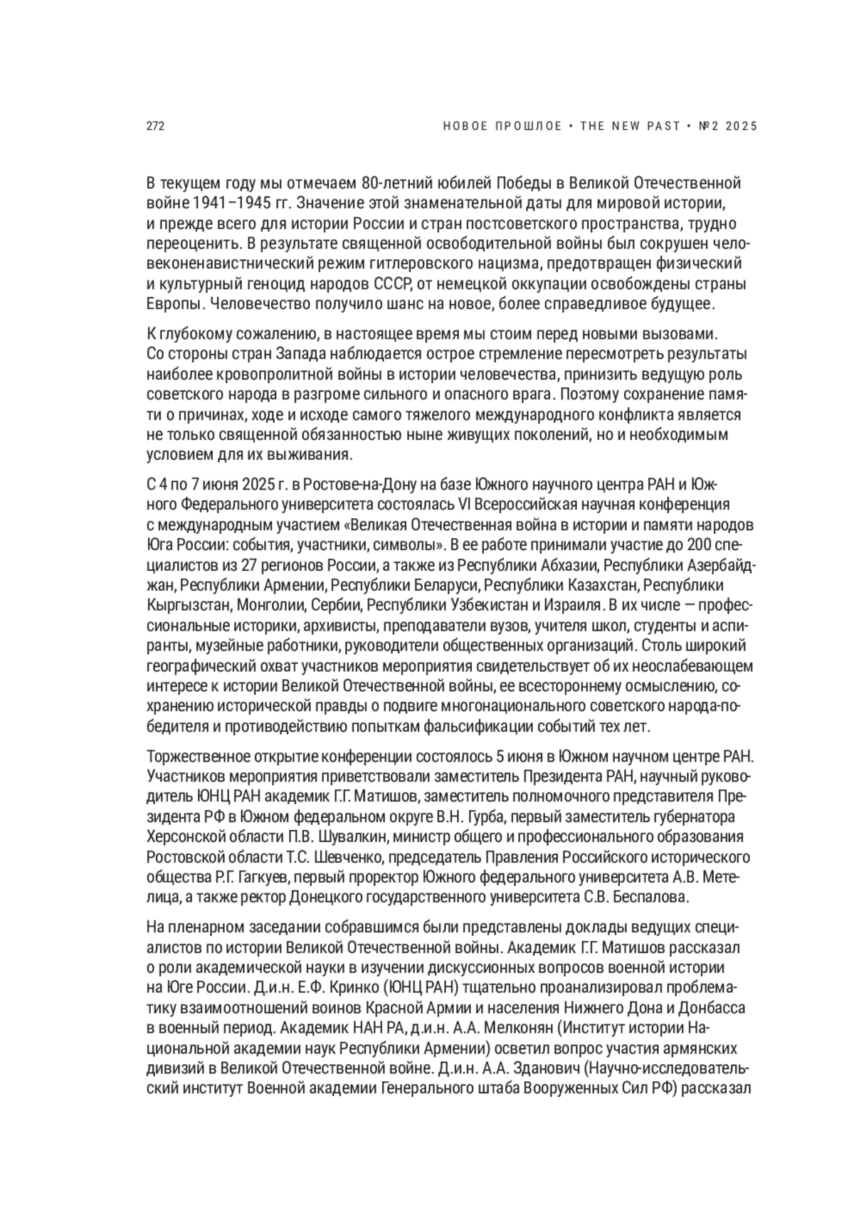 Данная статья представляет собой обзор V Всероссийской научной конференции с международным участием «Великая Отечественная война в истории и памяти народов Юга России: события, участники, символы», прошедшей с 4 по 7 июня 2025 г. в Ростове-на-Дону. В мероприятии приняли участие до 200 исследователей из различных регионов Российской Федерации, а также Республики Абхазии, Республики Азербайджан, Республики Беларуси, Республики Армении, Израиля, Республики Казахстан, Республики Кыргызстан, Монголии, Республики Сербии и Республики Узбекистан. Участники конференции обсудили широкий спектр тем: от анализа боевых операций на Юге России до изучения разных форм сопротивления врагу на оккупированных территориях и вопросов коллаборационизма, от исследования судеб отдельных героев войны до анализа механизма сохранения исторической памяти и вкладе народов Советского Союза в общую Победу.
