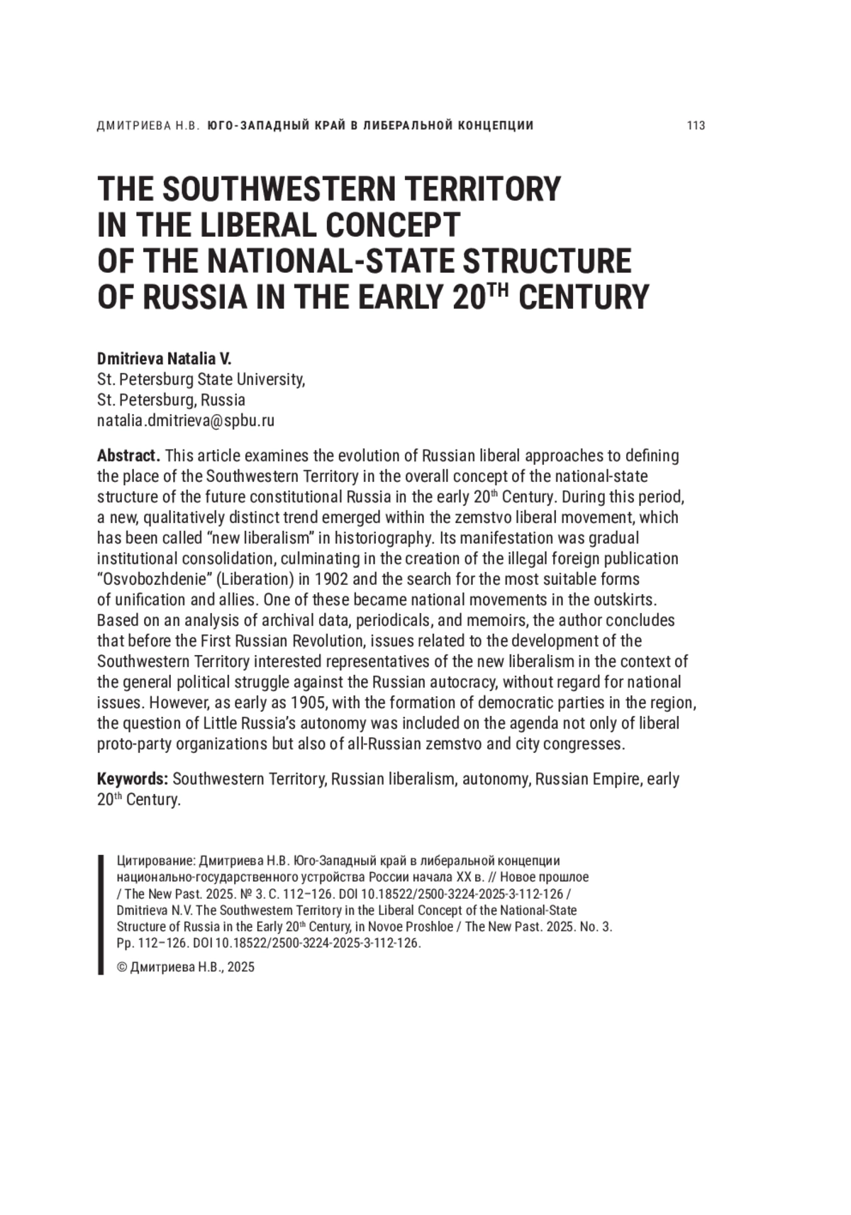 ДМИТРИЕВА Н. В. ЮГО-ЗАПАДНЫЙ КРАЙ В ЛИБЕРАЛЬНОЙ КОНЦЕПЦИИ НАЦИОНАЛЬНО-ГОСУДАРСТВЕННОГО УСТРОЙСТВА РОССИИ НАЧАЛА XX В // НОВОЕ ПРОШЛОЕ. 2025. № 3