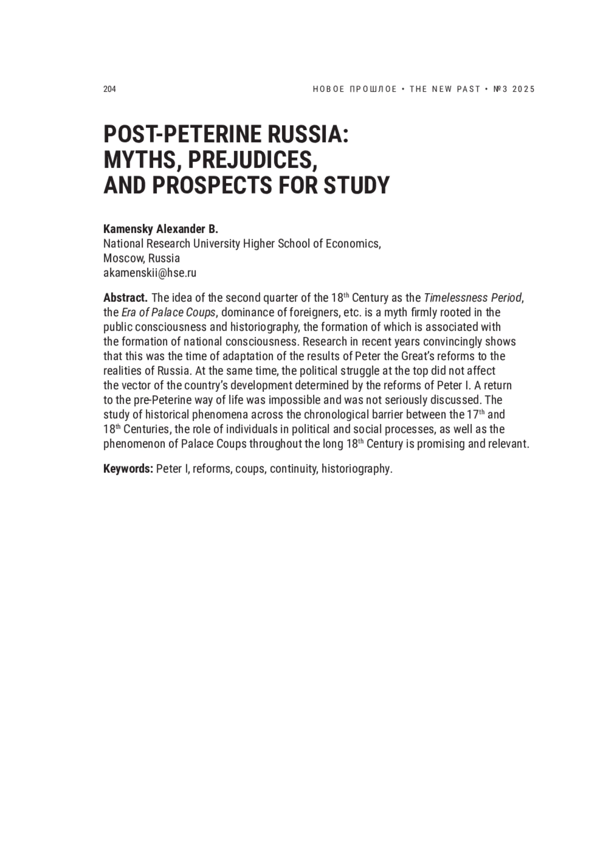 Тема «наследия Петра» стала актуальна как для политического дискурса России после смерти реформатора, так и для формирования дальнейшего политического курса как такового. Если идеологическая составляющая начинает особенно сфокусировано проявлять себя с момента прихода к власти Елизаветы Петровны и именно в ее царствование обретает содержательную полноту, то текущие проблемы побуждают преемников первого императора определиться по отношению к его преобразованиям буквально с первых дней «жизни без Петра». Выражая солидарность с выводами ряда современных историков, автор оценивает постпетровский период истории России как, в целом, продолжение его начинаний, лишь избавленных от одиозных крайностей. При этом отмечается, что сам концепт «петровского наследия», уйдя из актуальной политической повестки к рубежу XVIII — XIX вв. в сферу различных форм национальных коммемораций, по-разному воспринимался и воспринимается в научном историческом знании и в общественном сознании большинства. Если историография преодолела многие мифы о постпетровской России, то в общественно-политическом дискурсе они живут в формах, восходящих еще к временам елизаветинской пропаганды. Оставляя вопрос о связях двух форм исторического знания (научном и массовом) для отдельной дискуссии, автор отмечает необходимость более глубокого изучения базовых составляющих социально-экономической и культурной жизни России XVIII в., необходимость разворота исследовательских усилий от «страстей у трона» к процессам, протекавшим «на земле», с учетом их разнородности, определяемой региональной и социальной неоднородностью империи. По мнению автора, именно на базе такого нового эмпирического знания возможно корректное построение новых обобщающих концепций отечественной истории этой эпохи