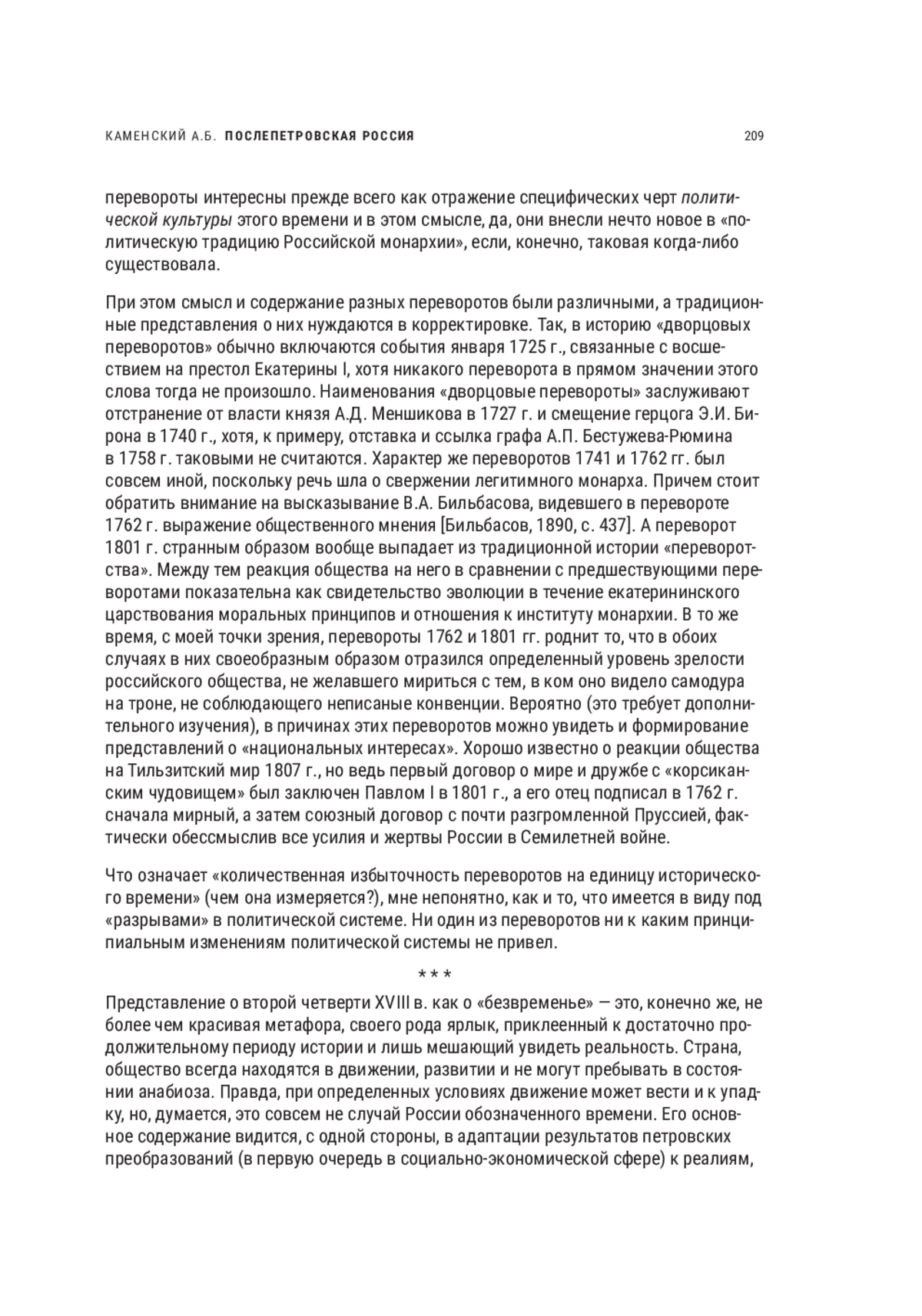 В оценке послепетровской эпохи автор заостряет внимание на основаниях исторического движения России — самодержавии и империи. Истоки дворцовых переворотов предлагается искать в сущности самого самодержавия, вышедшего из правового поля в период правления Петра I. Отказываясь считать 1725–1762 гг. «безвременьем», автор обращает внимание на расцвет бюрократии, порожденной петровскими реформами. Отмечается искусственность разделения политической элиты, оказавшейся во главе имперского правительства после смерти Петра I, на сторонников и противников его реформ. Констатируется, что ревизии подверглись прежде всего заимствованные на Западе камералистские принципы государственного строительства, не работавшие в условиях России. Ставится под сомнение бифуркационное значение попытки Верховного тайного совета ограничить самодержавие в 1730 г. Решать принципиальные вопросы о пределах самодержавной власти в России «верховники» и представители дворянского движения были не готовы. С другой стороны, сформулированные тогда дворянством социальные запросы оказали влияние на последующий внутриполитический курс Анны Иоанновны и послужили катализатором эмансипации сословия. По мнению автора, личность этой императрицы, без которой не было бы «Петербургского периода» русской культуры, нуждается в переоценке