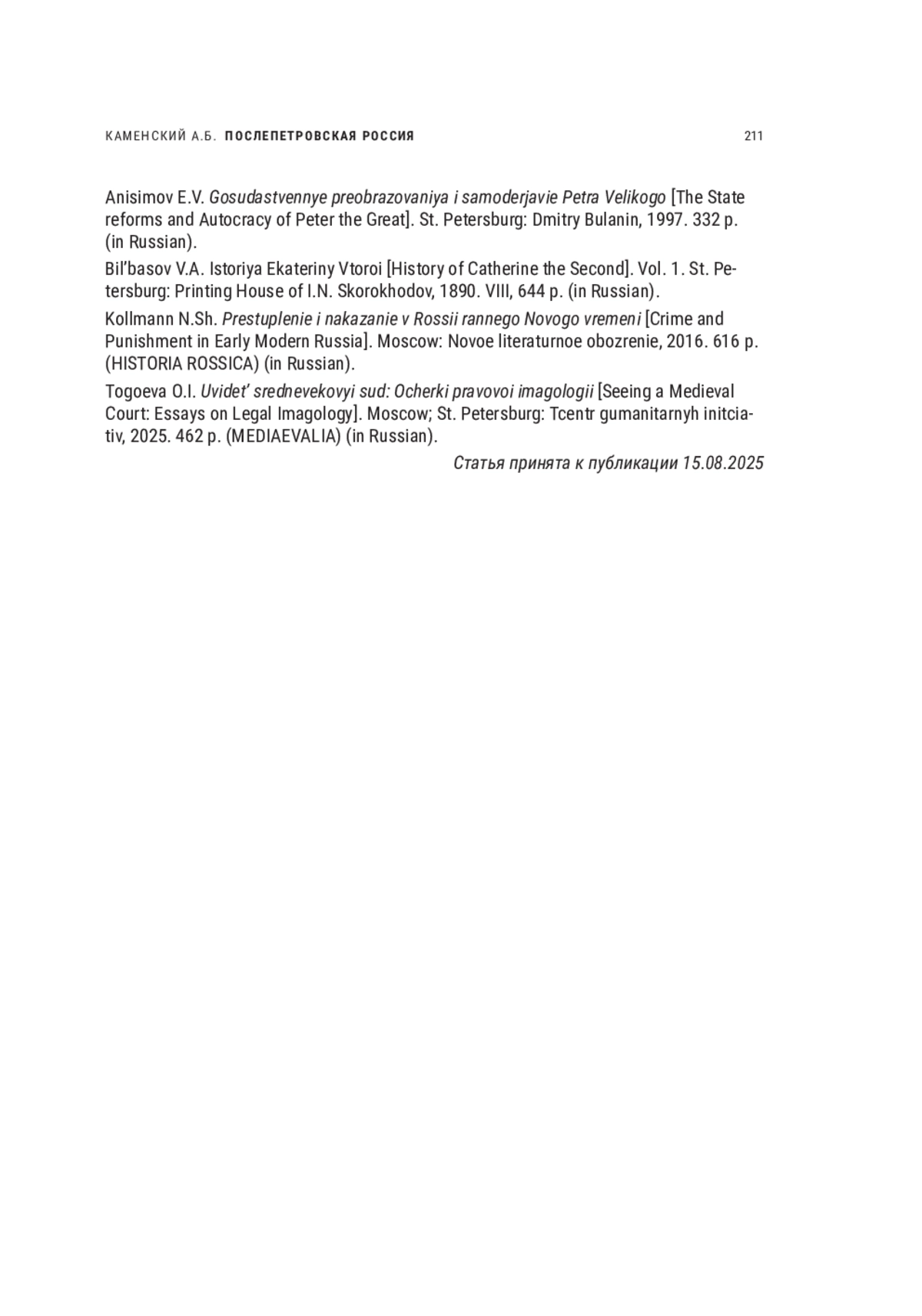 9. Kollmann N.Sh. Prestuplenie i nakazanie v Rossii rannego Novogo vremeni [Crime and Punishment in Early Modern Russia]. Moscow: Novoe literaturnoe obozrenie, 2016. 616 p. (HISTORIA ROSSICA) (in Russian).