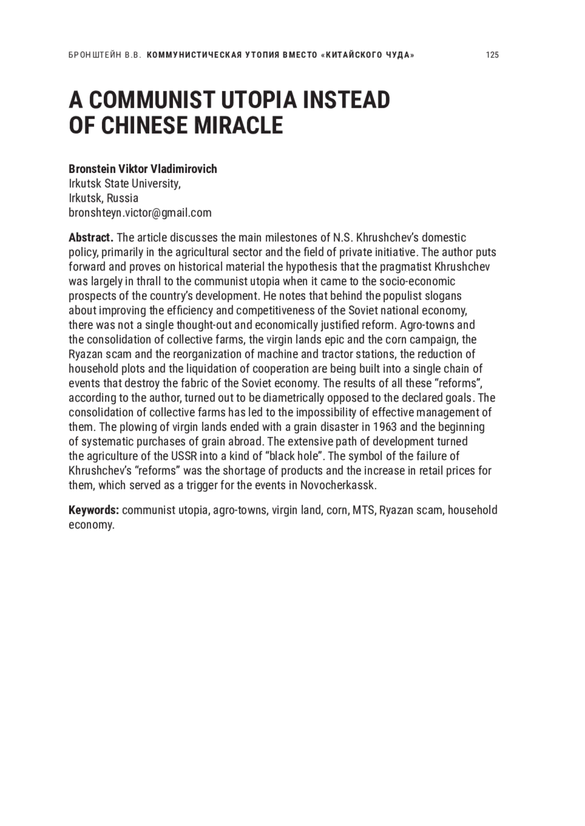 БРОНШТЕЙН В. В. КОММУНИСТИЧЕСКАЯ УТОПИЯ ВМЕСТО "КИТАЙСКОГО ЧУДА" // НОВОЕ ПРОШЛОЕ. 2024. № 1