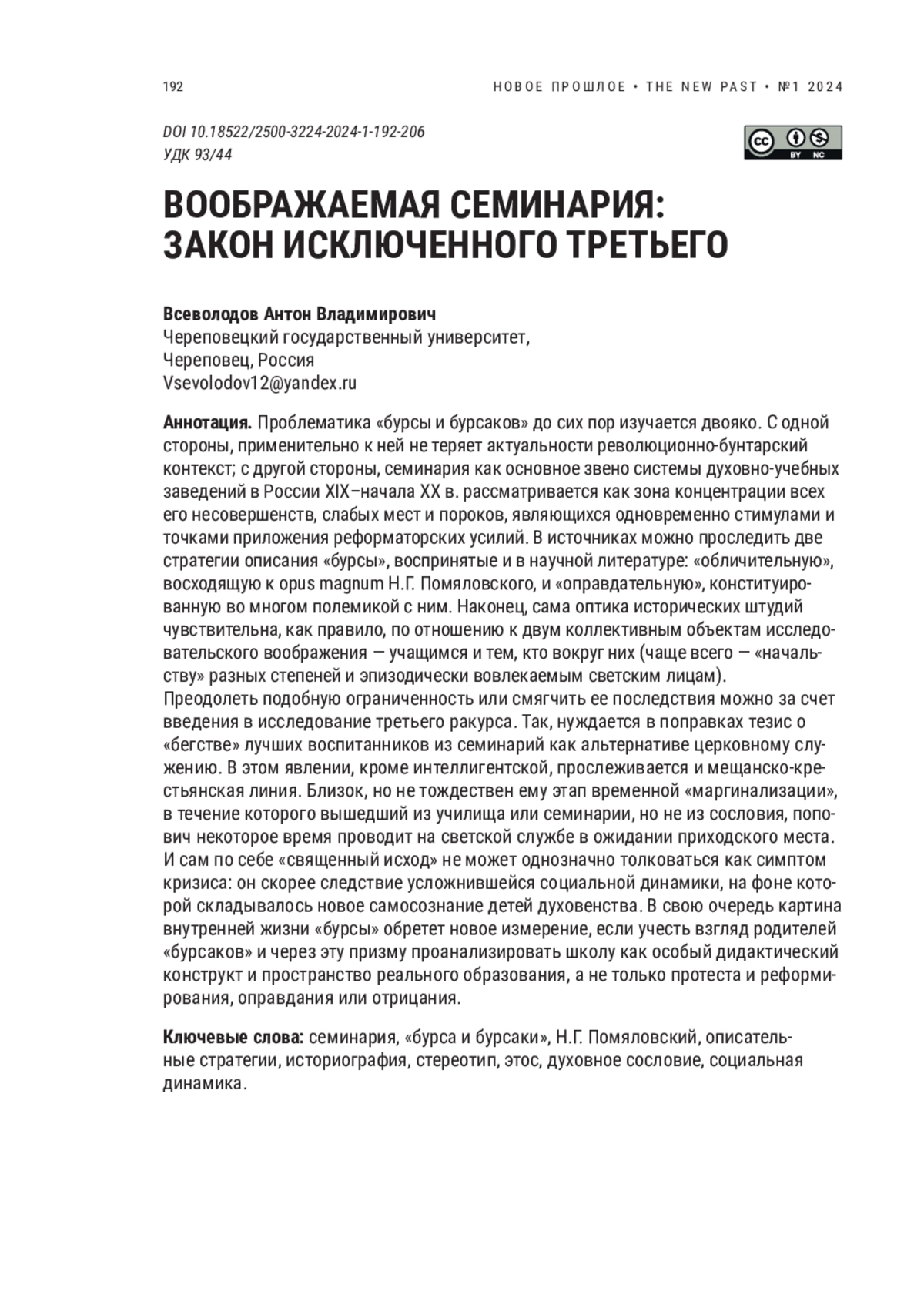 Семинарист, бурсак, попович — в контексте XIX в. понятие многозначное. С одной стороны, оно означало принадлежность к известной сословной категории или подчеркивало ученический статус молодого человека, обучающегося в духовной семинарии, с другой — презентовало некий собирательный образ, по преимуществу отрицательный, который к началу XX в. приобрел черты в полном смысле расхристанного бунтаря. В данной статье на основе анализа мемуаров известных литераторов и экс-семинаристов, литературных произведений и публицистики XIX в., а также ряда законодательных документов показано поэтапное формирование представлений современников об учениках духовных школ России, изъяны организации в них учебно-воспитательного процесса и их проявления в отклоняющемся поведении юношества из духовного сословия. Методологические подходы социальной истории позволили проследить формирование неразрешимого противоречия между социальной ролью наставника, пастыря, духовного отца, к которому должна была готовить духовная школа, и конфликтующим с окружающей средой семинаристом, находившимся в оппозиции к базовым установкам и принципам той образовательной среды, в которой он существовал. В заключение отмечено, что в рассматриваемый период обозначилась устойчивая тенденция обособления сообщества семинаристов в субкультурную группу, на которой лежала печать отверженности, что нашло продолжение в зарождении их «новой» веры — веры в созидающую силу революции