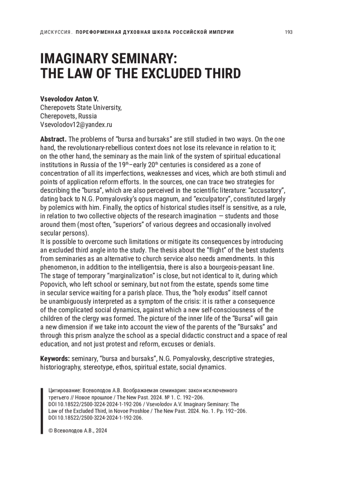 Проблематика «бурсы и бурсаков» до сих пор изучается двояко. С одной стороны, применительно к ней не теряет актуальности революционно-бунтарский контекст; с другой стороны, семинария как основное звено системы духовно-учебных заведений в России XIX–начала XXǾв. рассматривается как зона концентрации всех его несовершенств, слабых мест и пороков, являющихся одновременно стимулами и точками приложения реформаторских усилий. В источниках можно проследить две стратегии описания «бурсы», воспринятые и в научной литературе: «обличительную», восходящую к opus magnum Н. Г.ǾПомяловского, и «оправдательную», конституированную во многом полемикой с ним. Наконец, сама оптика исторических штудий чувствительна, как правило, по отношению к двум коллективным объектам исследовательского воображенияǾ— учащимся и тем, кто вокруг них (чаще всего — «начальству» разных степеней и эпизодически вовлекаемым светским лицам). Преодолеть подобную ограниченность или смягчить ее последствия можно за счет введения в исследование третьего ракурса. Так, нуждается в поправках тезис о «бегстве» лучших воспитанников из семинарий как альтернативе церковному служению. В этом явлении, кроме интеллигентской, прослеживается и мещанско-крестьянская линия. Близок, но не тождествен ему этап временной «маргинализации», в течение которого вышедший из училища или семинарии, но не из сословия, попович некоторое время проводит на светской службе в ожидании приходского места. И сам по себе «священный исход» не может однозначно толковаться как симптом кризиса: он скорее следствие усложнившейся социальной динамики, на фоне которой складывалось новое самосознание детей духовенства. В свою очередь картина внутренней жизни «бурсы» обретет новое измерение, если учесть взгляд родителей «бурсаков» и через эту призму проанализировать школу как особый дидактический конструкт и пространство реального образования, а не только протеста и реформирования, оправдания или отрицания