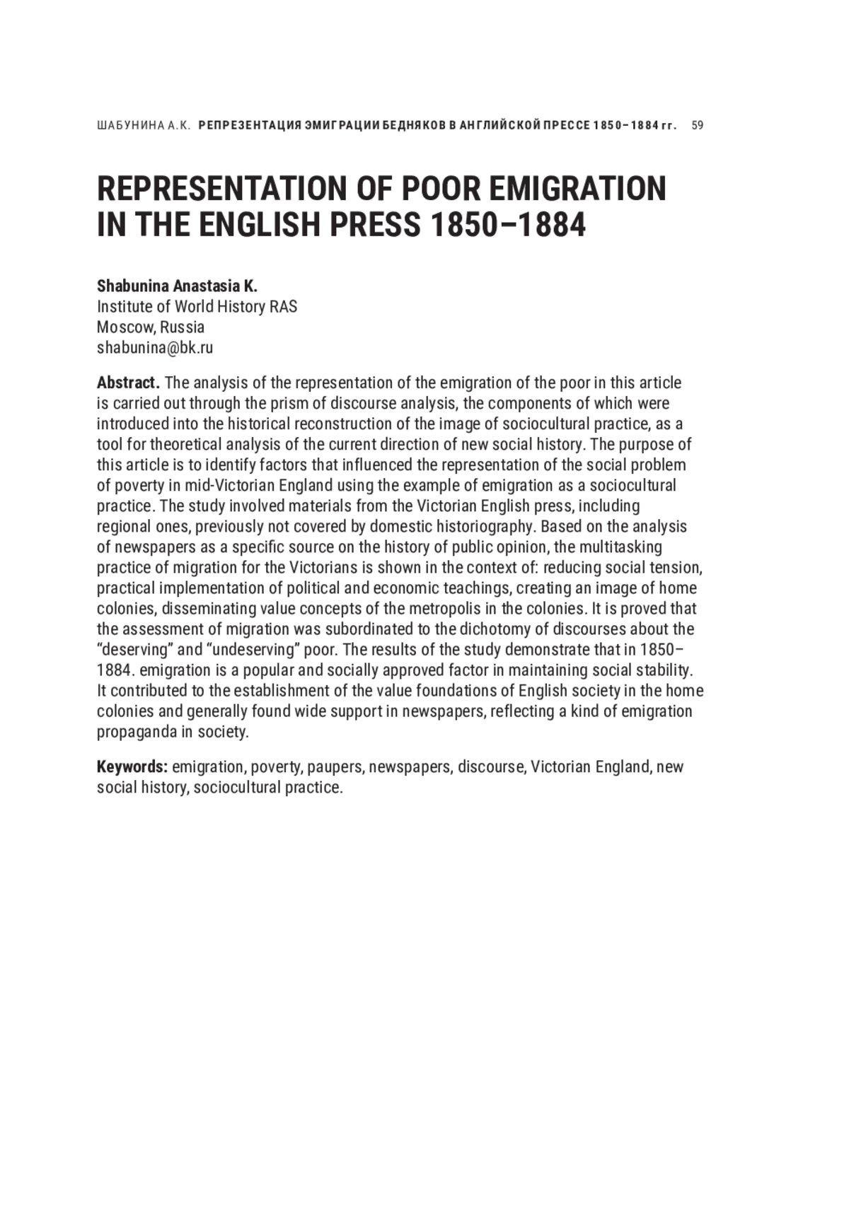 Крупные миграционные процессы и связанные с ними социальные последствия традиционно находятся в фокусе гуманитарных исследований. В рамках современной парадигмы исторического знания эмиграция как многофакторная социальная практика не только позволяет рассмотреть вопросы экономических, социальных и политических следствий миграции, но и допускает реконструкцию специфики культурного восприятия и поведенческого императива современников. Целью исследования, отраженного в материалах данной статьи, становится рассмотрение факторов, которые влияли на репрезентацию социальной проблемы бедности средневикторианской Англии, на примере эмиграции как отдельной изучаемой социокультурной практики. Новизна исследования связывается с рассмотрением проблемы эмиграции бедняков через призму аксиологического подхода, учитывает влияние викторианских моральных концептов и дискурсивных оценок пауперов в вопросе репрезентации миграции