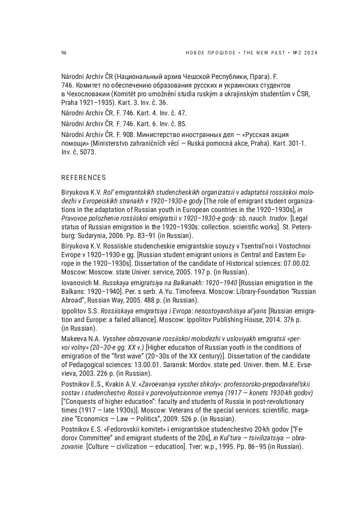 2. Бирюкова К.В. Российские студенческие эмигрантские союзы в Центральной и Восточной Европе в 1920-1930 е гг.: дис. … канд. ист. наук: 07.00.02. М.: Москов. гос. универ. сервиса, 2005. 197 с. EDN: NNCRJP