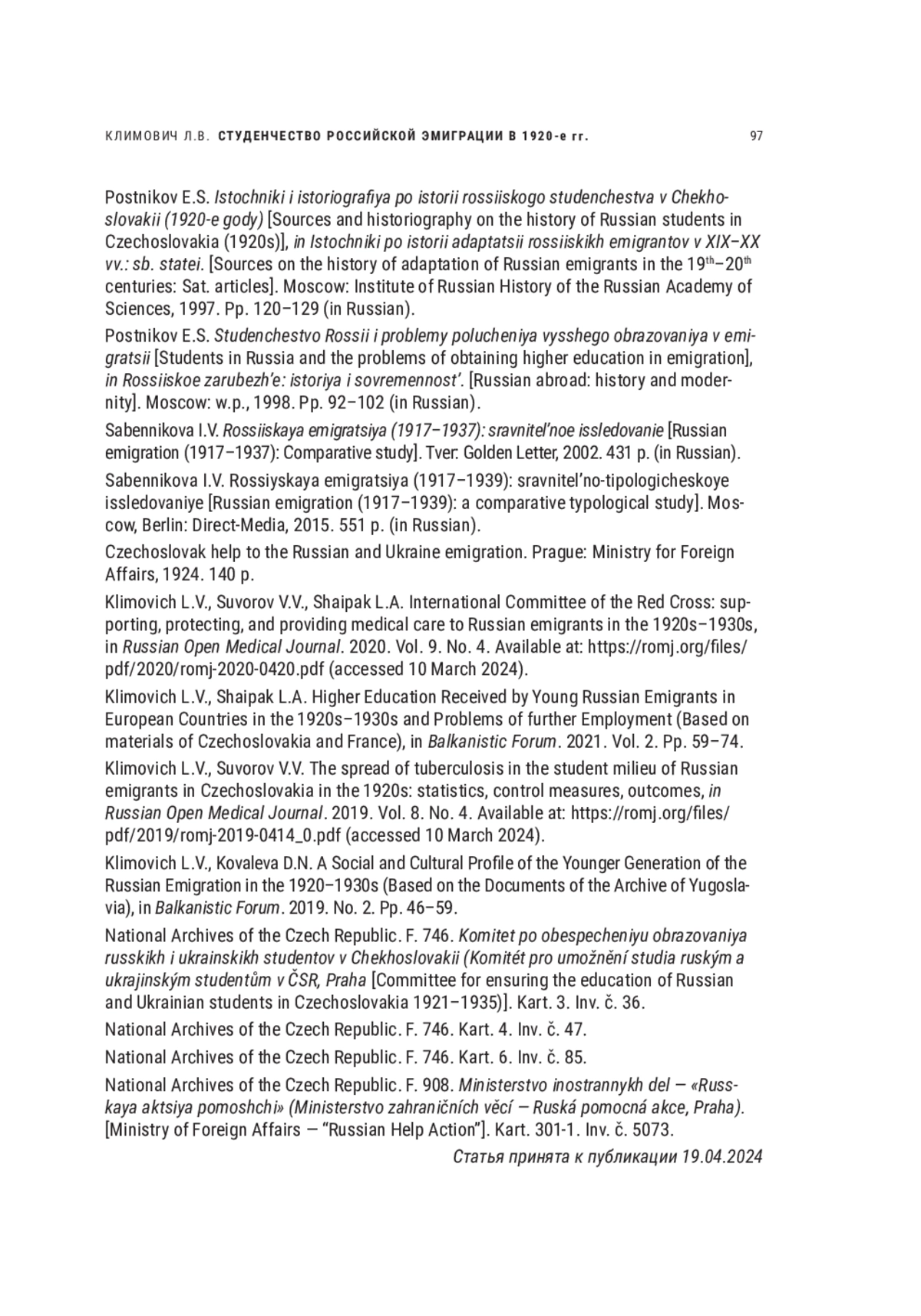 16. Klimovich L.V., Kovaleva D.N. A Social and Cultural Profile of the Younger Generation of the Russian Emigration in the 1920-1930s (Based on the Documents of the Archive of Yugoslavia) // Balkanistic Forum. 2019. № 2. Рp. 46-59. EDN: NRJAQW