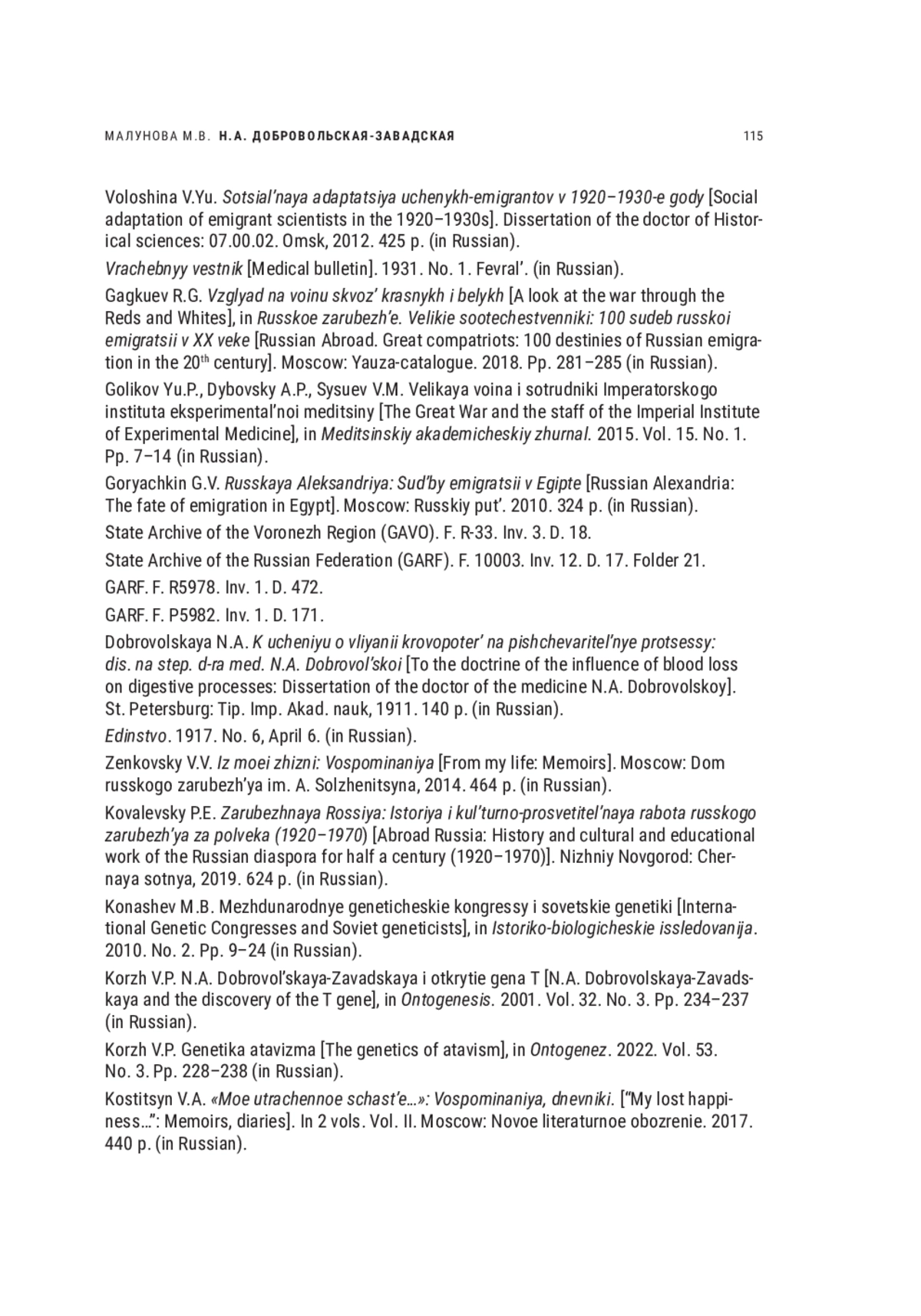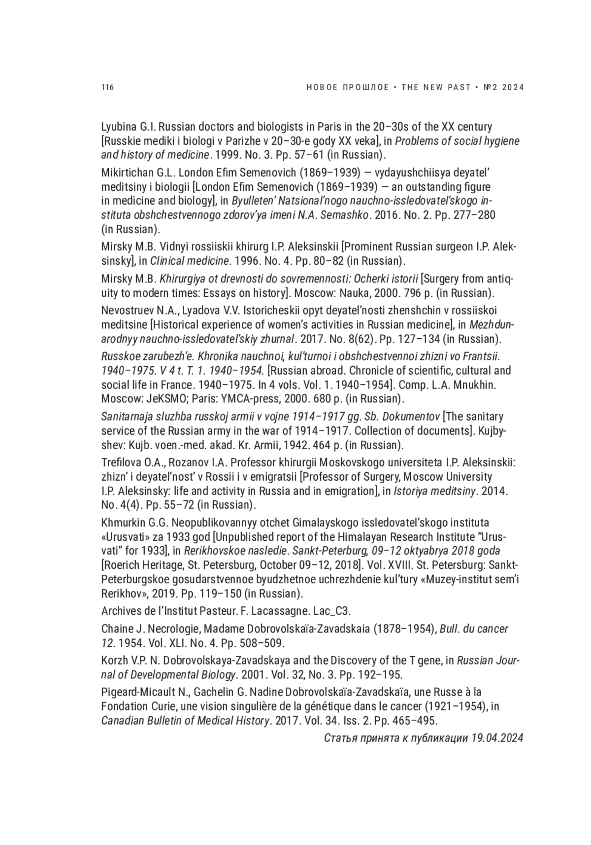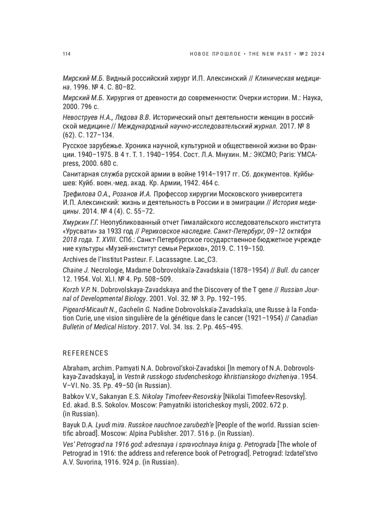 34. Pigeard-Micault N., Gachelin G. Nadine Dobrovolskaïa-Zavadskaïa, une Russe à la Fondation Curie, une vision singulière de la génétique dans le cancer (1921-1954) // Canadian Bulletin of Medical History. 2017. Vol. 34. Iss. 2. Pp. 465-495.