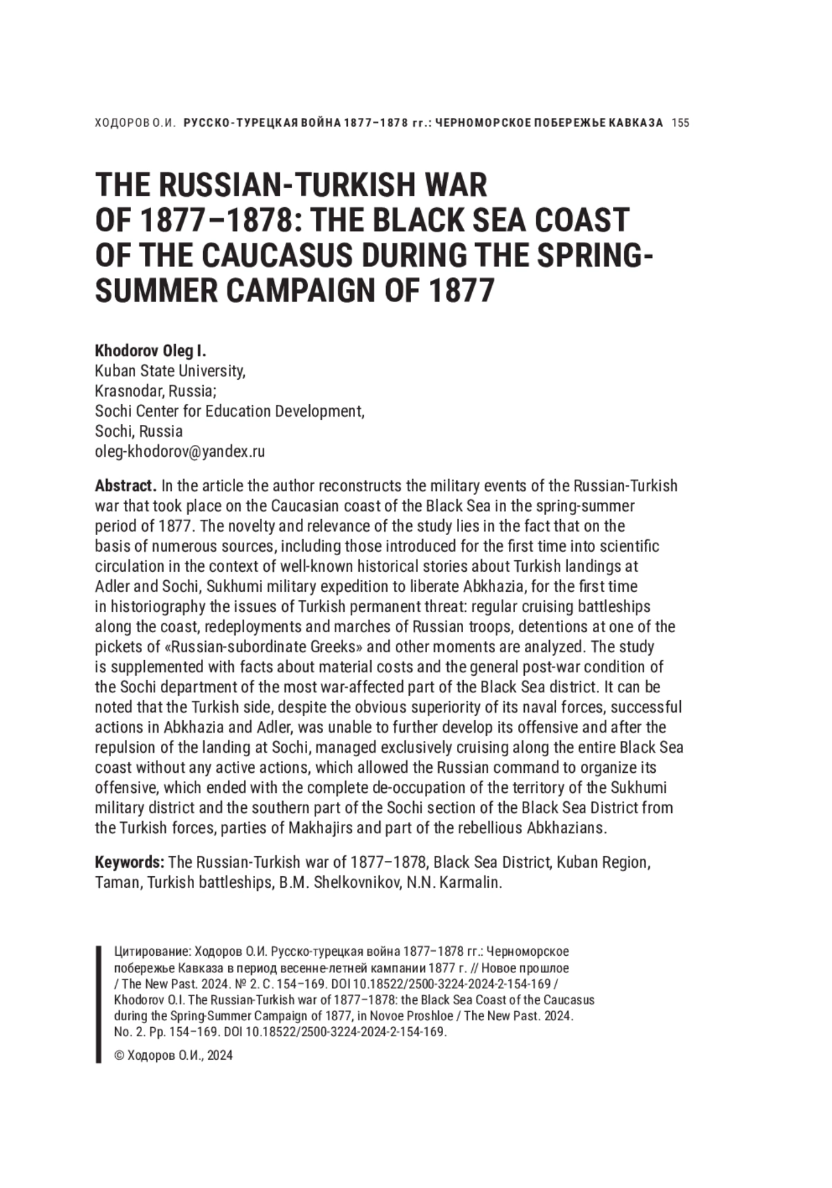 В статье автор реконструирует военные события Русско-турецкой войны, происходившие на кавказском побережье Черного моря в весенне-летний период 1877 г. Новизна и актуальность исследования заключается в том, что на основе многочисленных источников, в том числе впервые вводимых в научный оборот в контексте известных исторических сюжетов о турецких десантах у Адлера и Сочи, Сухумской военной экспедиции по освобождению Абхазии, впервые в историографии рассмотрены вопросы турецкой перманентной угрозы: регулярных крейсирований броненосцев вдоль побережья, передислокаций и маршей российских войск, задержаний на одном из пикетов «русскоподданных греков» и другие моменты. Исследование дополнено фактами о материальных издержках и общем послевоенном состоянии Сочинского отдела — наиболее пострадавшей от войны части Черноморского округа. Можно отметить, что турецкая сторона, несмотря на очевидное превосходство своих военно-морских сил, успешных действий в Абхазии и у Адлера, не смогла в дальнейшем развить свое наступление и после отбитого десанта у Сочи обходилась исключительно крейсированием вдоль всего Черноморского побережья без каких-либо активных действий, что позволило российскому командованию организовать свое наступление, завершившееся полной деоккупацией территории Сухумского военного округа и южной части Сочинского отдела Черноморского округа от турецких сил, партий махаджиров и части восставших абхазов