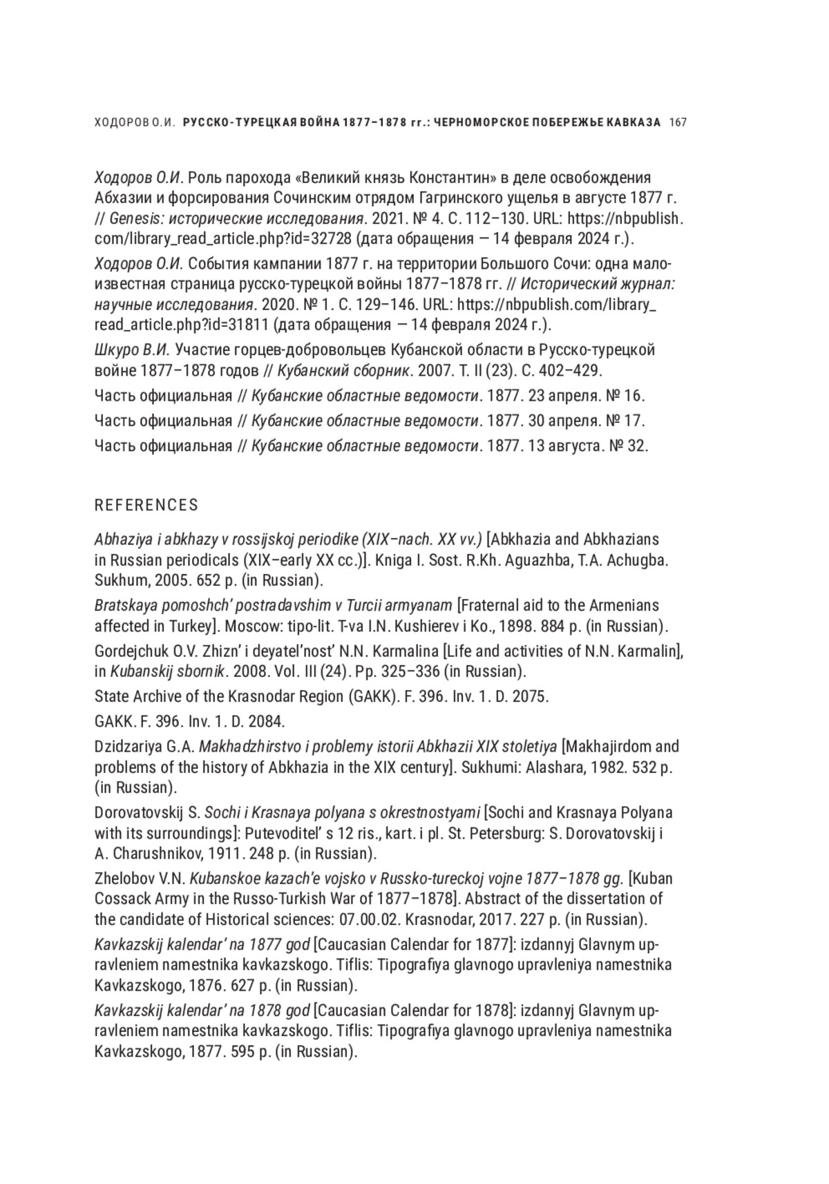 28. Ходоров О.И. Роль парохода “Великий князь Константин” в деле освобождения Абхазии и форсирования Сочинским отрядом Гагринского ущелья в августе 1877 г. // Genesis: исторические исследования. 2021. № 4. С. 112-130. URL: https://nbpublish.com/library_read_article.php?id=32728 (дата обращения - 14 февраля 2024 г.). EDN: UCLBUY