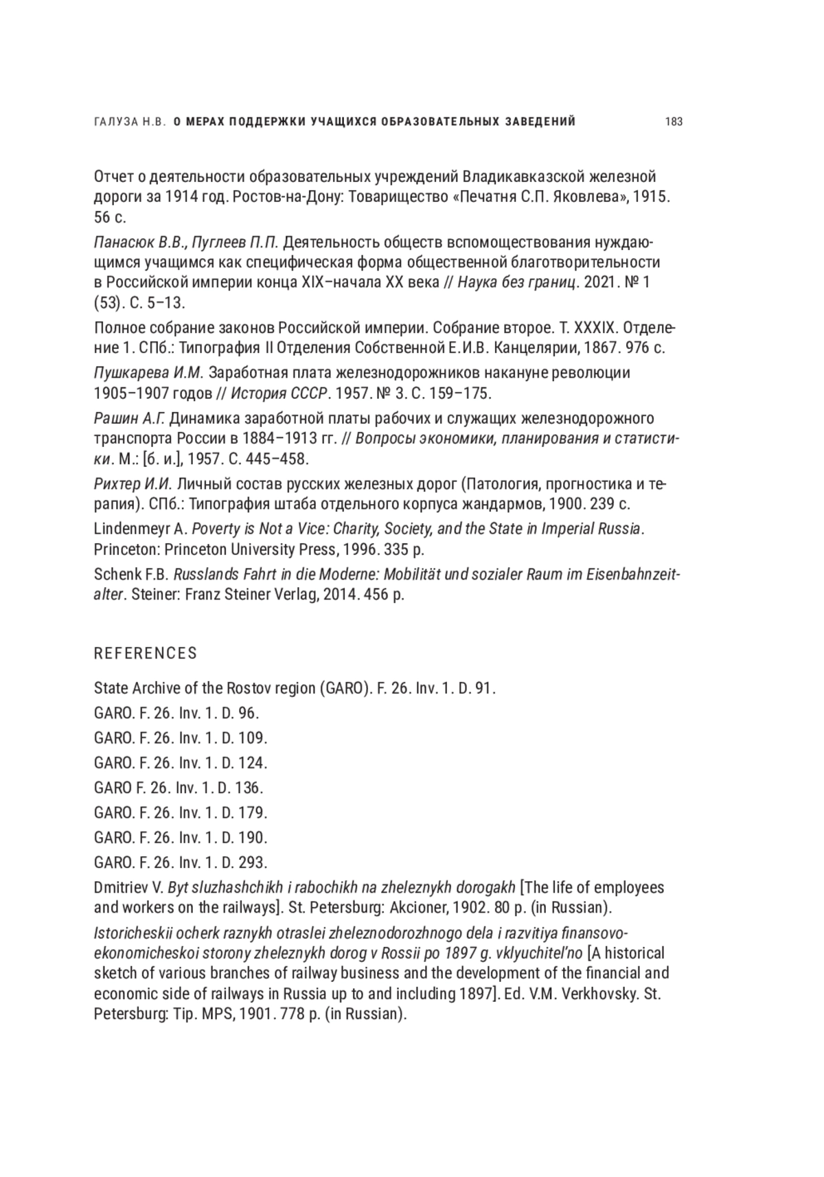 14. Панасюк В.В., Пуглеев П.П. Деятельность обществ вспомоществования нуждающимся учащимся как специфическая форма общественной благотворительности в Российской империи конца XIX-начала XX века // Наука без границ. 2021. № 1 (53). С. 5-13. EDN: MHQZIW