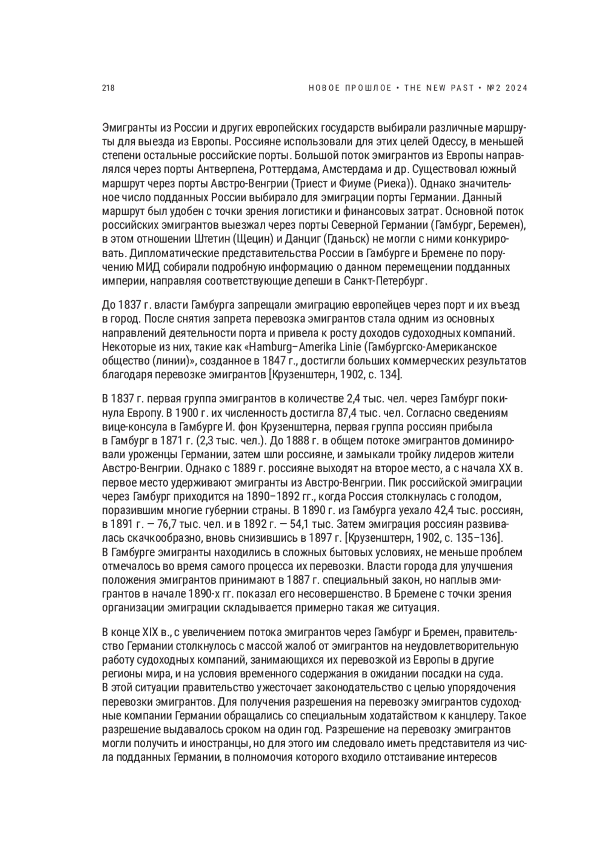 Представленная статья посвящена исследованию восприятия эмиграции россиян в США и другие регионы мира через Гамбург и Бремен российскими дипломатами в конце XIX–начале ХХ вв. Данная тематика не нашла достойного отражения в зарубежной и отечественной историографии, несмотря на наличие исследований, посвященных общим проблемам эмиграции россиян через территорию Германии. В качестве исторического источника выступают донесения министра-резидента в Гамбурге и консула в Бремене в МИД России, опубликованные в «Сборниках консульских донесений». Изучение данной темы позволяет на историческом материале проследить роль транзитных стран в процессе эмиграции и создания ими механизмов решения гуманитарных проблем мигрантов, чему Германии на рубеже XIX–XX вв. уделяла большое внимание. Эта проблема, к сожалению, актуальна для многих государств, ставших транзитными зонами в современной международной эмиграции. В процессе работы над темой использовались историко-сравнительный, историко-типологический методы. В результате исследования подчеркивается увеличение эмиграции россиян через Бремен и Гамбург после некоторого спада в середине 90-х гг. XIX в. Гамбург становится основным портом эмиграции подданных России. По мнению дипломатов, экономический фактор стал главной причиной эмиграции россиян. Они признавали успешность действий германских властей по улучшению положения эмигрантов на территории страны и условий их перевозки