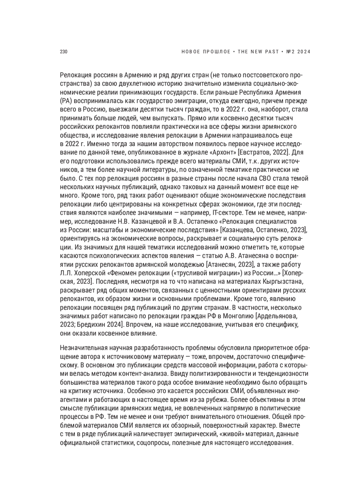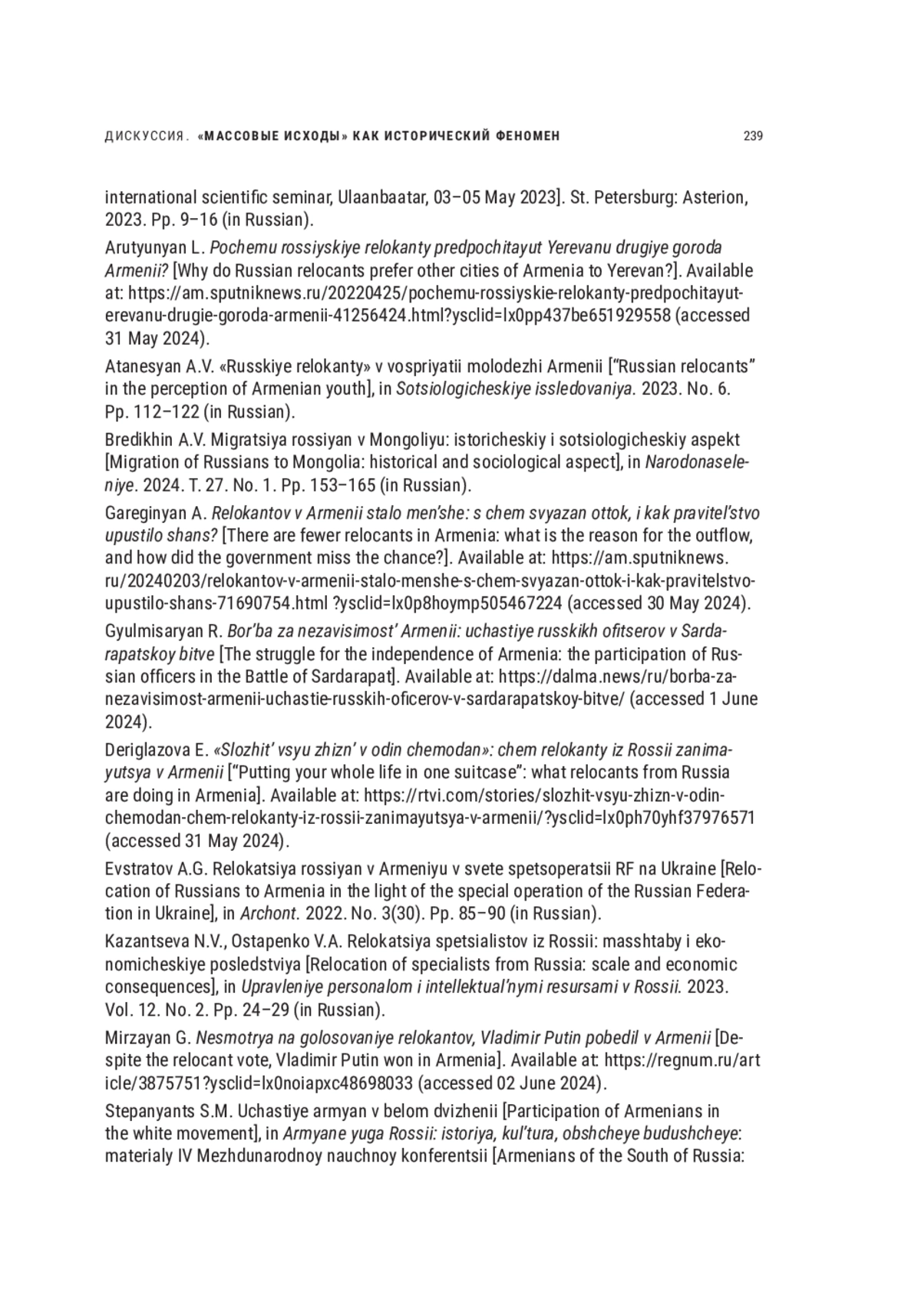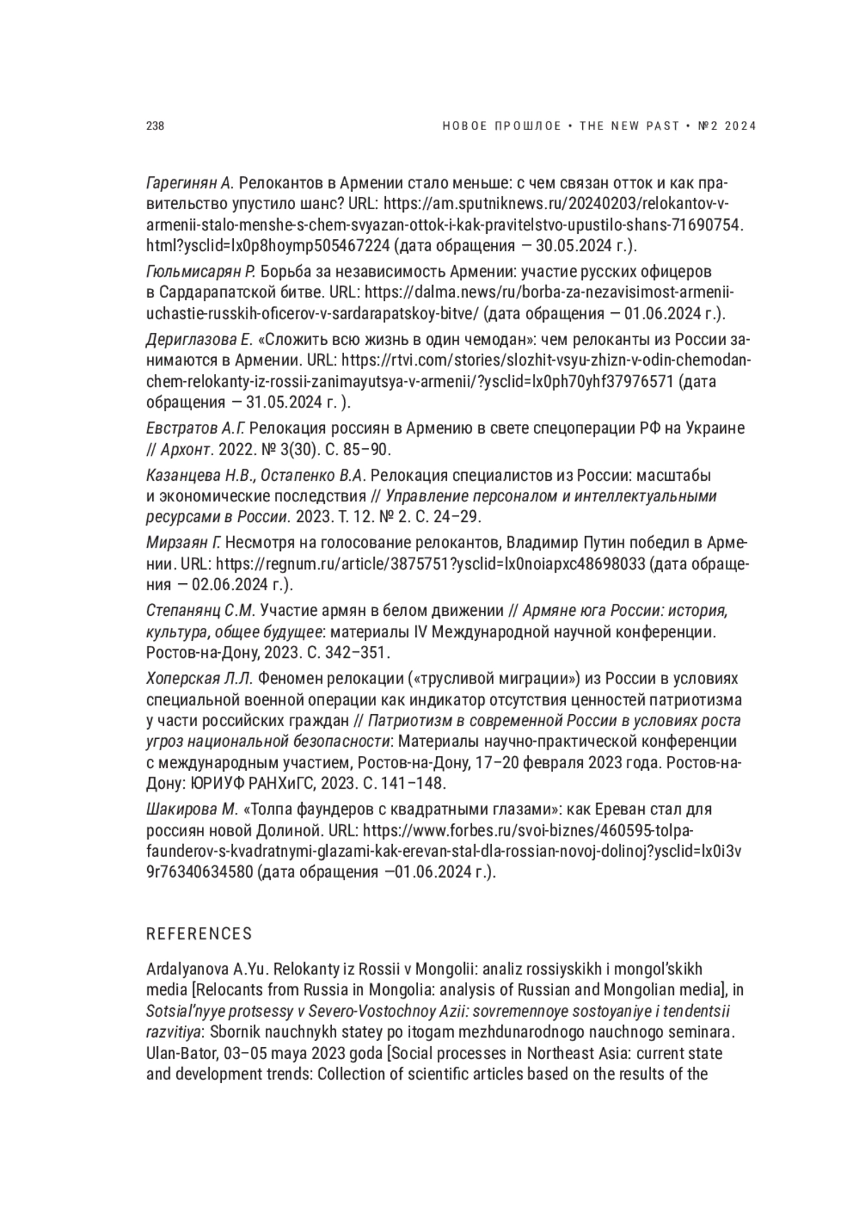 3. Атанесян А.В. “Русские релоканты” в восприятии молодежи Армении // Социологические исследования. 2023. № 6. С. 112-122. EDN: BZDWLZ