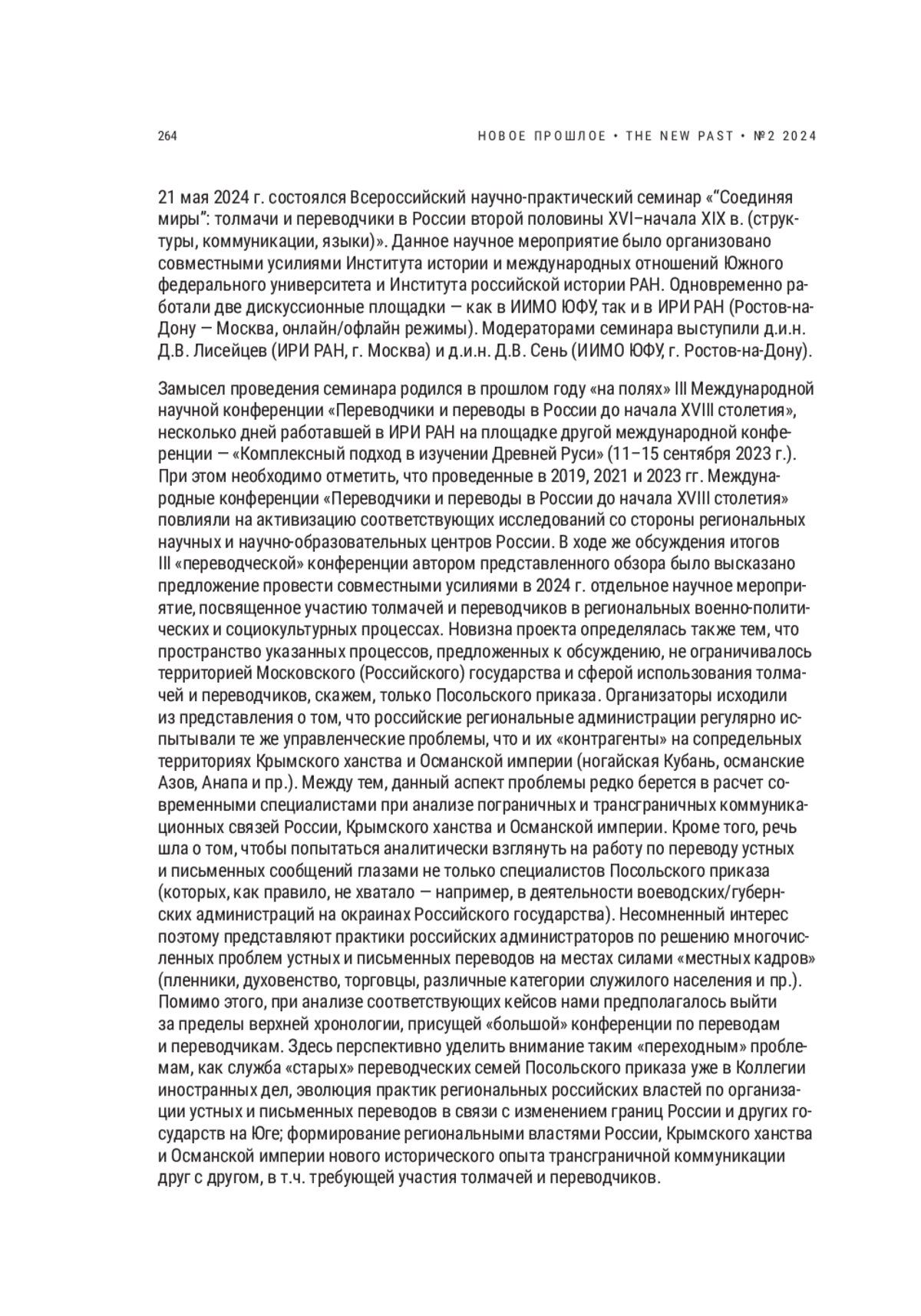 СЕНЬ Д. В. ВСЕРОССИЙСКИЙ НАУЧНОПРАКТИЧЕСКИЙ СЕМИНАР ПО ИСТОРИИ ТОЛМАЧЕЙ И ПЕРЕВОДЧИКОВ В РОССИИ // НОВОЕ ПРОШЛОЕ. 2024. № 2