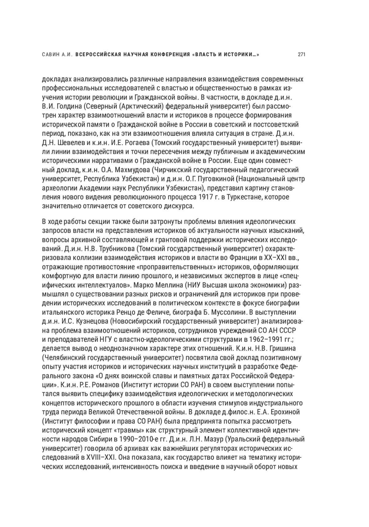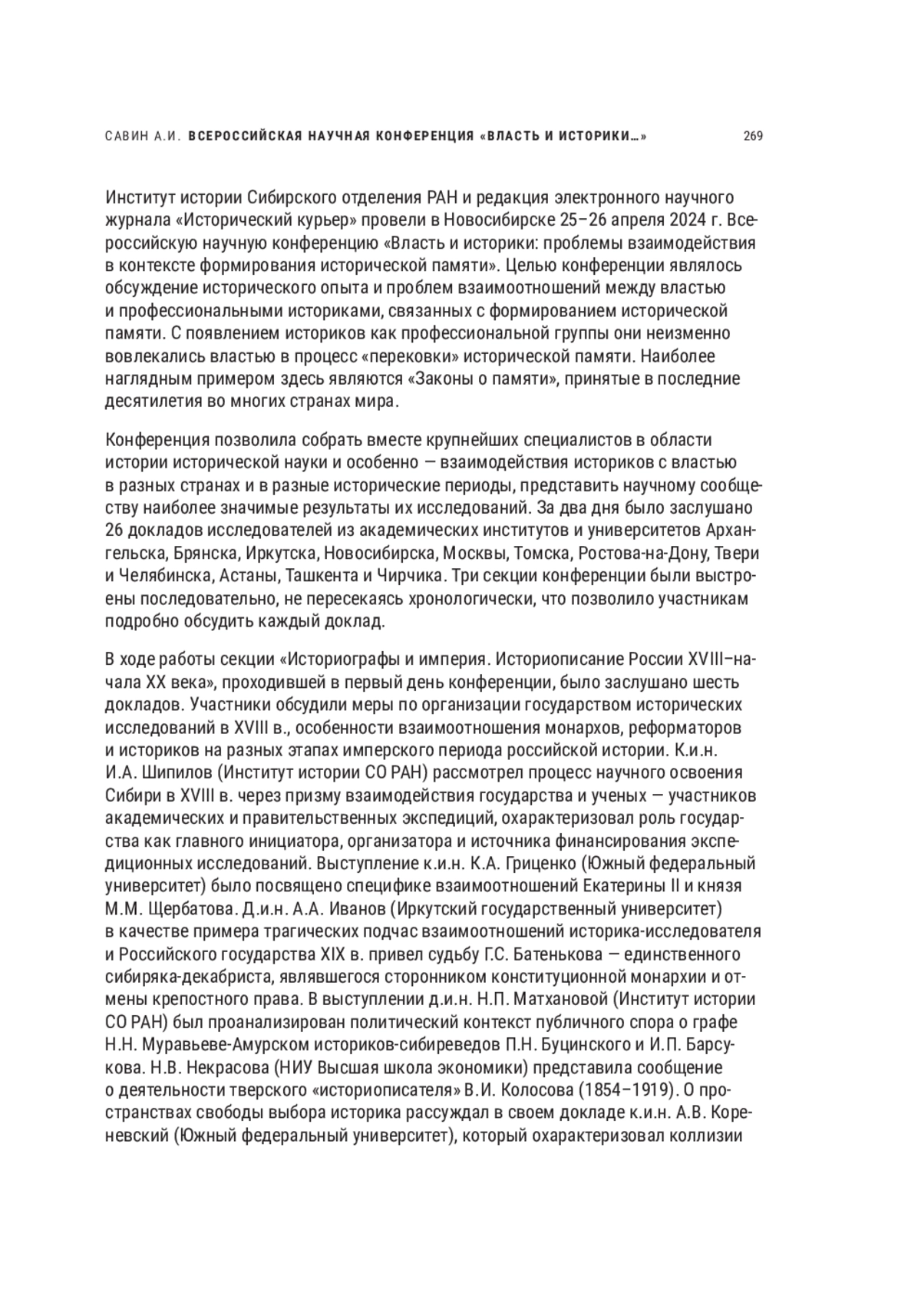 Институт истории Сибирского отделения РАН и редакция электронного научного журнала «Исторический курьер» провели в Новосибирске 25–26 апреля 2024 г. Всероссийскую научную конференцию «Власть и историки: проблемы взаимодействия в контексте формирования исторической памяти». Целью конференции являлось обсуждение исторического опыта и проблем взаимоотношений между властью и профессиональными историками, связанных с формированием исторической памяти. С появлением историков как профессиональной группы они неизменно вовлекались властью в процесс «перековки» исторической памяти. Наиболее наглядным примером здесь являются «Законы о памяти», принятые в последние десятилетия во многих странах мира
