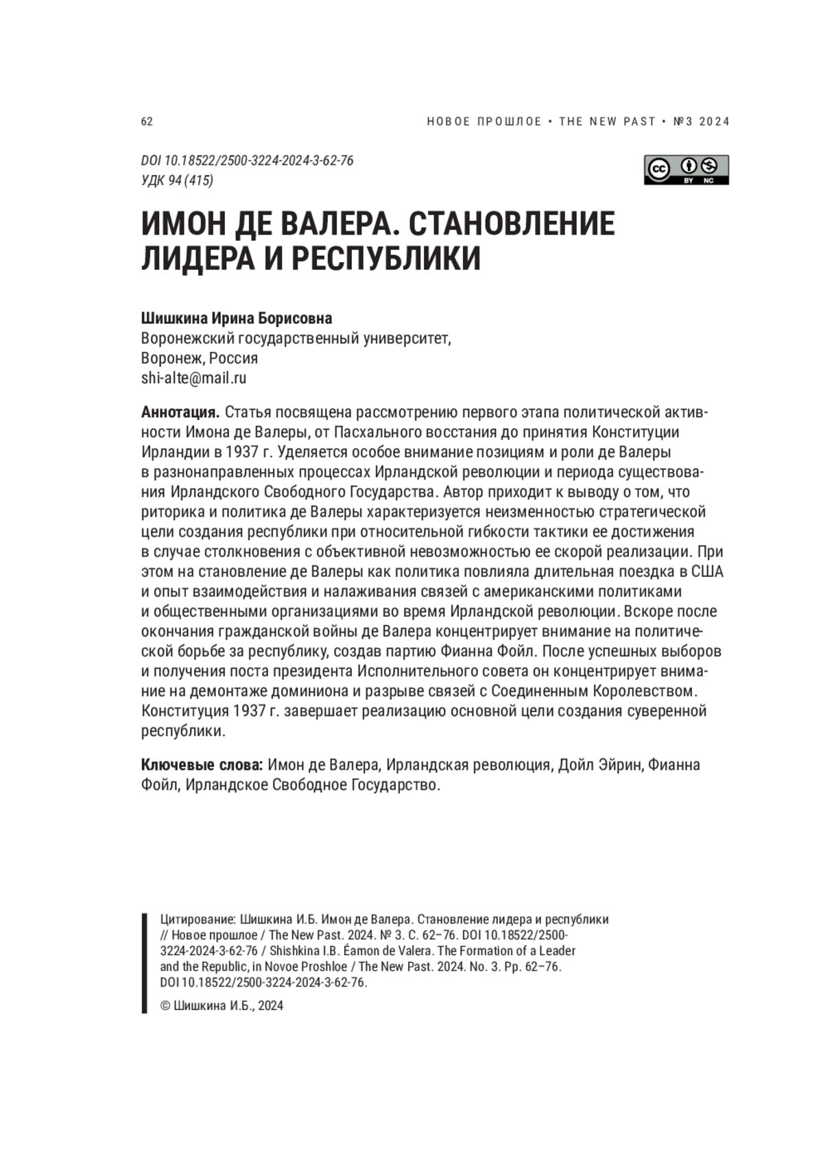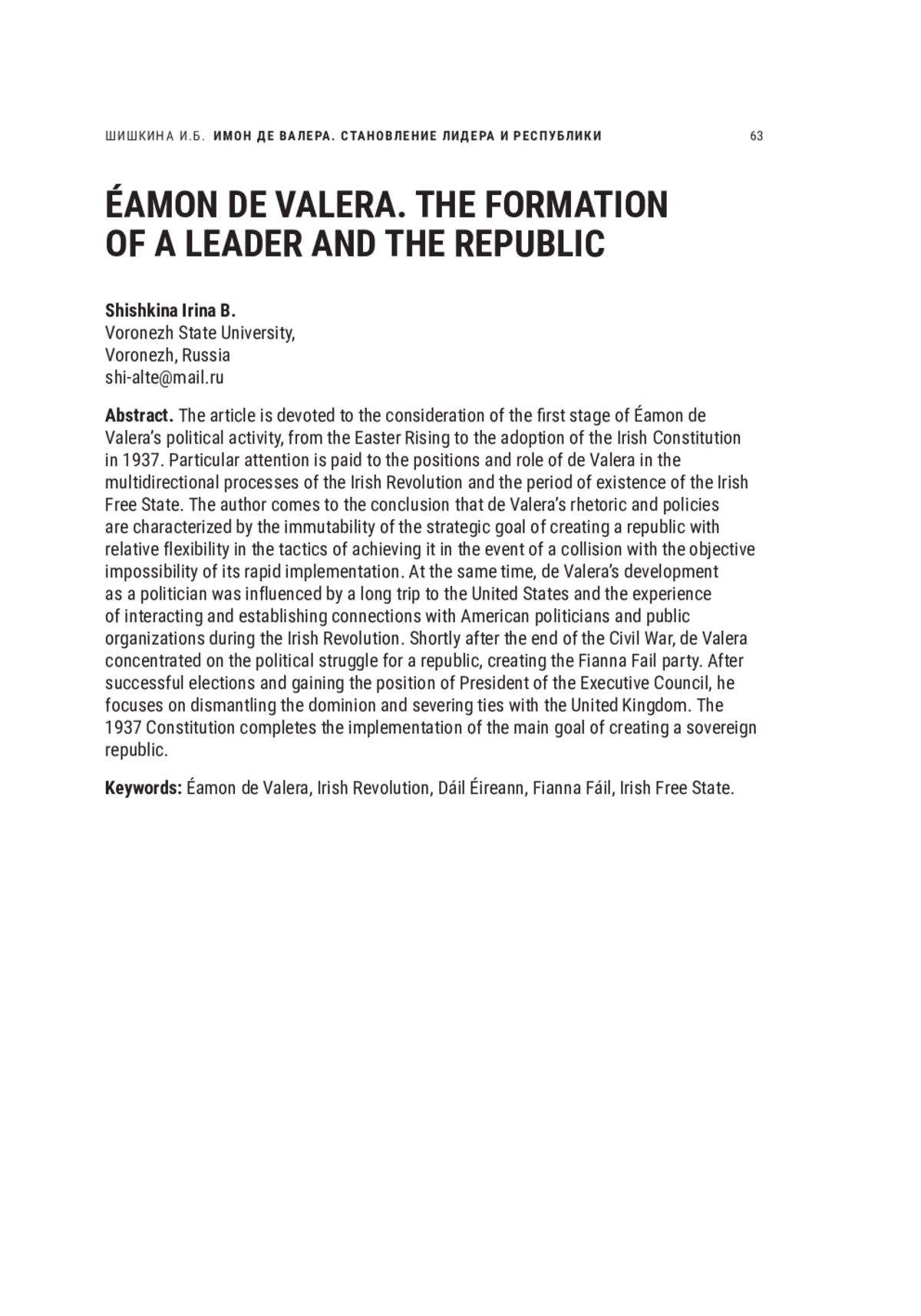Первая половина XX в. для Ирландии стала острым временем, наполненным ключевыми событиями — от мирной борьбы за независимость до создания современной республики. В силу специфики данного периода и условий ирландской политической системы политическое лидерство оказывало большое влияние на формирование вектора развития страны, и особую роль в истории Ирландии занимает Имон де Валера, начавший свою активную деятельность в период Ирландской революции и завершивший политическую карьеру в 1973 г. При этом начиная с 1918 г. он преимущественно занимал ключевые позиции в системе управления государством, а в период с 1932 по 1973 г. чередовал посты главы правительства и президента страны. Фигура де Валеры отчасти стала дополнительно легитимизирующей ирландский политический строй, он стал символом своей эпохи, некоей политической константой Ирландии. Стоит отметить, что рассматриваемый в данной работе первый период его политической деятельности — от момента начала Ирландской революции до принятия Конституции 1937 г. — стал наиболее ярким и важным для страны