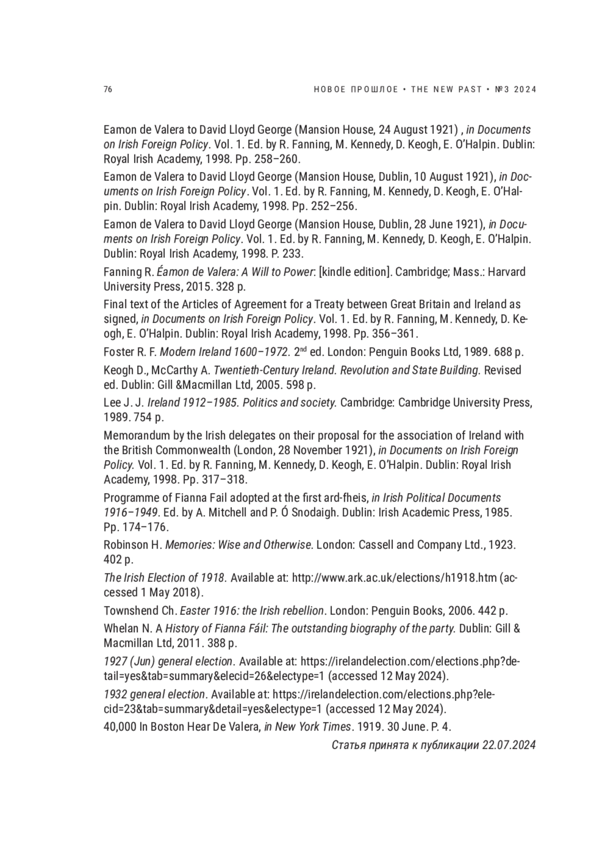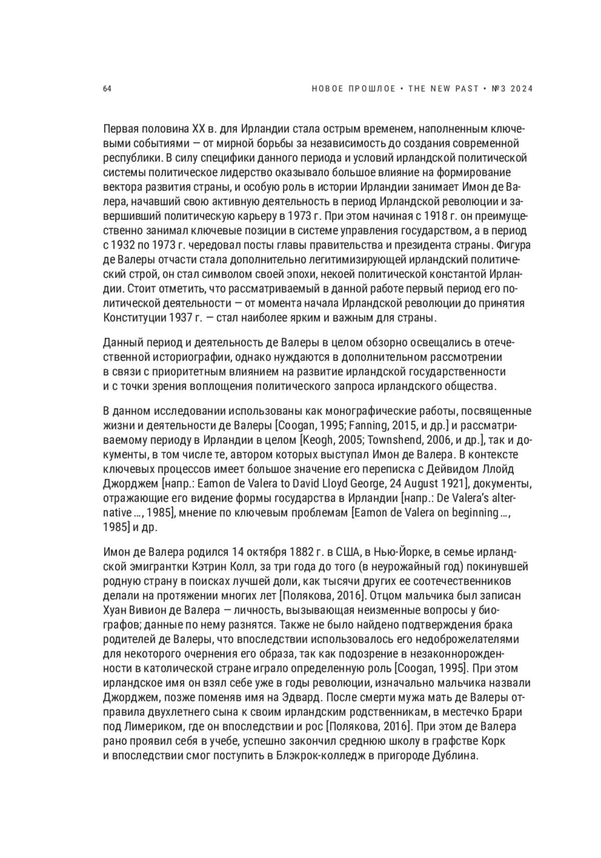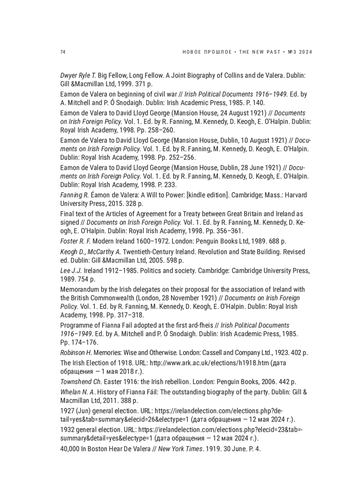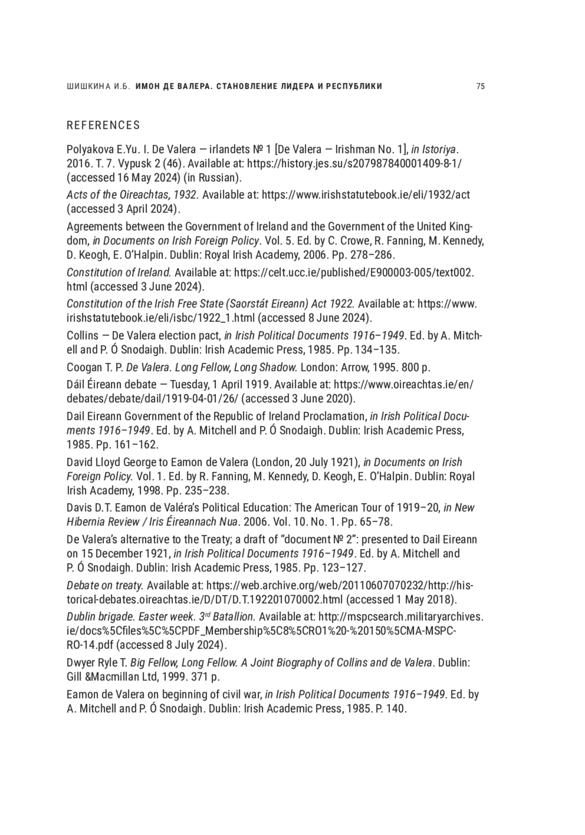 1. Полякова Е.Ю. И. Де Валера - ирландец № 1 // История: Электронный научнообразовательный журнал. 2016. T. 7. Выпуск 2 (46). URL: https://history.jes.su/s207987840001409-8-1/ (дата обращения - 16 мая 2024 г.). EDN: WDLENL