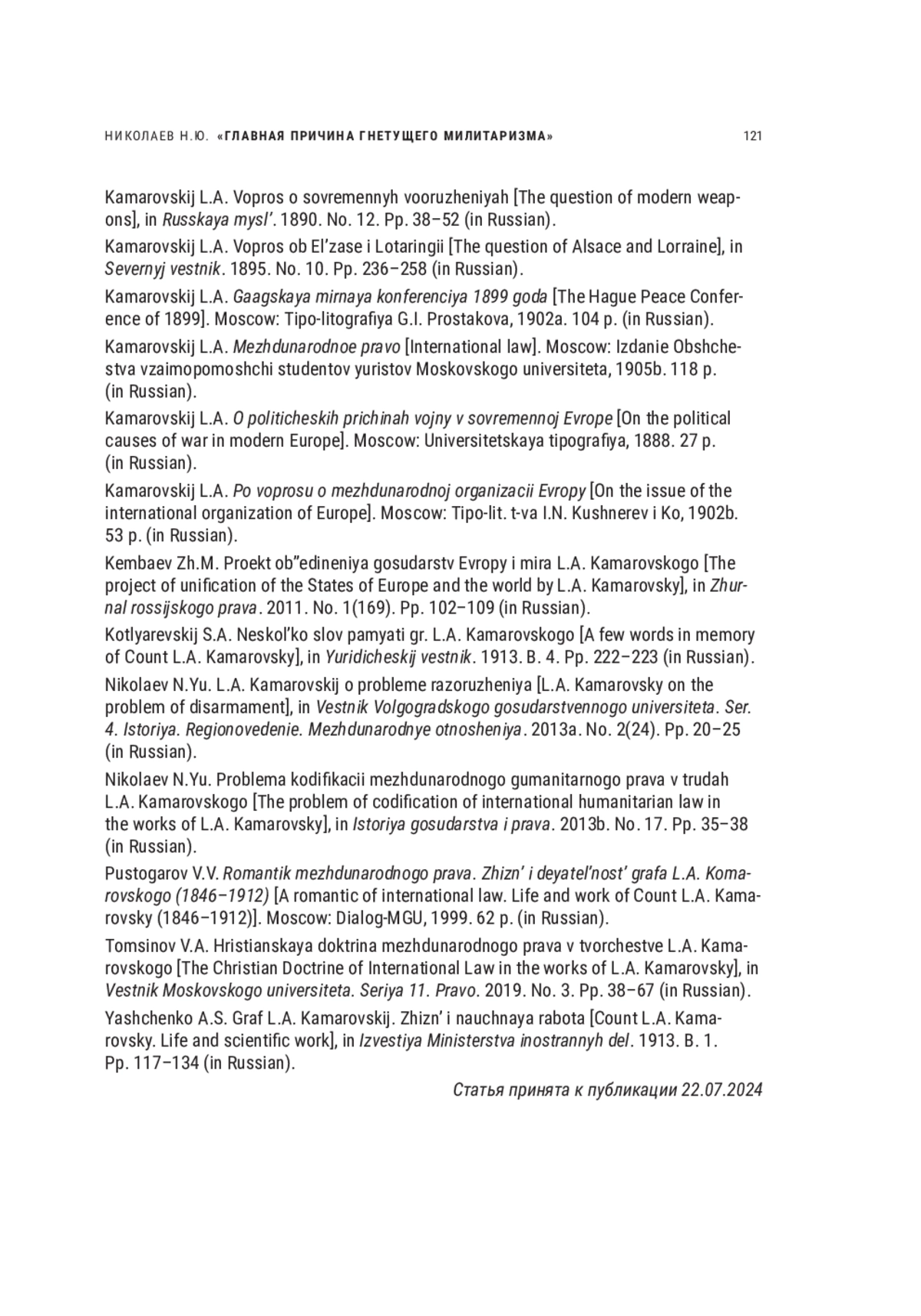 10. Николаев Н.Ю. Л.А. Камаровский о проблеме разоружения // Вестник Волгоградского государственного университета. Сер. 4. История. Регионоведение. Международные отношения. 2013a. № 2(24). С. 20-25. EDN: RSXYXT