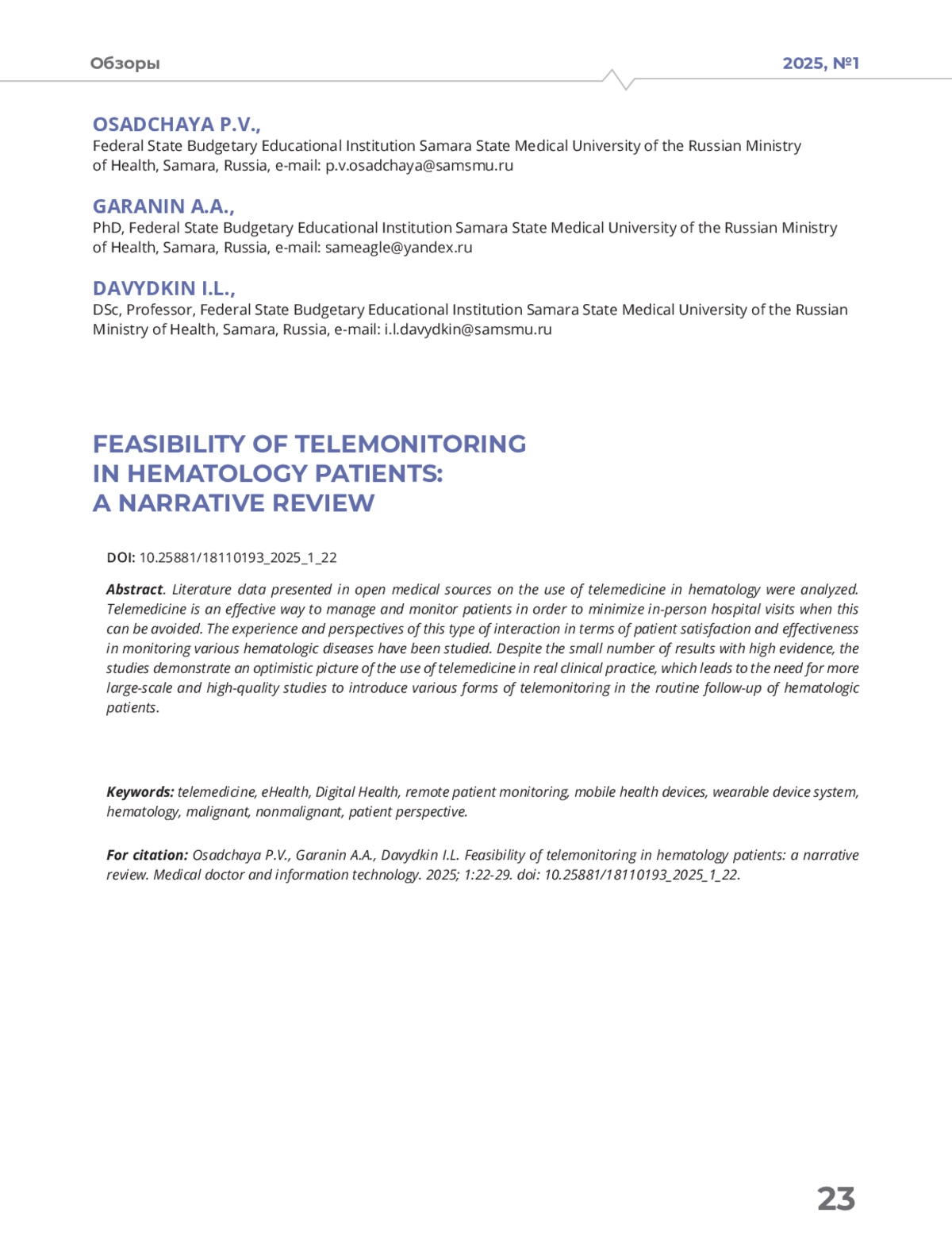 ОСАДЧАЯ П. В., ГАРАНИН А. А., ДАВЫДКИН И. Л. ВОЗМОЖНОСТИ ТЕЛЕМОНИТОРИНГА ПАЦИЕНТОВ С ГЕМАТОЛОГИЧЕСКИМИ ЗАБОЛЕВАНИЯМИ: НАРРАТИВНЫЙ ОБЗОР // ВРАЧ И ИНФОРМАЦИОННЫЕ ТЕХНОЛОГИИ. 2025. № 1