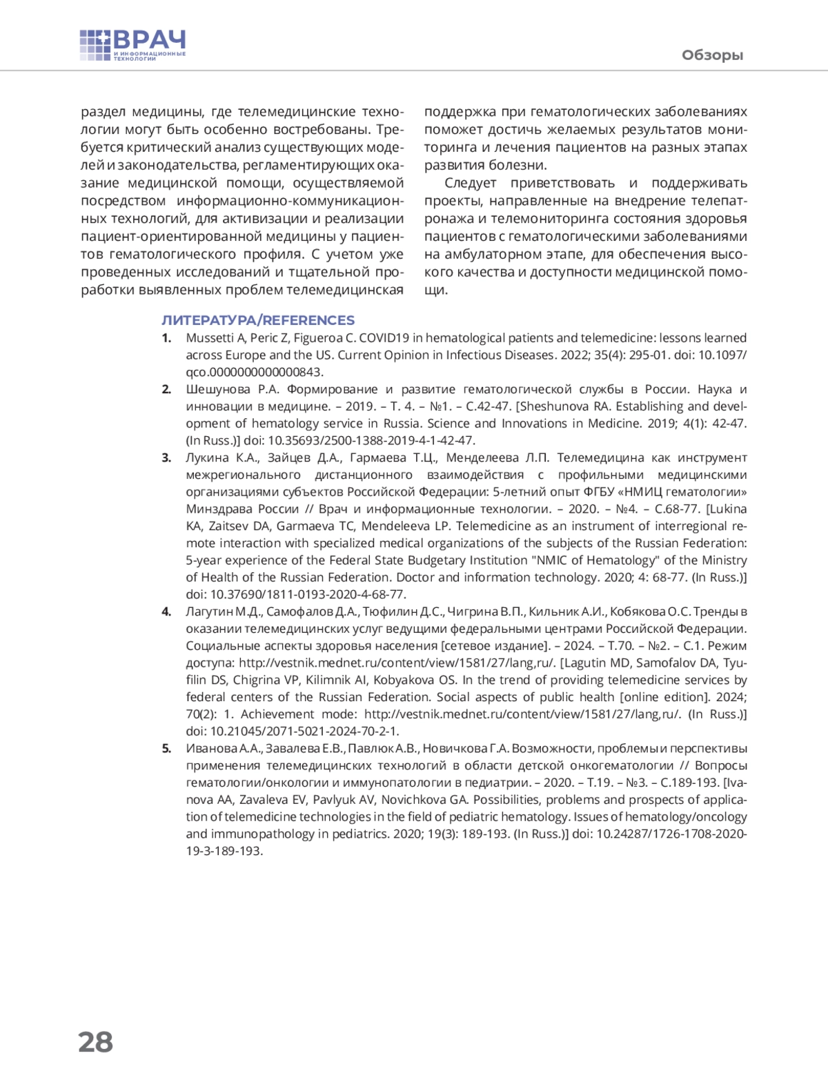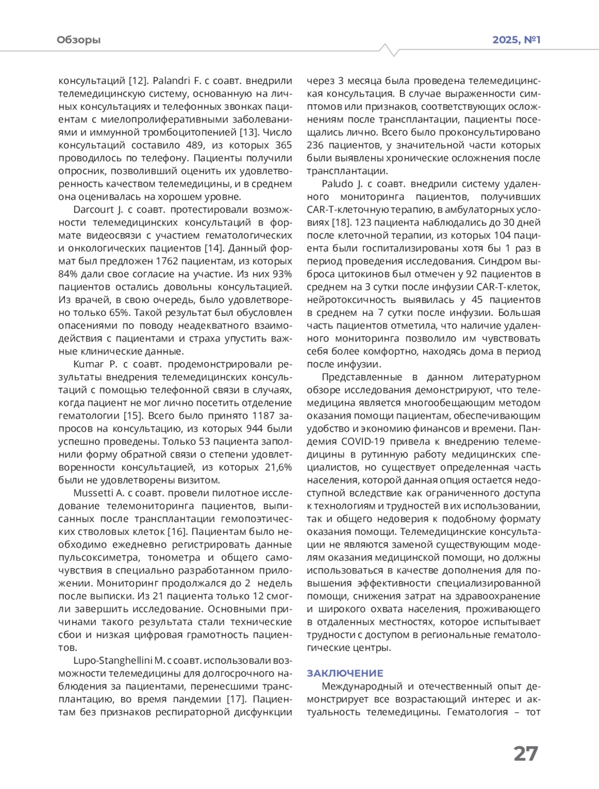 Статья: ВОЗМОЖНОСТИ ТЕЛЕМОНИТОРИНГА ПАЦИЕНТОВ С ГЕМАТОЛОГИЧЕСКИМИ ЗАБОЛЕВАНИЯМИ: НАРРАТИВНЫЙ ОБЗОР (2025)