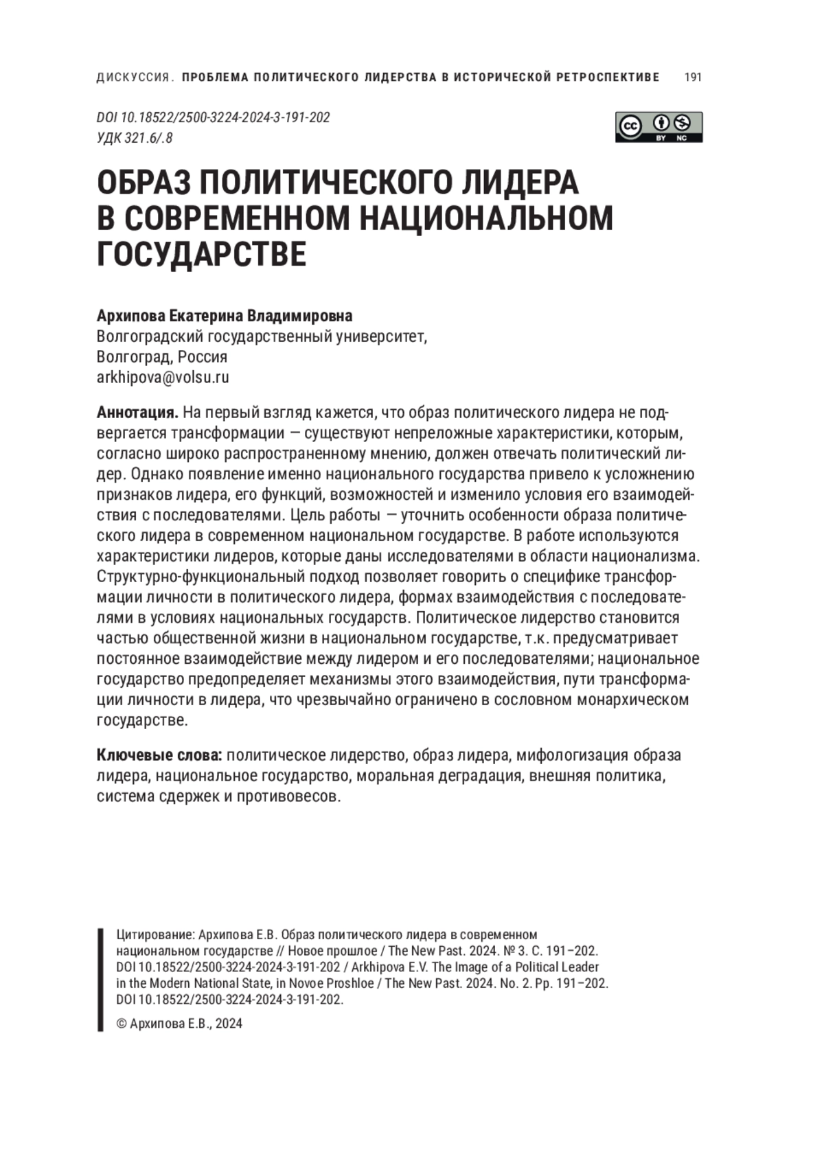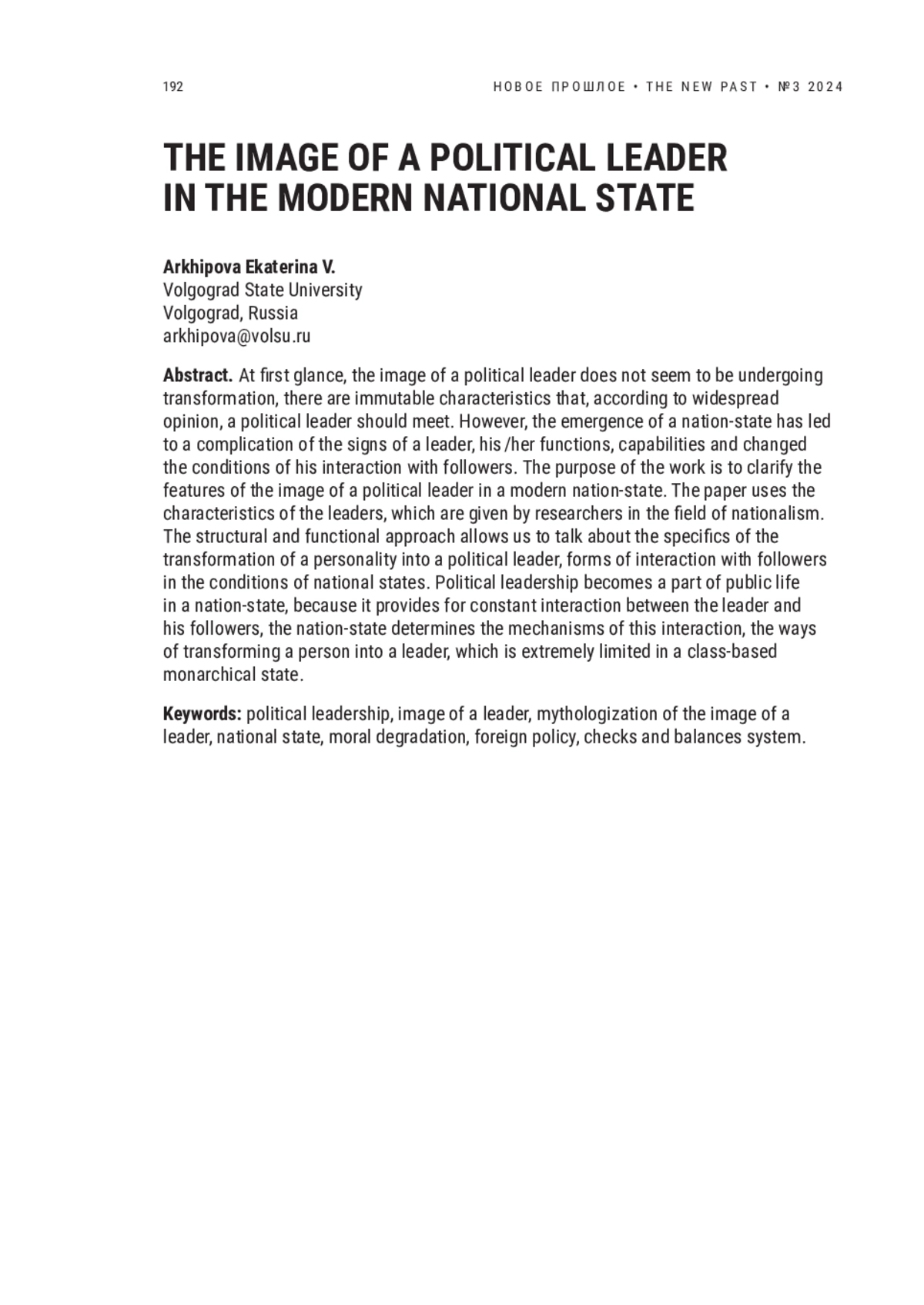 На первый взгляд кажется, что образ политического лидера не подвергается трансформации — существуют непреложные характеристики, которым, согласно широко распространенному мнению, должен отвечать политический лидер. Однако появление именно национального государства привело к усложнению признаков лидера, его функций, возможностей и изменило условия его взаимодействия с последователями. Цель работы — уточнить особенности образа политического лидера в современном национальном государстве. В работе используются характеристики лидеров, которые даны исследователями в области национализма. Структурно-функциональный подход позволяет говорить о специфике трансформации личности в политического лидера, формах взаимодействия с последователями в условиях национальных государств. Политическое лидерство становится частью общественной жизни в национальном государстве, т. к. предусматривает постоянное взаимодействие между лидером и его последователями; национальное государство предопределяет механизмы этого взаимодействия, пути трансформации личности в лидера, что чрезвычайно ограничено в сословном монархическом государстве