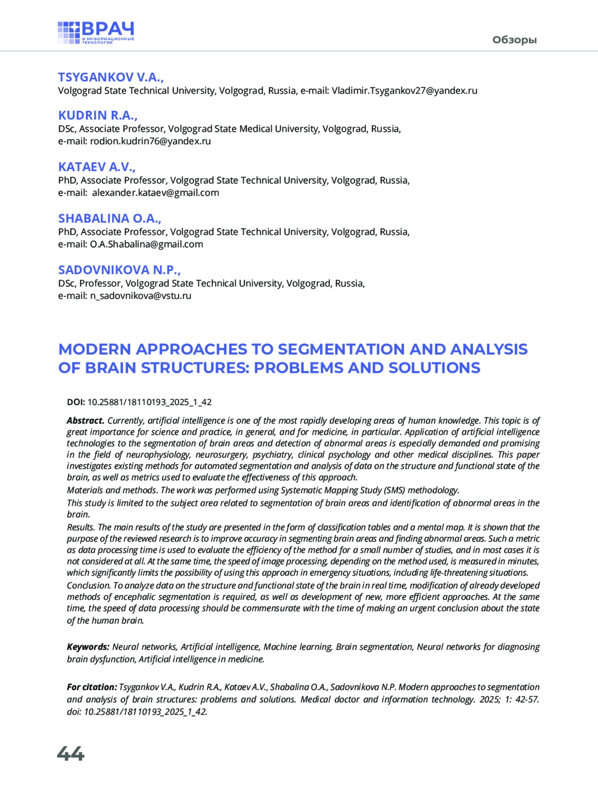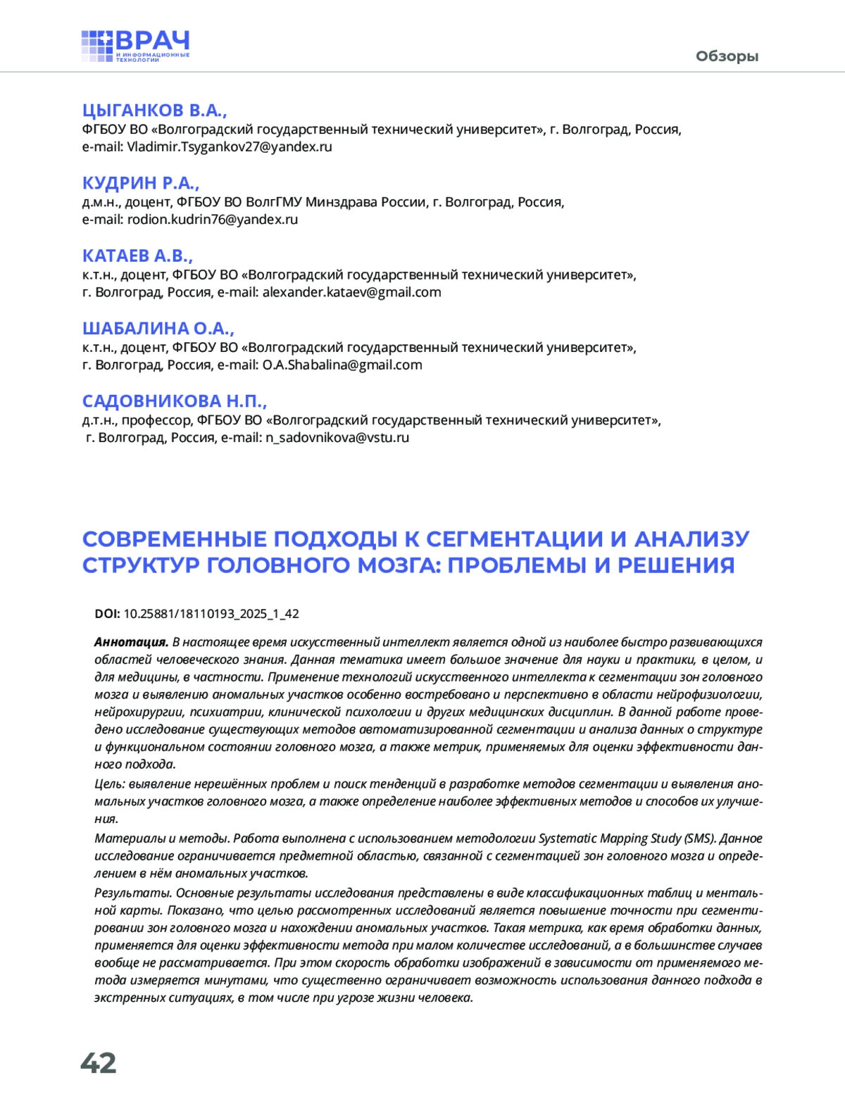 Материалы и методы. Работа выполнена с использованием методологии Systematic Mapping Study (SMS). Данное исследование ограничивается предметной областью, связанной с сегментацией зон головного мозга и определением в нём аномальных участков.