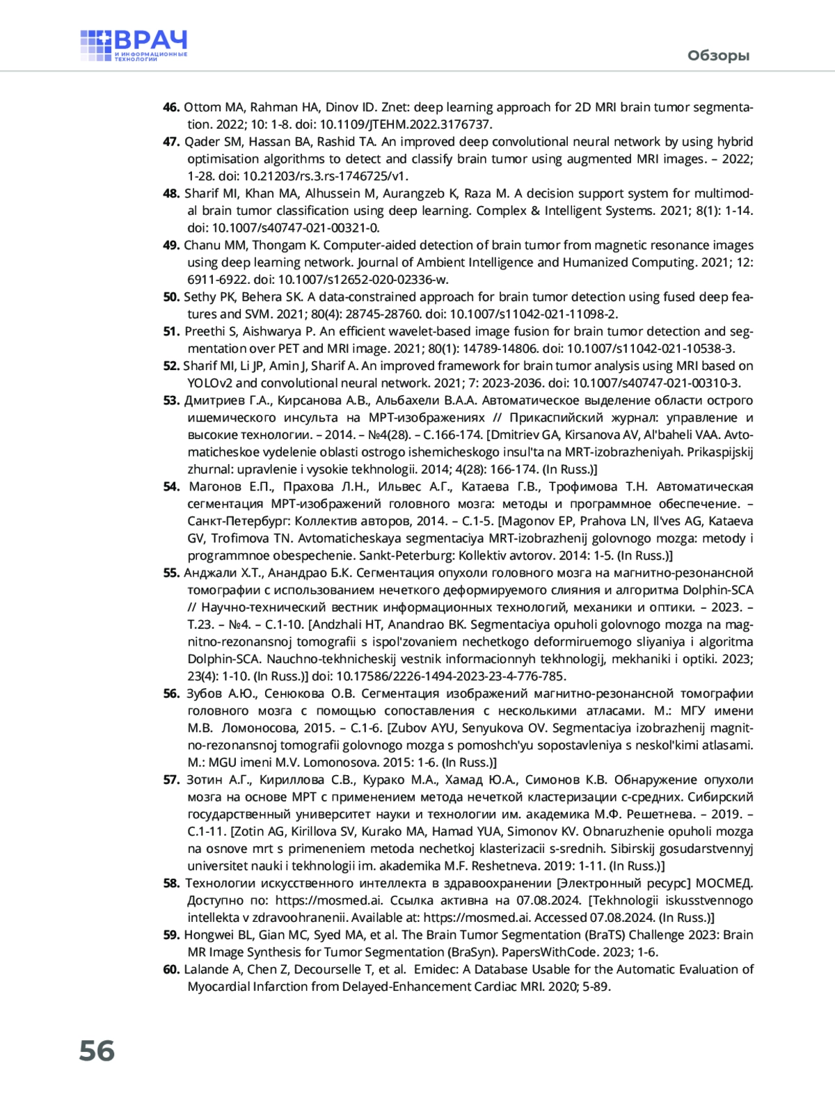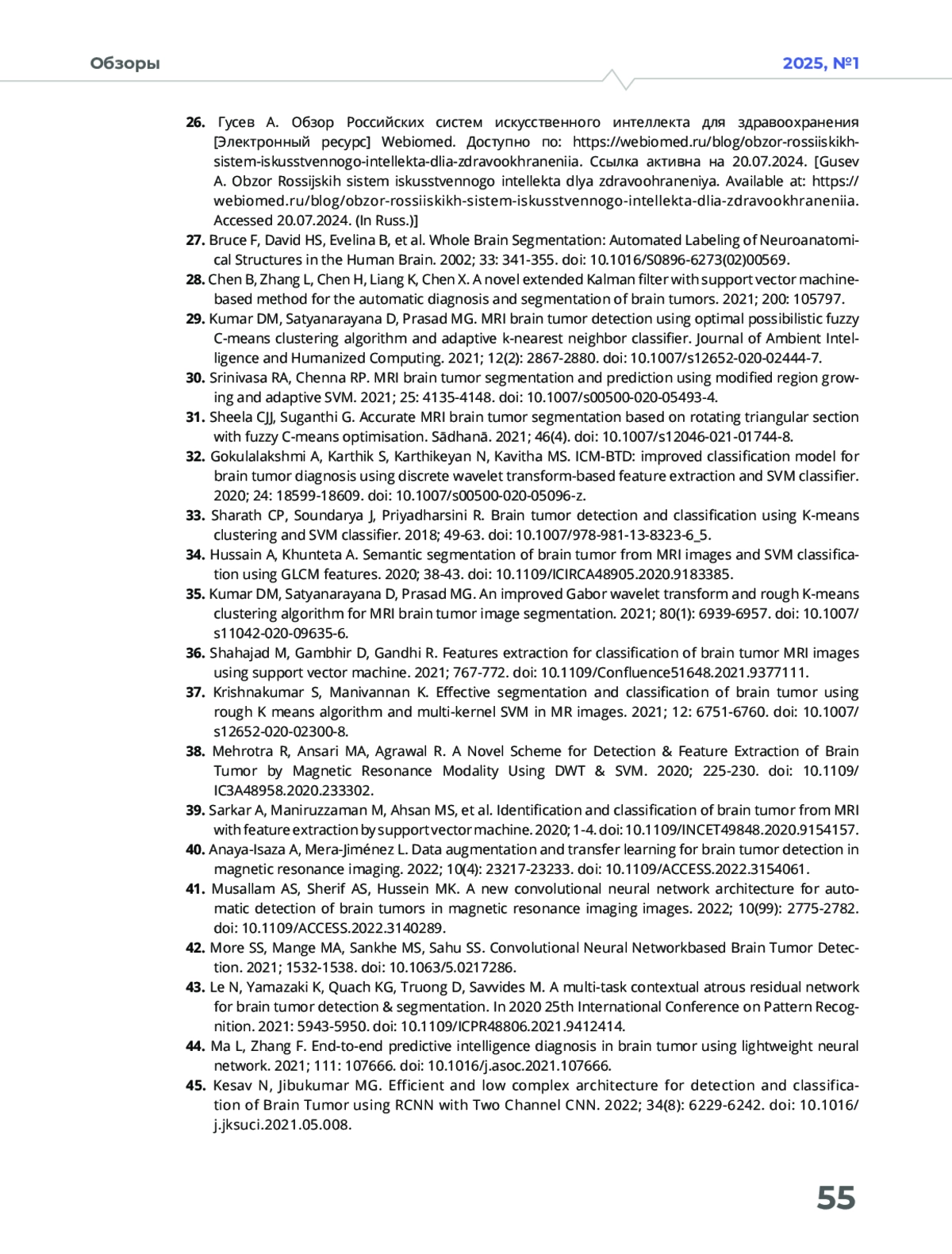 20. Абдулракеб АРА, Сушкова ЛТ, Лозовская НА. Обзор методов сегментации опухолей на МРТ-изображениях головного мозга // Прикаспийский журнал: управление и высокие технологии. - 2015. - №1(29). - C.122-138.