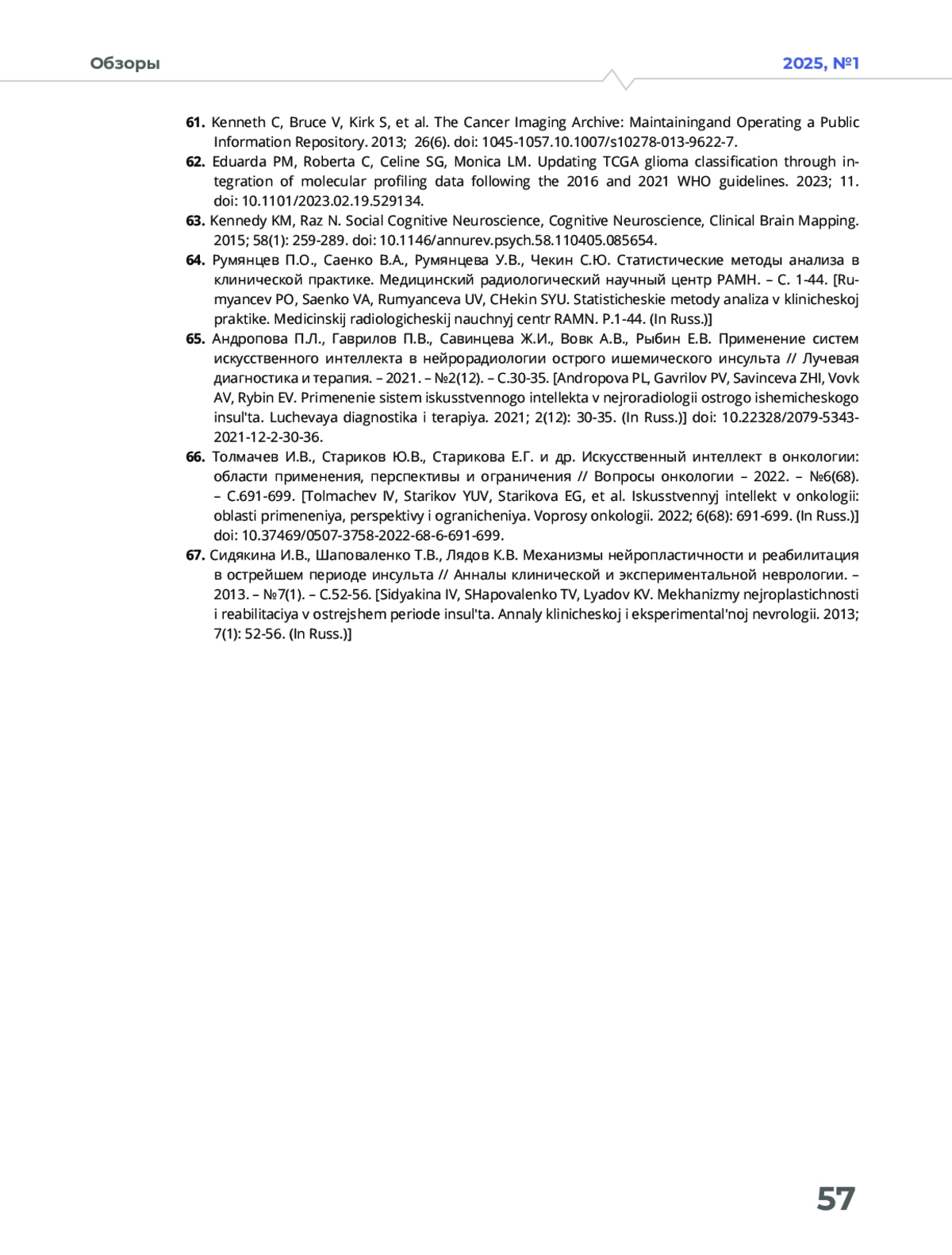 65. Андропова П.Л., Гаврилов П.В., Савинцева Ж.И., Вовк А.В., Рыбин Е.В. Применение систем искусственного интеллекта в нейрорадиологии острого ишемического инсульта // Лучевая диагностика и терапия. - 2021. - №2(12). - С.30-35.