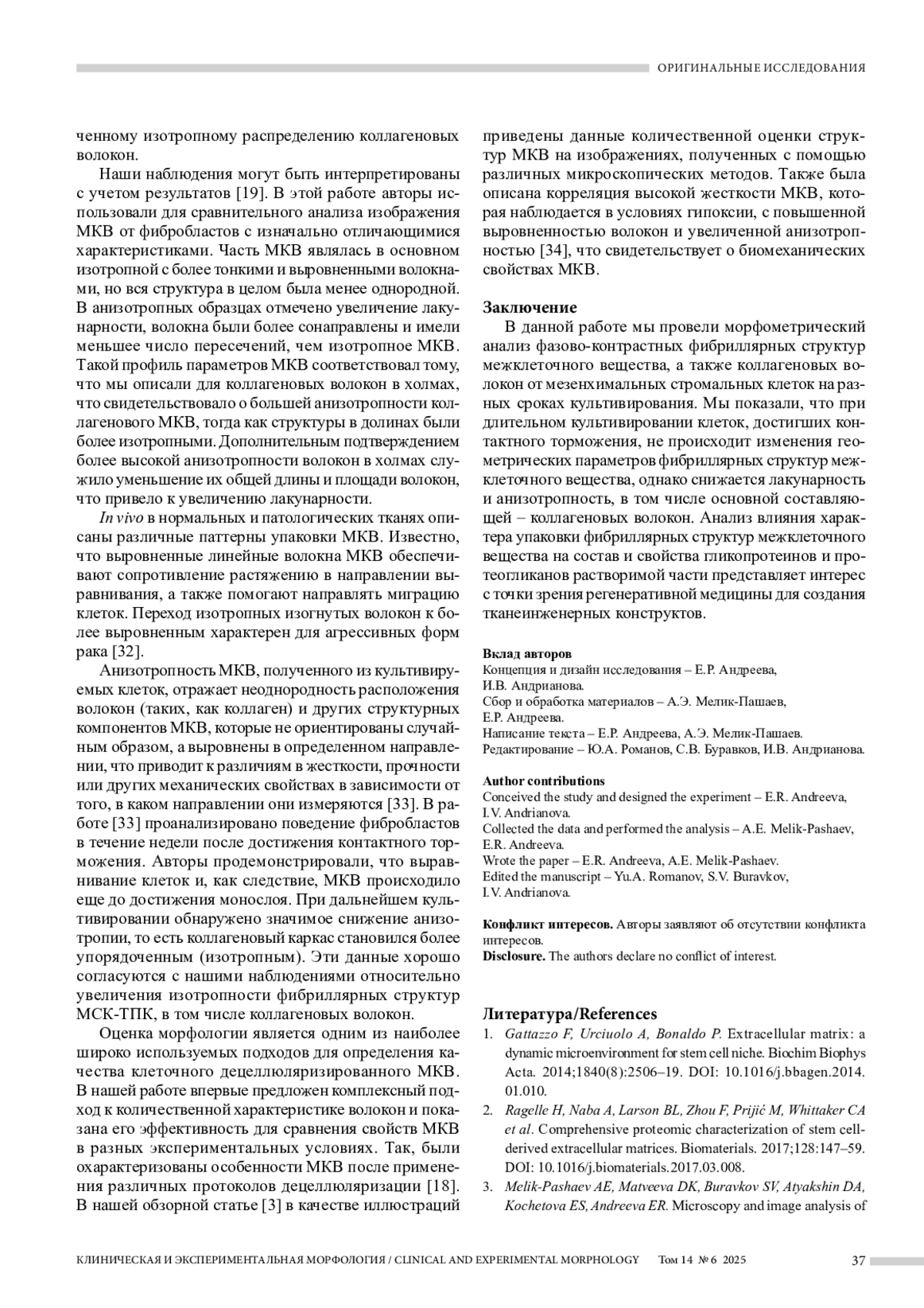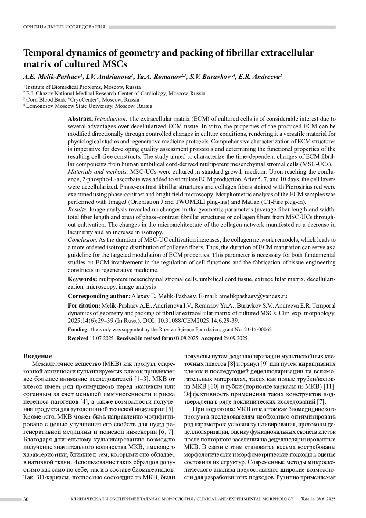 3. Melik-Pashaev AE, Matveeva DK, Buravkov SV, Atyakshin DA, Kochetova ES, Andreeva ER. Microscopy and image analysis of cell-derived decellularized extracellular matrix. Cell Tiss Biol. 2025;19:33-47. DOI: 10.1134/S1990519X25010043.