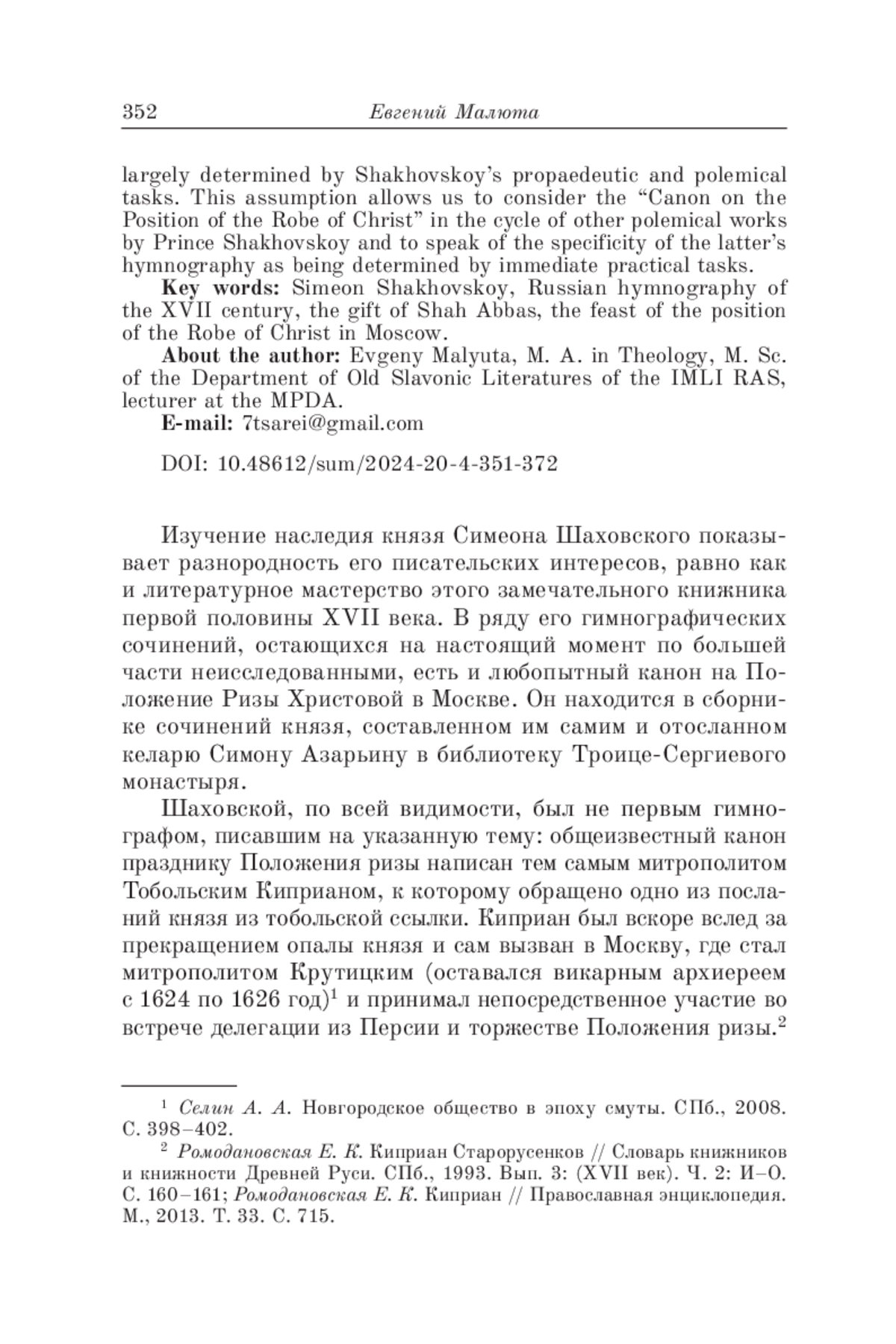 Ключевые фразы: симеон шаховской, русская гимнография xvii века, дар шаха аббаса, праздник положения ризы христа в москве