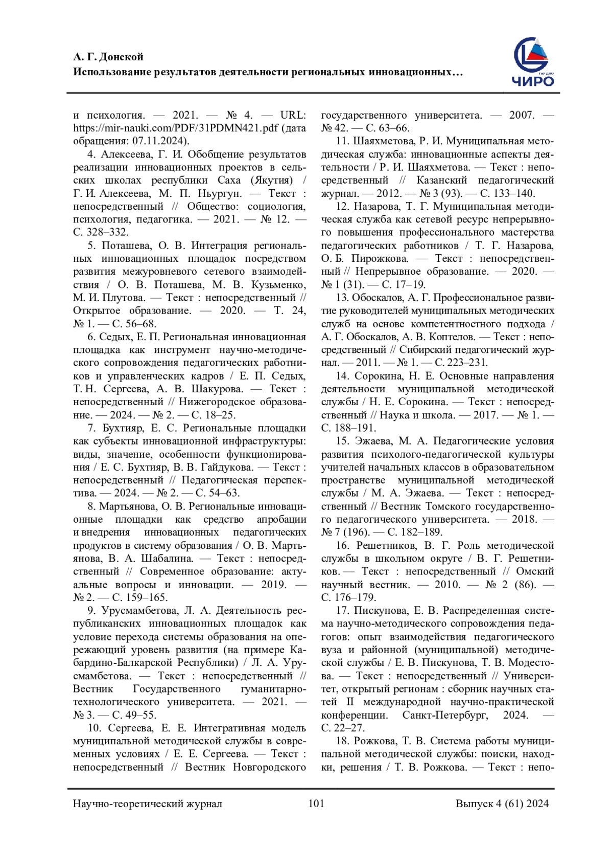 6. Седых, Е. П. Региональная инновационная площадка как инструмент научно-методического сопровождения педагогических работников и управленческих кадров / Е. П. Седых, Т. Н. Сергеева, А. В. Шакурова. - Текст: непосредственный // Нижегородское образование. - 2024. - № 2. - С. 18-25. EDN: NJXRTA