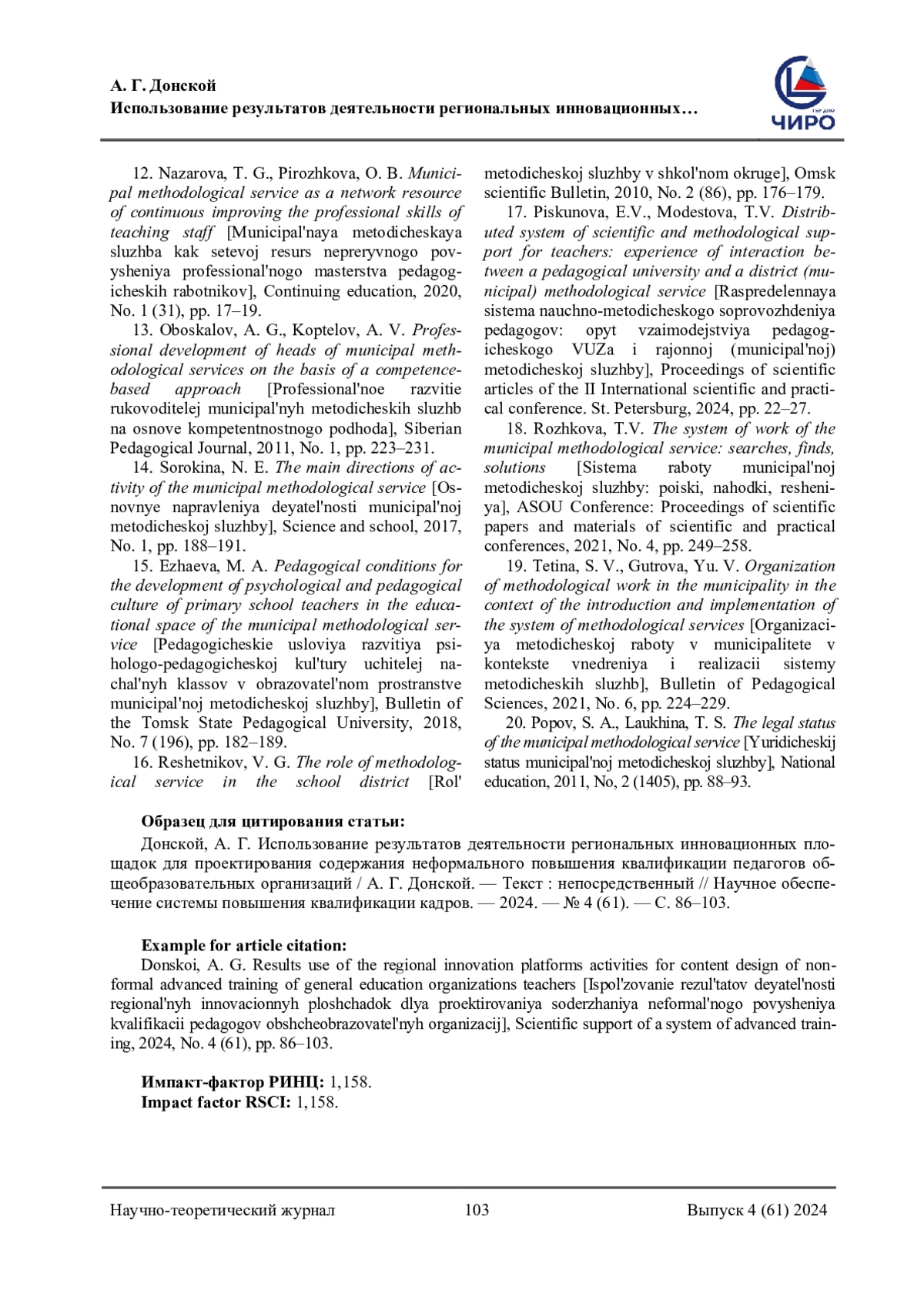 12. Назарова, Т. Г. Муниципальная методическая служба как сетевой ресурс непрерывного повышения профессионального мастерства педагогических работников / Т. Г. Назарова, О. Б. Пирожкова. - Текст: непосредственный // Непрерывное образование. - 2020. - № 1 (31). - С. 17-19.