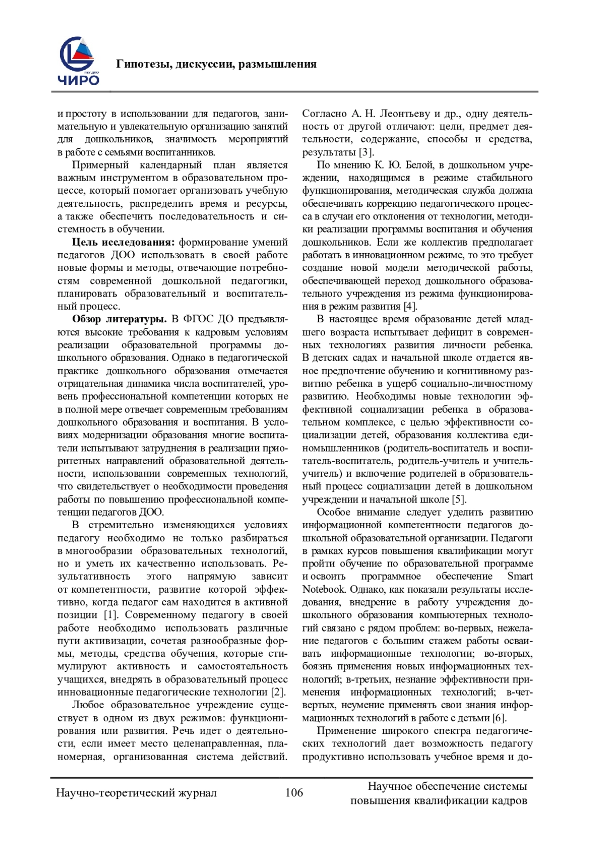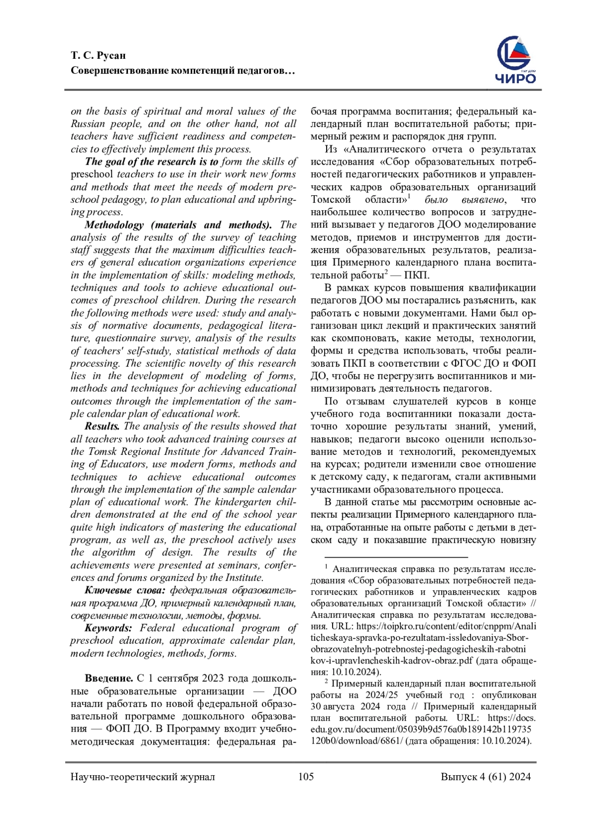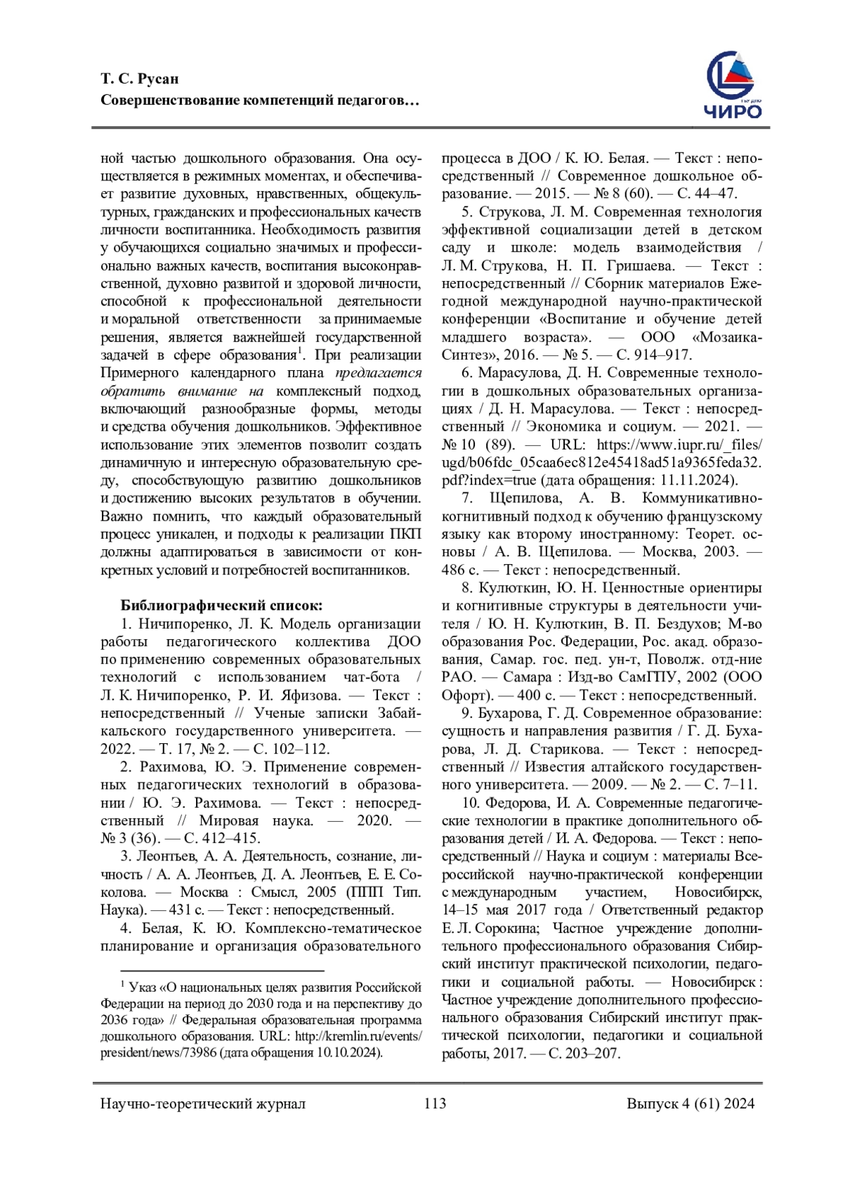 РУСАН Т.С. СОВЕРШЕНСТВОВАНИЕ КОМПЕТЕНЦИЙ ПЕДАГОГОВ ДОШКОЛЬНЫХ ОБРАЗОВАТЕЛЬНЫХ УЧРЕЖДЕНИЙ В ИСПОЛЬЗОВАНИИ СОВРЕМЕННЫХ ОБРАЗОВАТЕЛЬНЫХ ТЕХНОЛОГИЙ // НАУЧНОЕ ОБЕСПЕЧЕНИЕ СИСТЕМЫ ПОВЫШЕНИЯ КВАЛИФИКАЦИИ КАДРОВ. 2024. № 4 (61)