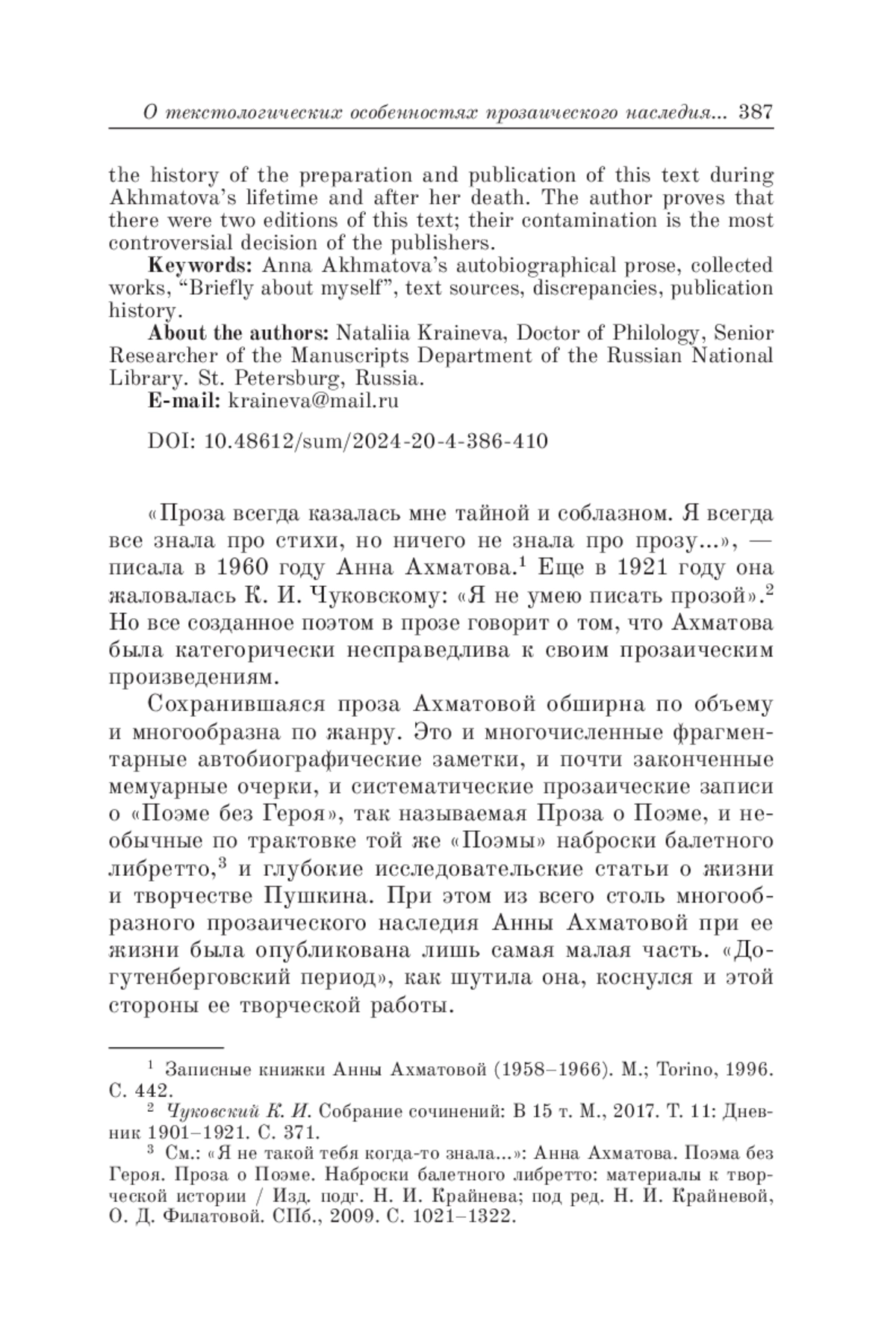 «Проза всегда казалась мне тайной и соблазном. Я всегда все знала про стихи, но ничего не знала про прозу…», — писала в 1960 году Анна Ахматова.1 Еще в 1921 году она жаловалась К. И. Чуковскому: «Я не умею писать прозой».2 Но все созданное поэтом в прозе говорит о том, что Ахматова была категорически несправедлива к своим прозаическим произведениям.
