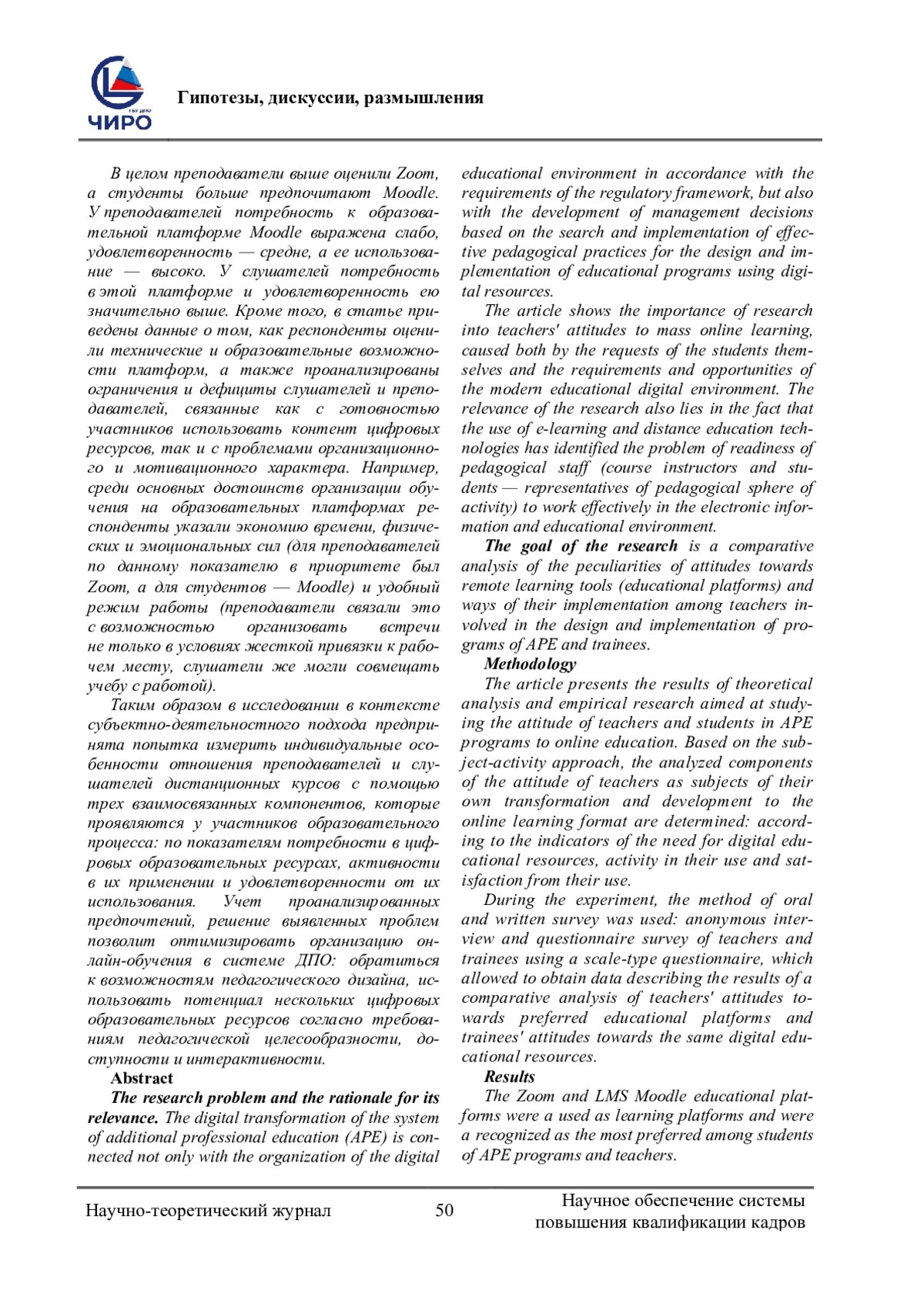 Проблема исследования и обоснование ее актуальности. Цифровая трансформация системы дополнительного профессионального образования (ДПО) связана не только с организацией цифровой образовательной среды согласно требованиям нормативно-правовой базы, но и с выработкой управленческих решений на основе поиска и внедрения эффективных педагогических практик проектирования и реализации образовательных программ с использованием цифровых ресурсов. В статье показана важность исследования отношения педагогов к массовому онлайн-обучению, вызванному как запросами самих слушателей, так и требованиями и возможностями современной образовательной цифровой среды. Актуальность исследования состоит и в том, что использование электронного обучения и дистанционных образовательных технологий обозначили проблему готовности педагогических работников (преподавателей курсов и слушателей - представителей педагогической сферы деятельности) к эффективной работе в электронной информационно-образовательной среде. Цель исследования Целью исследования является сравнительный анализ особенностей отношения к средствам удаленного обучения (образовательным платформам) и способам их реализации у преподавателей, участвующих в проектировании и реализации программ ДПО, и слушателей. Методология (материалы и методы) В статье приведены результаты теоретического анализа и эмпирического исследования, направленного на изучение отношения преподавателей и обучающихся по программам ДПО к онлайн-образованию. На основе субъектно-деятельностного подхода определены анализируемые компоненты отношения педагогов как субъектов собственного преобразования и развития к онлайн-формату обучения: по показателям потребности в цифровых образовательных ресурсах, активности в их применении и удовлетворенности от их использования. В ходе эксперимента применялся метод устного и письменного опроса: анонимного интервью и анкетирования преподавателей и слушателей с помощью анкеты шкального типа, что позволило получить данные, описывающие результаты сравнительного анализа отношения преподавателей к предпочитаемым образовательным платформам и отношения слушателей к этим же цифровым образовательным ресурсам. Результаты Образовательные платформы Zoom и LMS Moodle, используемые в качестве обучающих платформ, были признаны наиболее предпочитаемыми среди слушателей программ ДПО и преподавателей. В целом преподаватели выше оценили Zoom, а студенты больше предпочитают Moodle. У преподавателей потребность к образовательной платформе Moodle выражена слабо, удовлетворенность - средне, а ее использование - высоко. У слушателей потребность в этой платформе и удовлетворенность ею значительно выше. Кроме того, в статье приведены данные о том, как респонденты оценили технические и образовательные возможности платформ, а также проанализированы ограничения и дефициты слушателей и преподавателей, связанные как с готовностью участников использовать контент цифровых ресурсов, так и с проблемами организационного и мотивационного характера. Например, среди основных достоинств организации обучения на образовательных платформах респонденты указали экономию времени, физических и эмоциональных сил (для преподавателей по данному показателю в приоритете был Zoom, а для студе