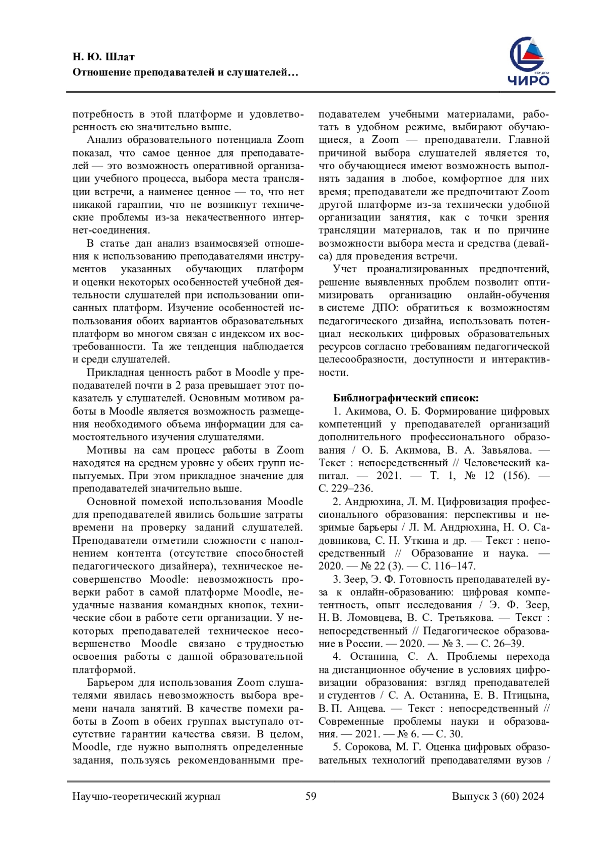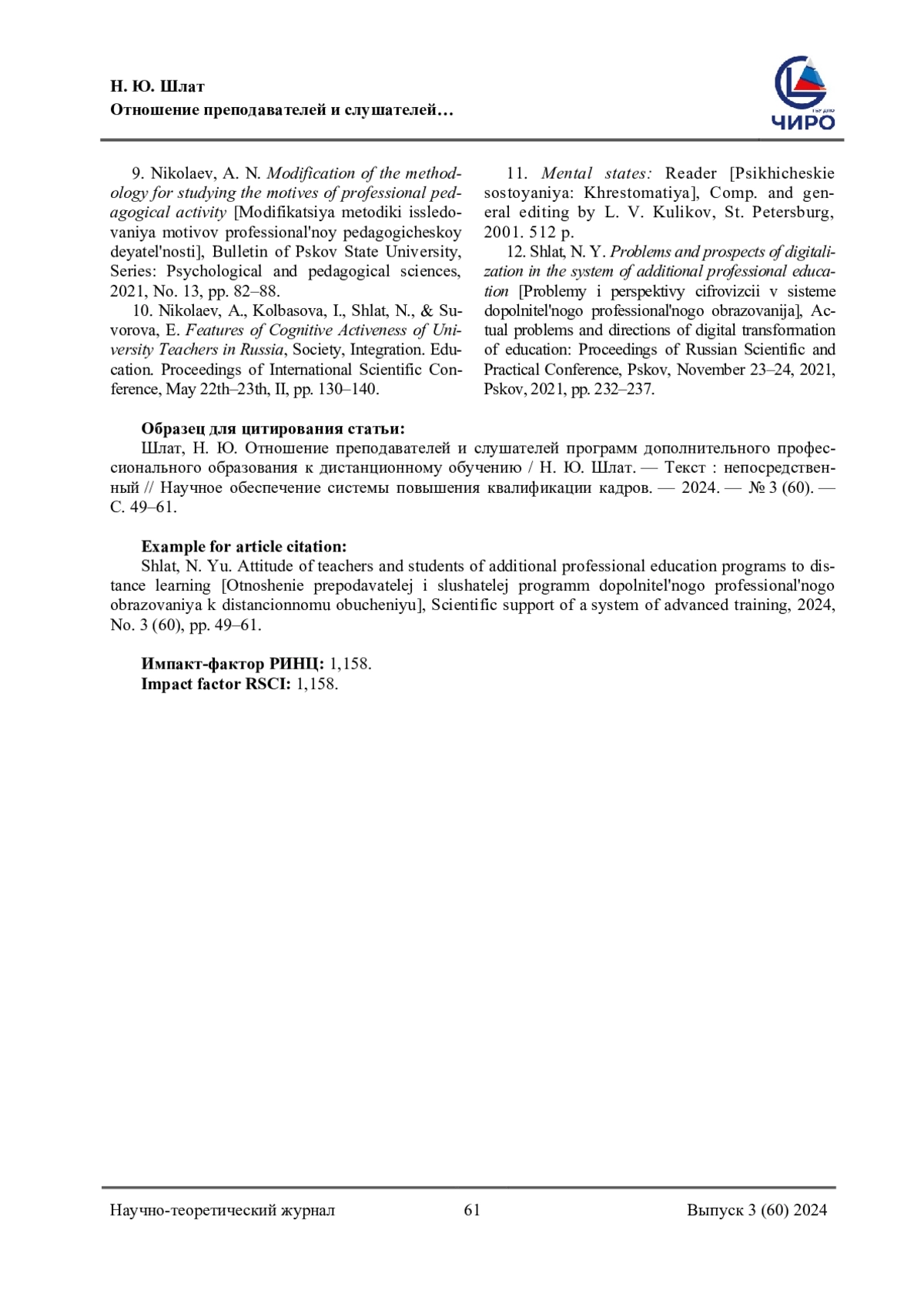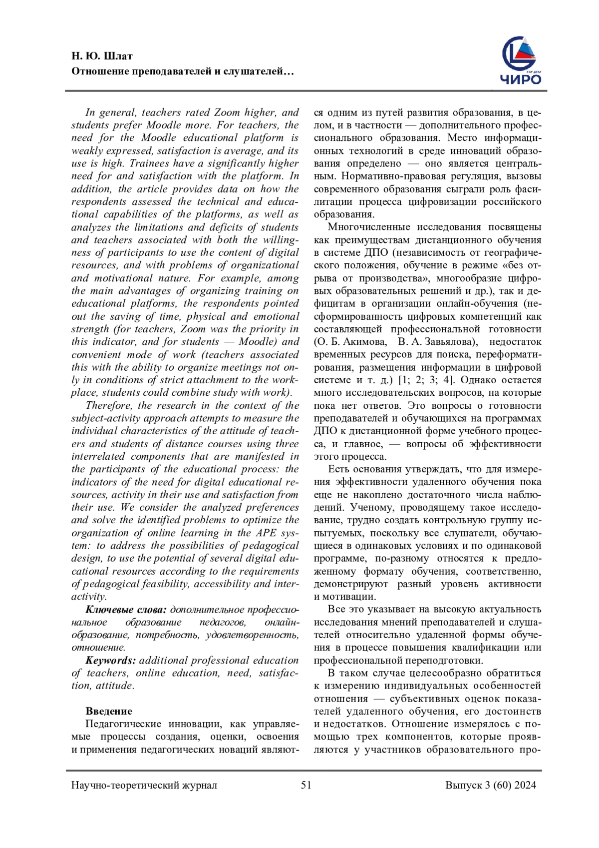 ШЛАТ Н. Ю. ОТНОШЕНИЕ ПРЕПОДАВАТЕЛЕЙ И СЛУШАТЕЛЕЙ ПРОГРАММ ДОПОЛНИТЕЛЬНОГО ПРОФЕССИОНАЛЬНОГО ОБРАЗОВАНИЯ К ДИСТАНЦИОННОМУ ОБУЧЕНИЮ // НАУЧНОЕ ОБЕСПЕЧЕНИЕ СИСТЕМЫ ПОВЫШЕНИЯ КВАЛИФИКАЦИИ КАДРОВ. 2024. № 3 (60)