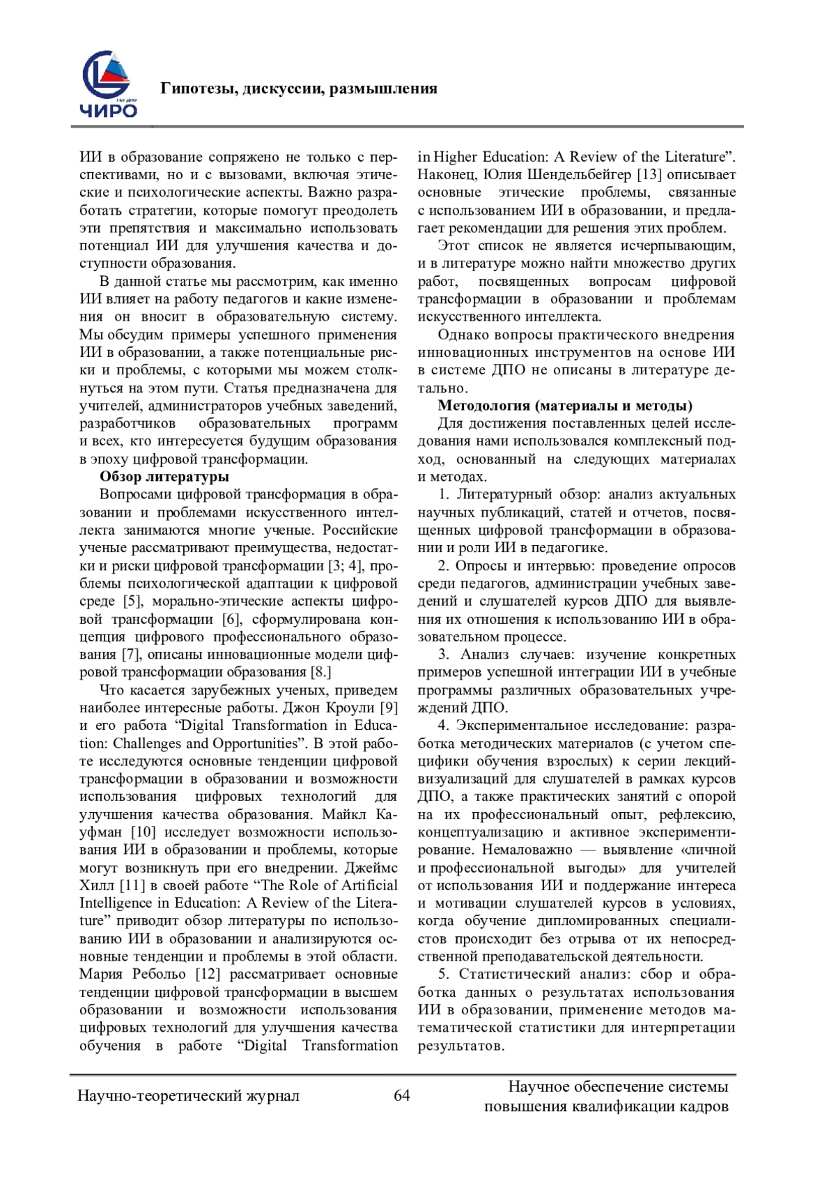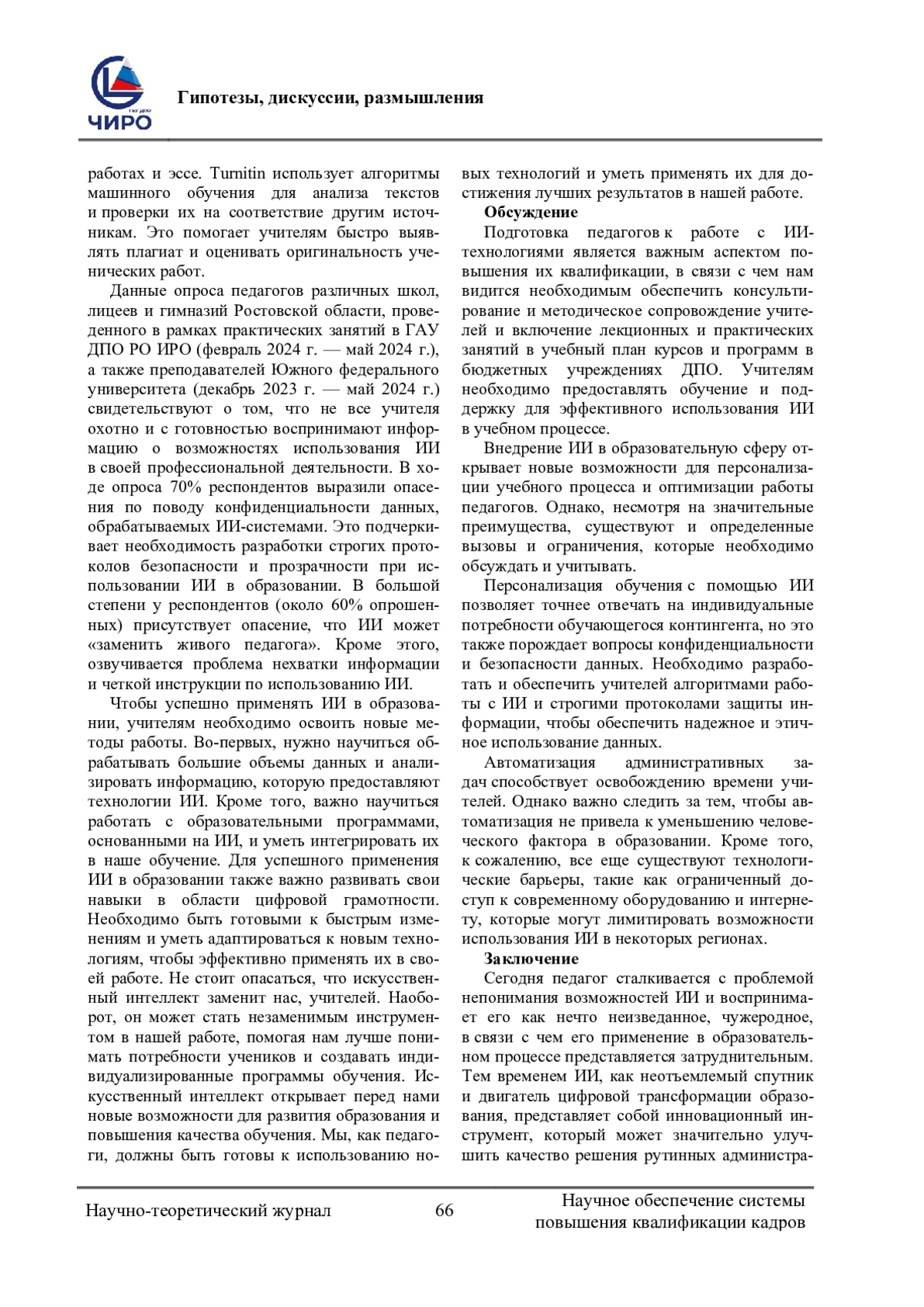 Проблема исследования, обоснование ее актуальности. В работе исследуется роль искусственного интеллекта (ИИ) в трансформации образовательной сферы. Автор раскрывает возможности совершенствования методов преподавания с помощью ИИ. Особое внимание уделяется использованию ИИ для дифференциации и индивидуализации обучения, автоматизации рутинных административных задач. Статья обосновывает необходимость внедрения и освещения данной темы в рамках курсов повышения квалификации педагогических кадров. Исследование направлено на выявление потенциала и проблем, связанных с интеграцией ИИ в образование, и разработку стратегий для его эффективного применения. Актуальность данной темы обусловлена необходимостью подготовки педагогических кадров в системе ДПО к новым образовательным реалиям. Исследование направлено на выявление возможностей использования ИИ в работе педагога. Цель исследования. Основной целью данного исследования является анализ влияния цифровой трансформации на образовательный процесс и обсуждение роли и потенциала ИИ с возможностью дальнейшей диссеминации описанного автором опыта среди дипломированных специалистов через семинары, вебинары, лекции и практические занятия в рамках курсов повышения квалификации учителей в системе ДПО. Методология исследования (материалы и методы) Для достижения поставленных целей исследования использовался комплексный подход, основанный на следующих материалах и методах: литературный обзор, опросы и интервью, анализ случаев (case study), экспериментальное исследование, статистический анализ и оценка полученных результатов. Результаты Научная новизна исследования заключается в анализе теоретической модели и концепции, связанной с использованием ИИ в образовании и обсуждении роли ИИ в изменении и оптимизации работы педагогов и образовательного процесса в целом. Описано влияние и роль цифровой трансформации в управлении образовательным процессом и преподавательской деятельностью. Рассмотрены вопросы безопасности и конфиденциальности данных и потенциальное неправомерное использование ИИ в образовании. Определены будущие возможные тенденции развития ИИ. Разработаны методические рекомендации по использованию ИИ для обсуждения и внедрения на курсах повышения квалификации учителей Ростовской области, реализуемых в системе ДПО, а также на семинарах и вебинарах, организуемых Институтом развития образования (ГАУ ДПО РО ИРО). В практическом плане статья предлагает рекомендации для педагогов и администраторов образовательных учреждений по использованию ИИ в своей работе, что способствует повышению квалификации дипломированных специалистов и их плавной адаптации к трансформирующейся цифровой среде.