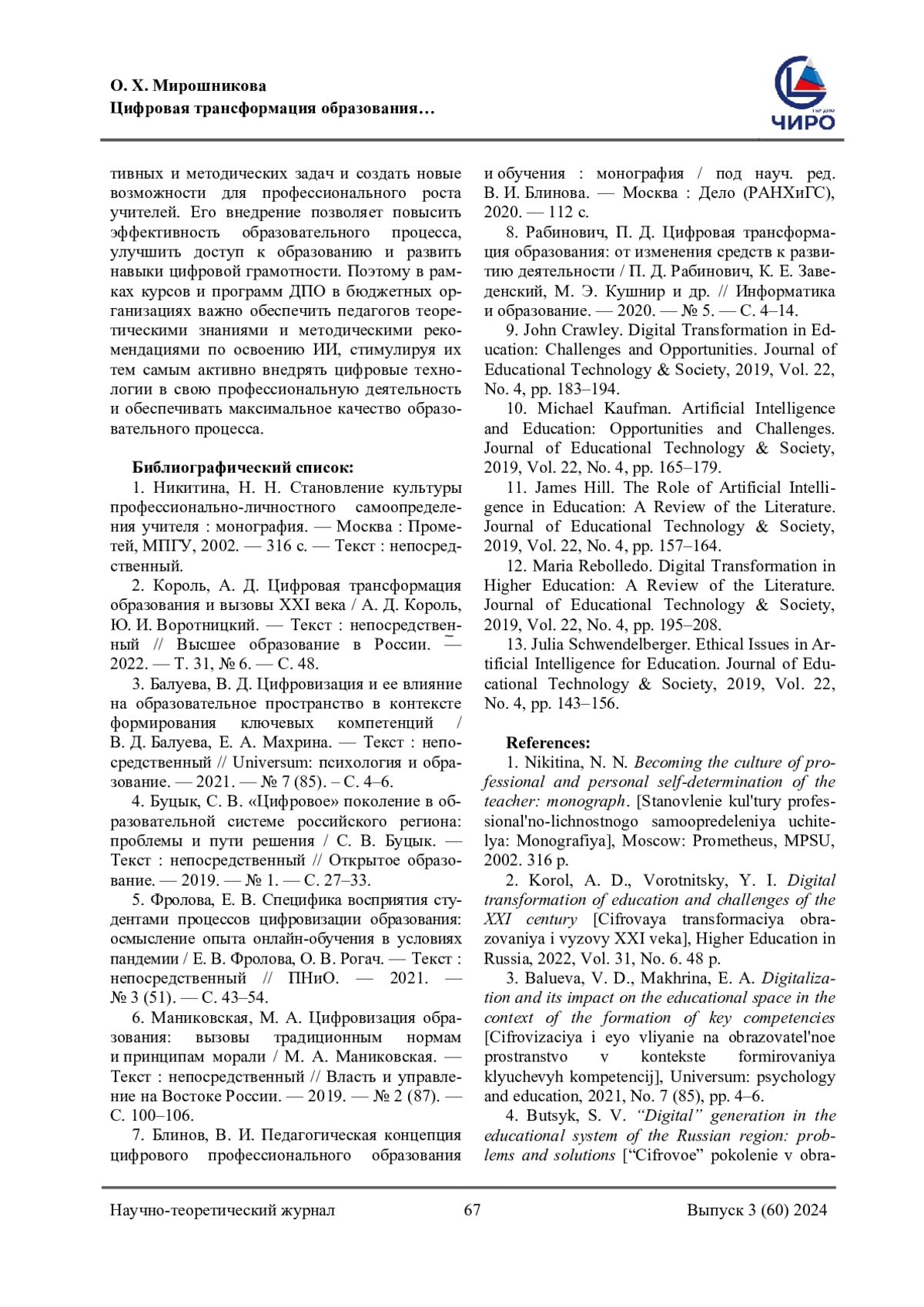2. Король, А. Д. Цифровая трансформация образования и вызовы XXI века / А. Д. Король, Ю. И. Воротницкий. - Текст: непосредственный // Высшее образование в России. - 2022. - Т. 31, № 6. - С. 48. EDN: SXEPBK