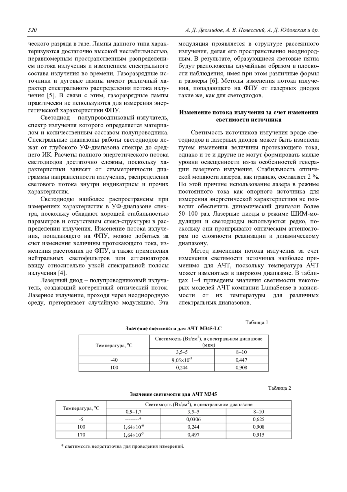 Деомидов А. Д., Полесский А. В., Юдовская А. Д., Андосов А. И., Соляков В. Н. Аналитическое сравнение методов измерений энергетической характеристики чувствительности и динамического диапазона 518