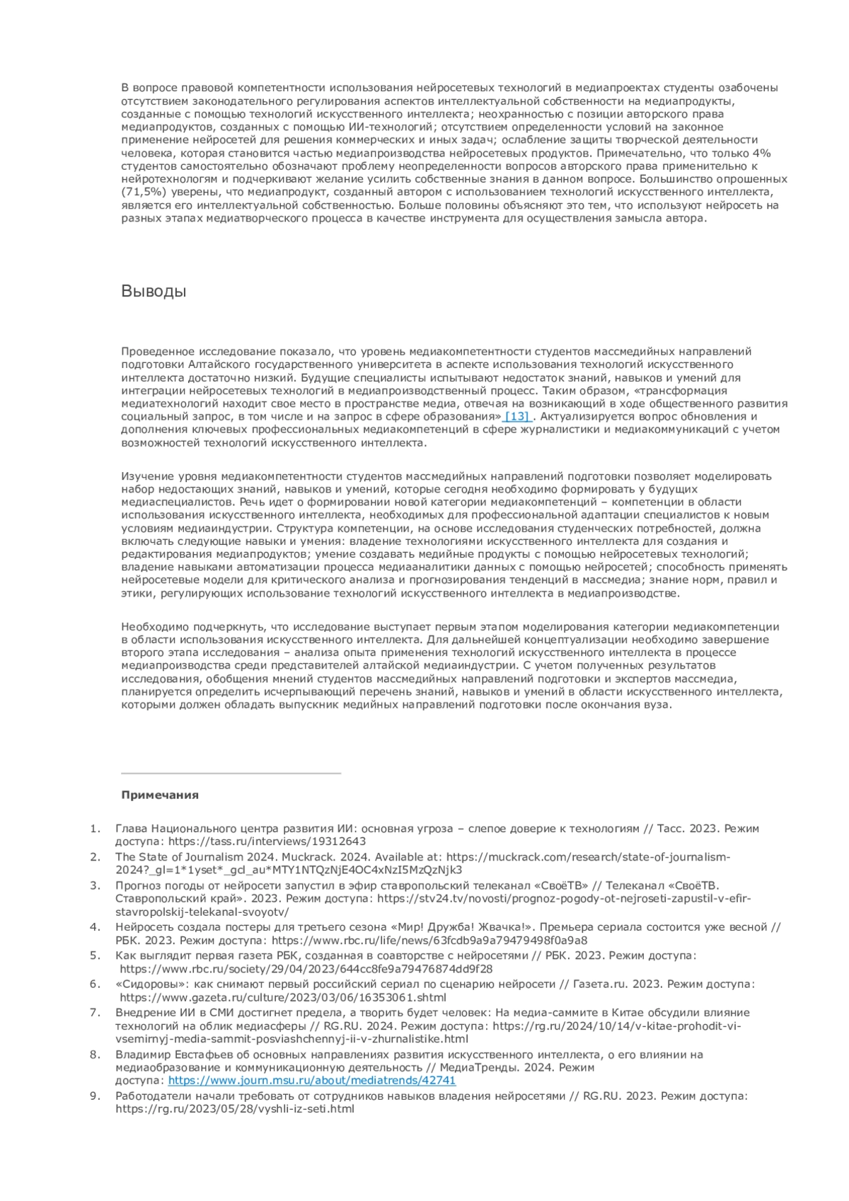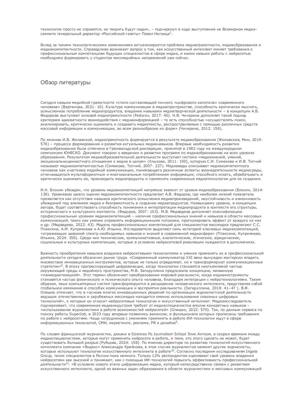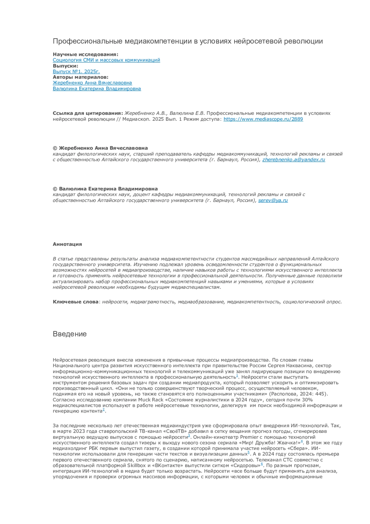 ЖЕРЕБНЕНКО А. В., ВАЛЮЛИНА Е. В. ПРОФЕССИОНАЛЬНЫЕ МЕДИАКОМПЕТЕНЦИИ В УСЛОВИЯХ НЕЙРОСЕТЕВОЙ РЕВОЛЮЦИИ // МЕДИАСКОП. 2025. № 1