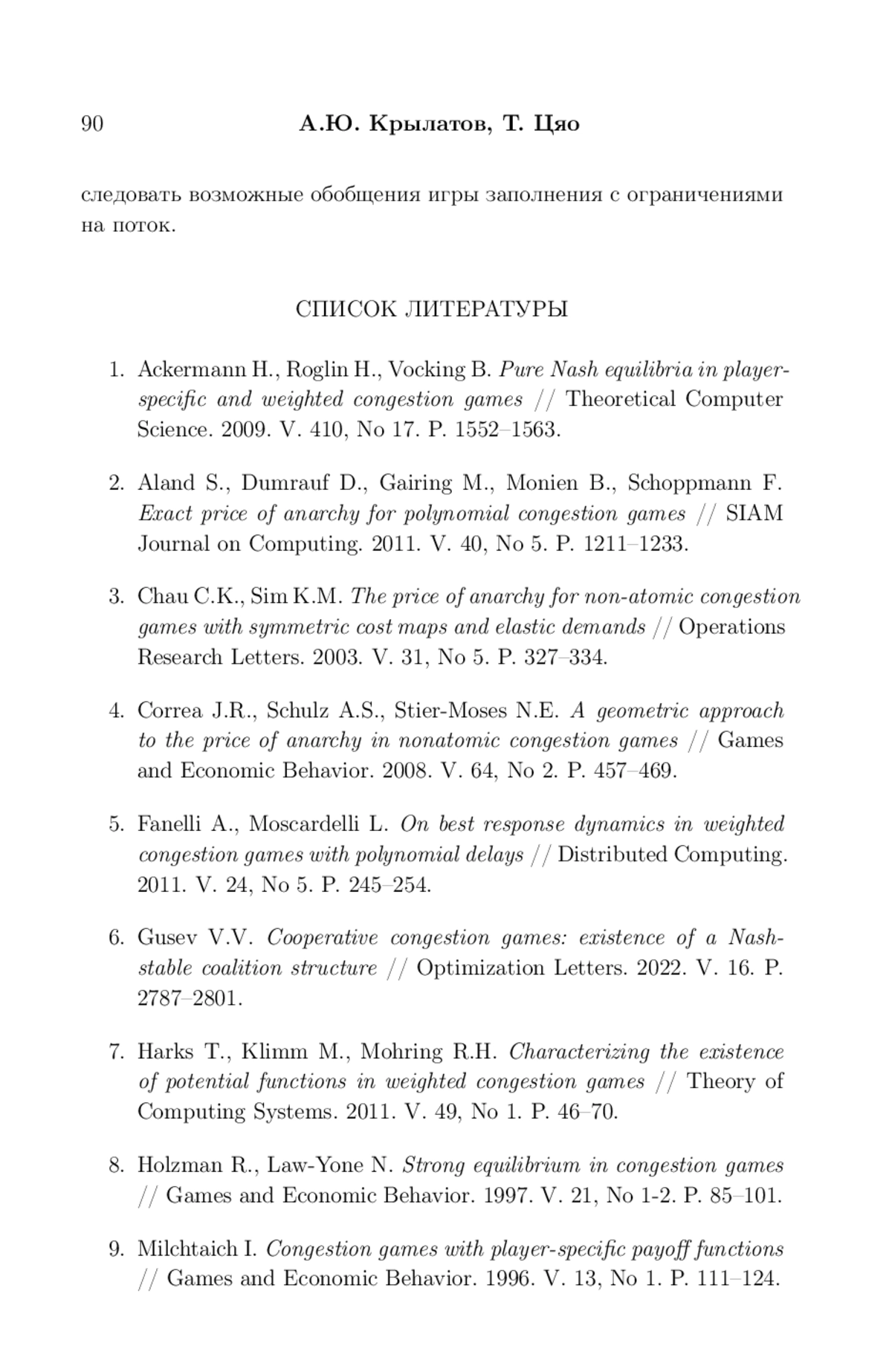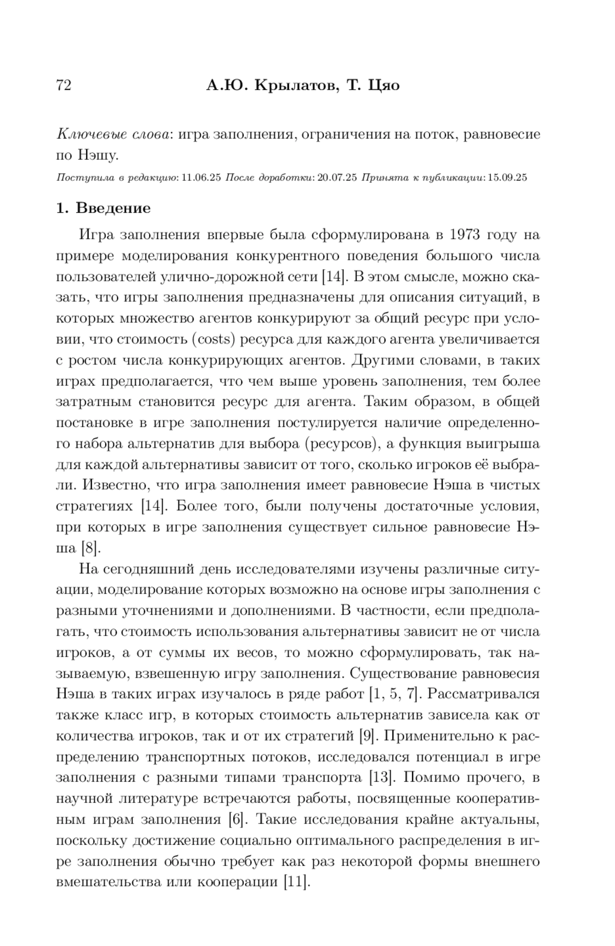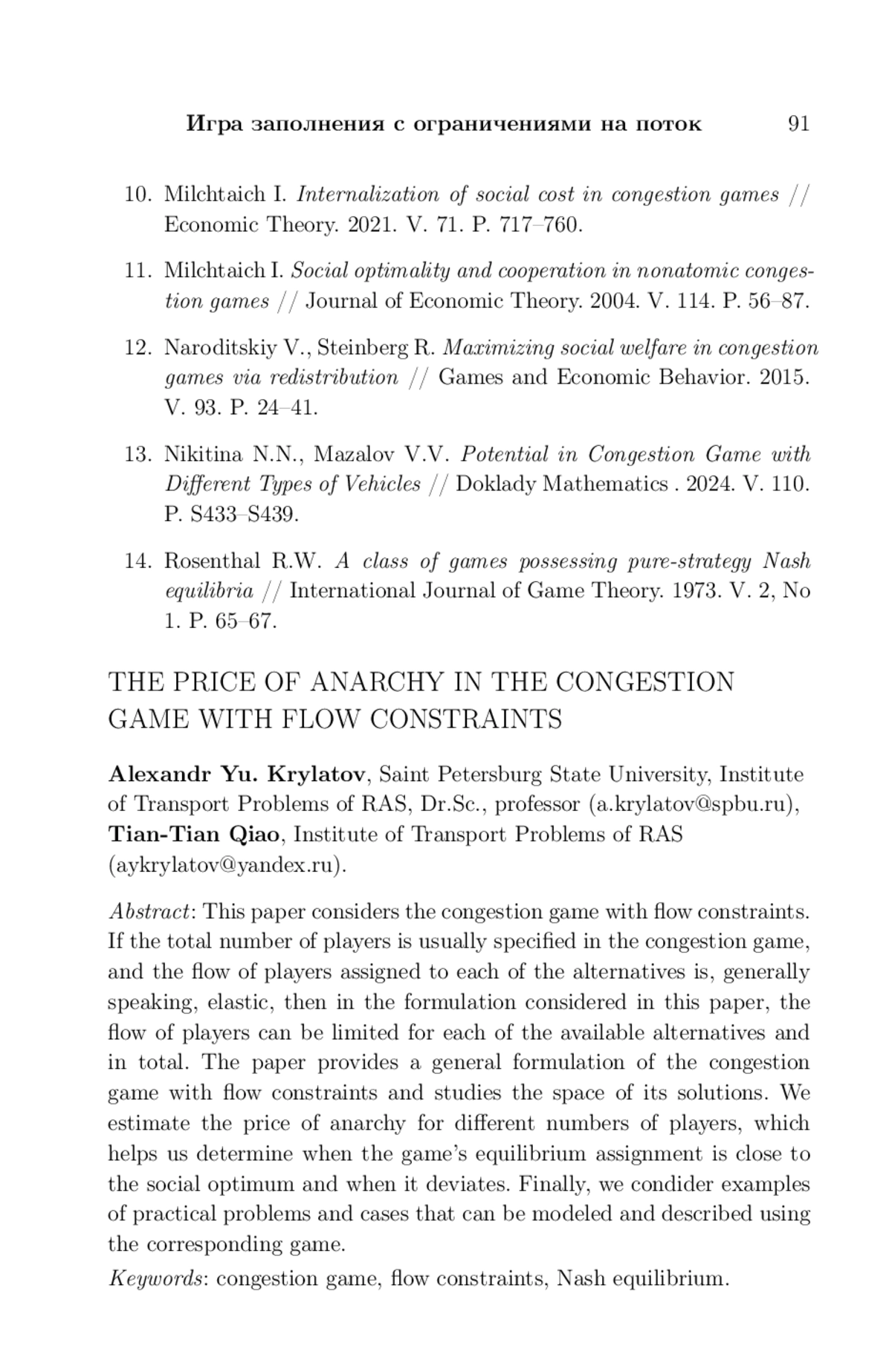 КРЫЛАТОВ А. Ю., ЦЯО Т. ЦЕНА АНАРХИИ В ИГРЕ ЗАПОЛНЕНИЯ С ОГРАНИЧЕНИЯМИ НА ПОТОК // МАТЕМАТИЧЕСКАЯ ТЕОРИЯ ИГР И ЕЕ ПРИЛОЖЕНИЯ. 2025. № 3, ТОМ 17